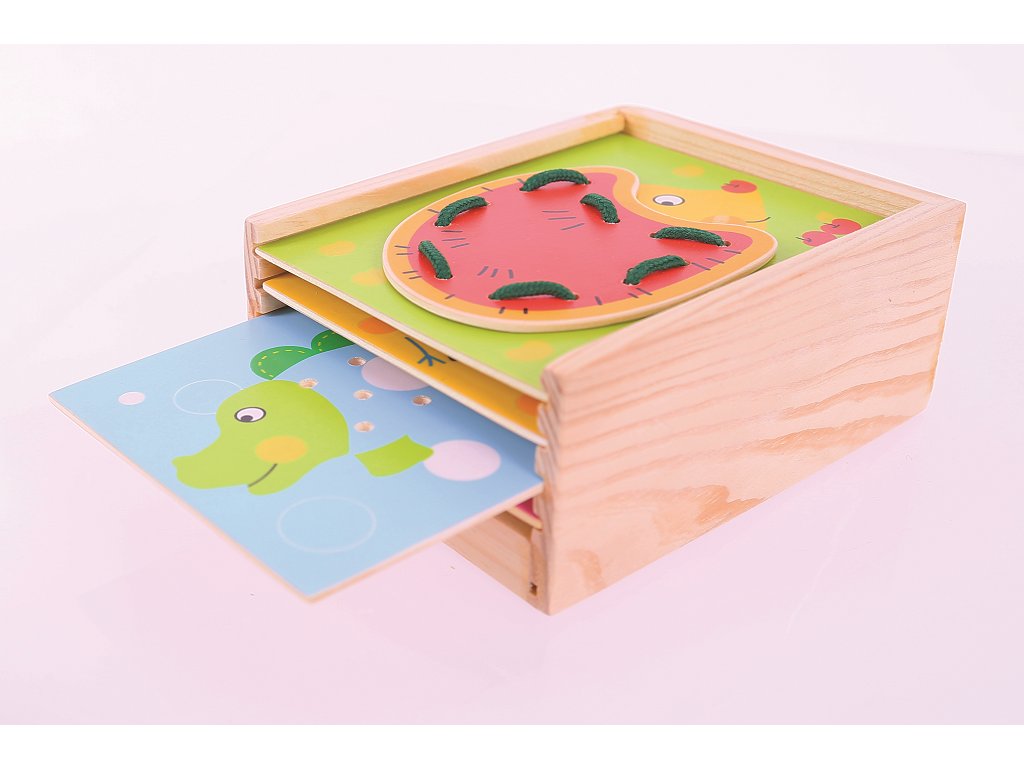 Jedinečný způsob, jak se bavit a zároveň učit nové dovednosti. Každé z těchto zvířat je třeba spojit provlečením tkaničkou. Všechny pestrobarevné desky a tkaničky lze uložit do přenosné dřevěné krabice. Obsahuje osm dřevěných hracích dílků a sedm tkaniček. Hlavní vlastnosti: pomáhá rozvíjet obratnost a koncentracivyrobeno z vysoce kvalitních materiálů, které pocházejí ze zodpovědných zdrojů vyhovuje současným evropským bezpečnostním normám