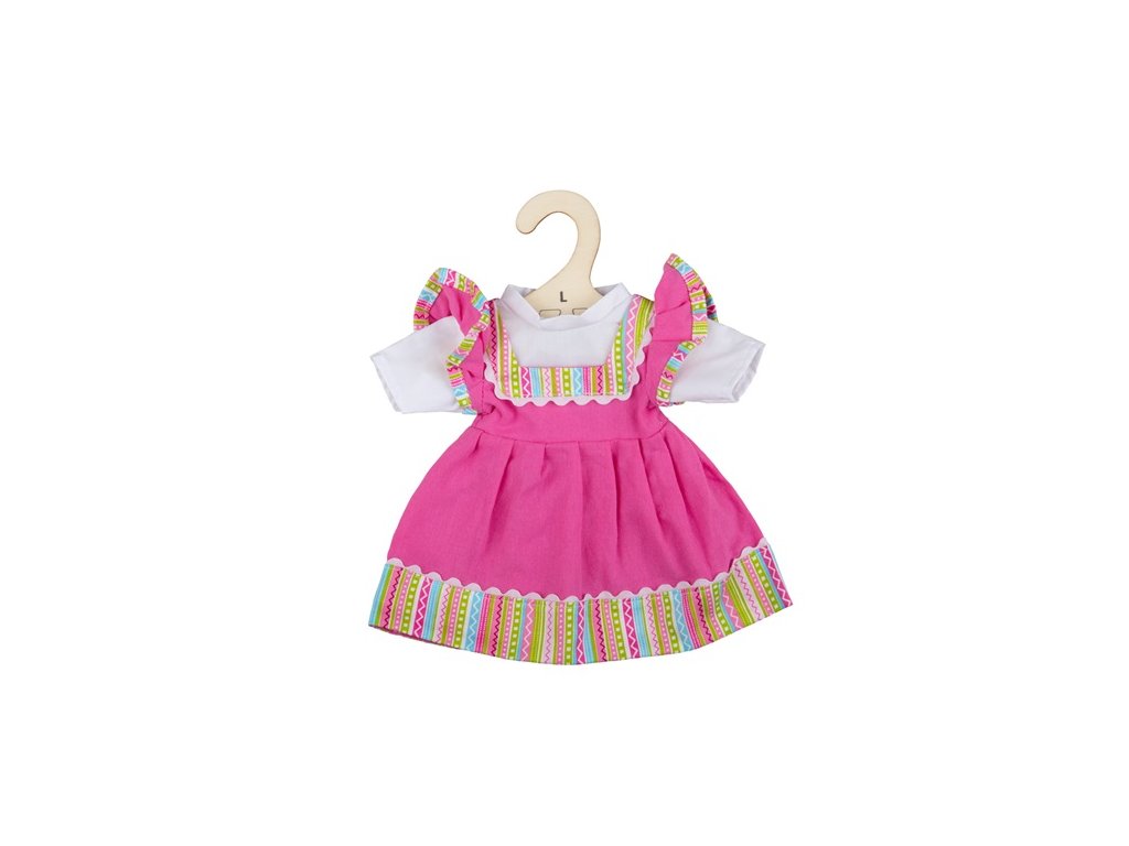Růžové šaty s pruhovaným lemováním. Šaty lze obléci na panenky velikosti 38cm. Součástí balení je také věšáček. Hlavní vlastnosti: vhodné pro panenky o velikosti 38 cmtrénuje motoriku hravou formouvčetně věšáčku
