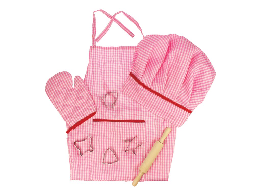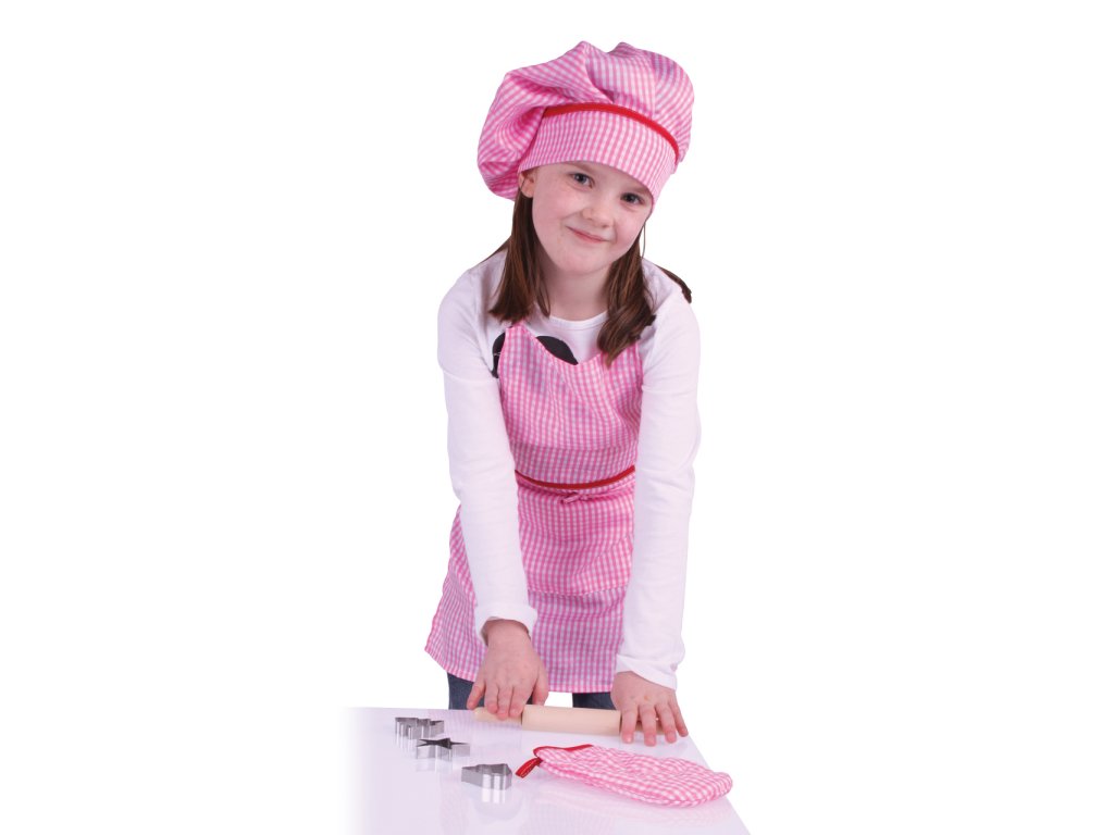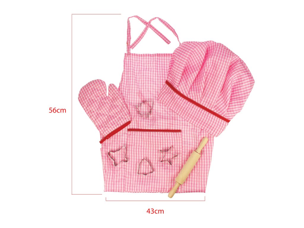 Mladí kuchaři/ky budou milovat tuto světlou a pěkně růžovou bavlněnou sadu k pečení nebo vaření, která obsahuje zástěru, chňapku, kuchařskou čepici, váleček a vykrajovátka. Ideální pro použití v asistovaném vaření nebo pečení, nebo pro použití v našem dřevěném kuchyňském sortimentu jako součást hracích rolí, které si vaše dítě jistě rádo ztvární.V naší nabídce je set k dispozici také v modré barvě zde. Součástí balení je vše dle obrázku. Hlavní vlastnosti: čepice: zapínání na suchý zip, obvod cca 47-51 cmrukavice: délka 17 cmzástěrka: délka: bez šňůrek 56 cm + šňůrky 29 cm, šířka 46 cm + každá šňůrka 42 cm