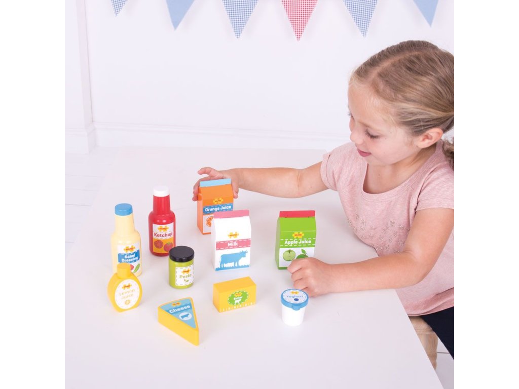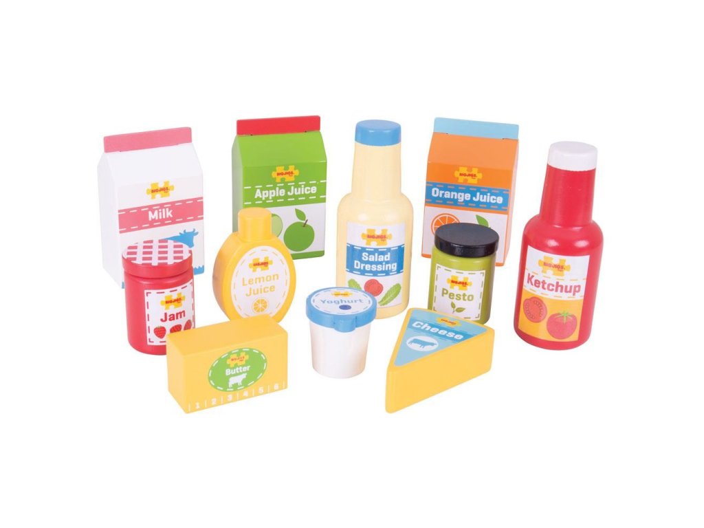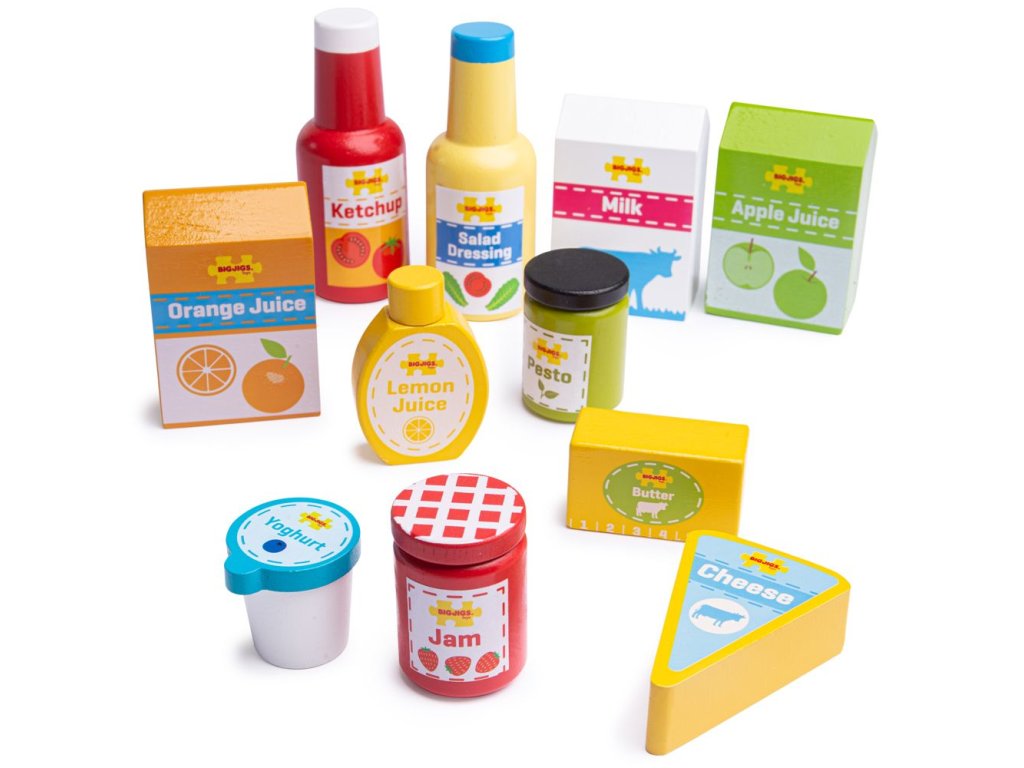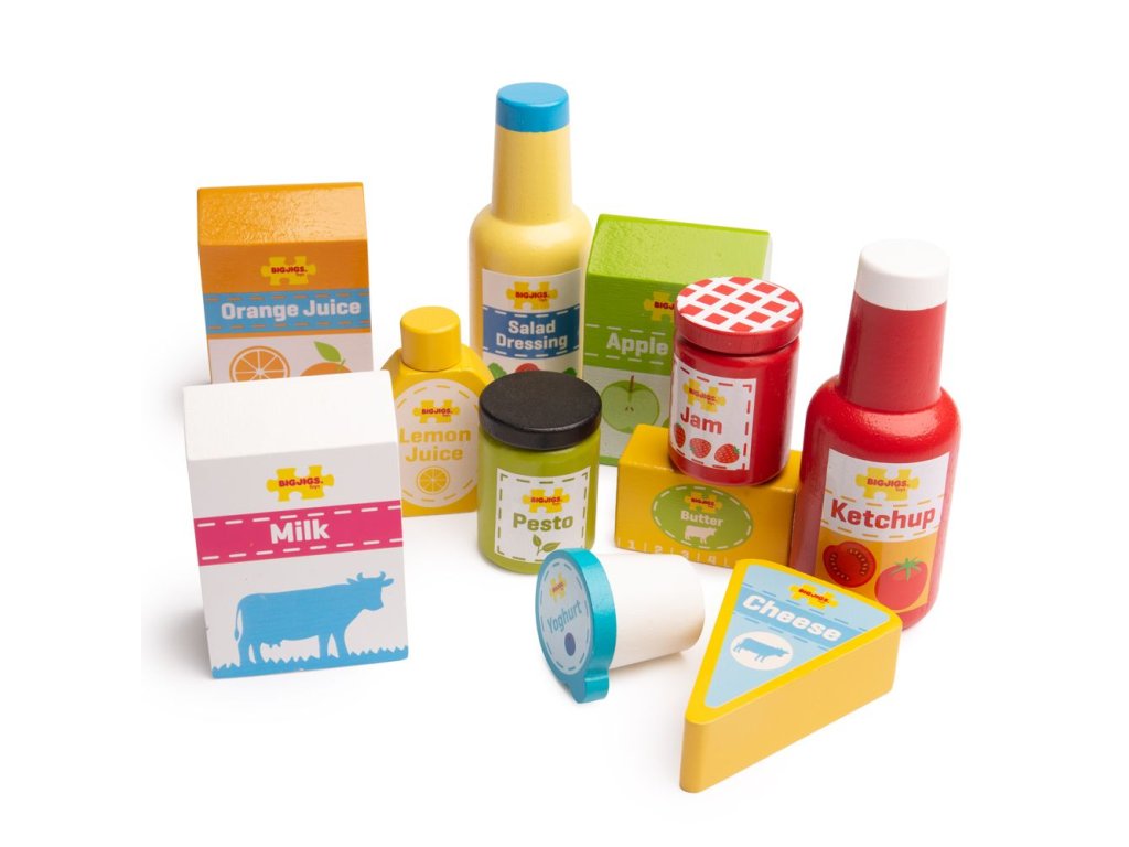 Oživte kuchyňku nebo obchůdek s touto dřevěnou sadou potravin. Sada obsahuje 11 ks základních trvanlivých potravin včetně jablečného džemu, másla, sýru, pesta, kečupu, citronové šťávy a dalších. BigJigs je velký fanoušek zdravé výživy a jaká by byla lepší cesta učit děti o zdravé výživě, než pomocí hraček z našeho sortimentu? Dřevěné hrací jídlo je ideální k tomu, aby se vaše dítě dozvědělo o důležitosti zdravé a vyvážené stravy. A také o tom, odkud naše jídlo pochází a jak ho připravujeme. Hlavní vlastnosti: zlepšuje koordinaci dětí a inspiruje k hraní v různých rolíchvyrobeno z vysoce kvalitních, zodpovědně dodávaných materiálůodpovídá současným evropským bezpečnostním normámobsahuje 11 dílů