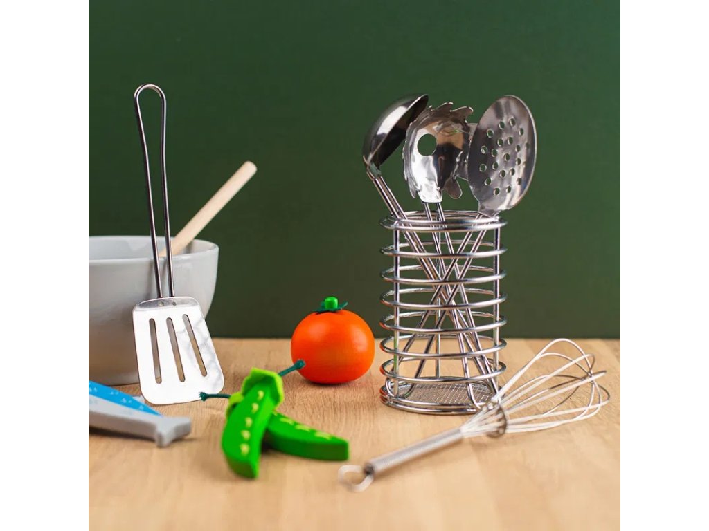 Za pomoci sady kuchyňského náčiní bude vaření a pečení hračkou! Sada určená pro malé kuchaře a kuchařky obsahuje šest náčiní pro děti včetně obracečky, děrované lžíce, naběračky, šlehací metly, naběračky na špagety a vařečky, uložené v praktické válcové nádobě. Děti mohou šlehat, míchat a servírovat a vyzkoušejí si různé kuchyňské činnosti a podpoří tak svou kreativitu. Hraní na role je skvělý způsob, jak rozvíjet sociální inteligenci, jazykové schopnosti, kreativní myšlení a komunikační dovednosti. Manipulace s kuchyňským náčiním zlepšuje jemnou motoriku a koordinaci ruka-oko. Náčiní je vyrobeno z prvotřídních kvalitních materiálů z odpovědných zdrojů a nabarveno netoxickými barvami a laky. Splňuje aktuální evropské bezpečnostní normy. Hlavní vlastnosti: 6 ks kuchyňského náčiní v nádobě: obracečka, děrovaná lžíce, naběračka, šlehací metla, naběračka na špagety a vařečkarozvíjí sociální inteligenci, jazykové schopnosti, kreativní myšlení a komunikační dovednostizlepšuje jemnou motoriku a koordinaci ruka-okopodporuje hraní na rolevyrobeno z vysoce kvalitních materiálůvhodné od 3 let věku
