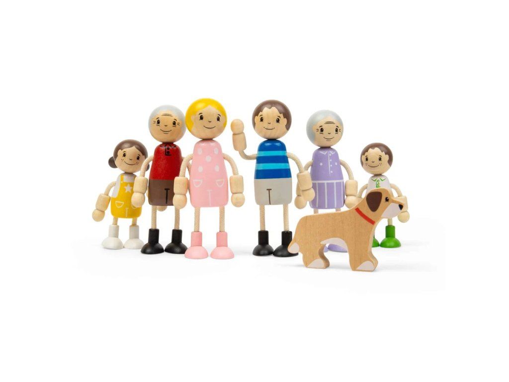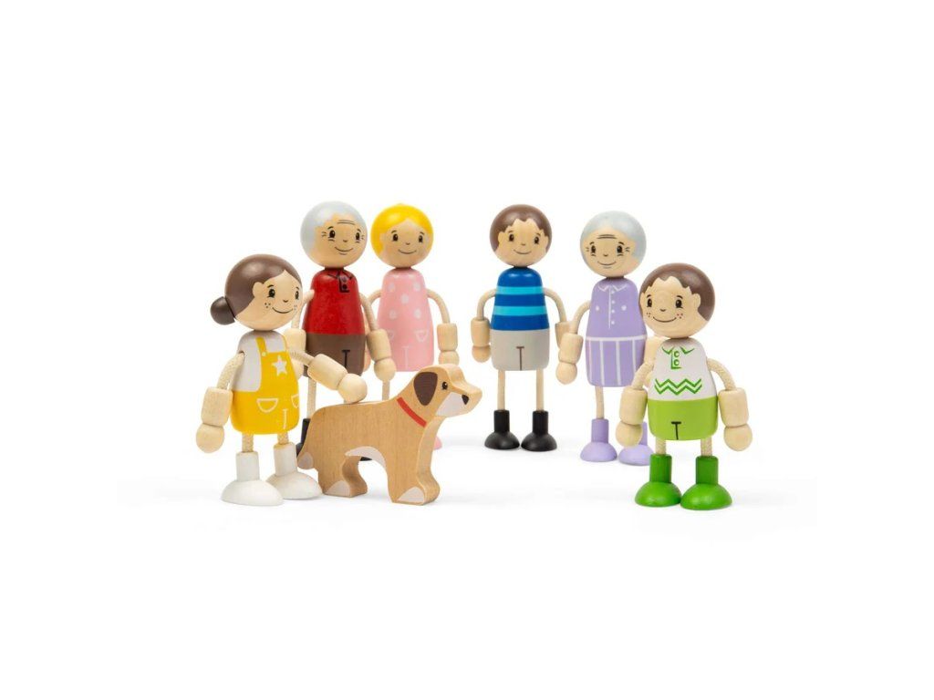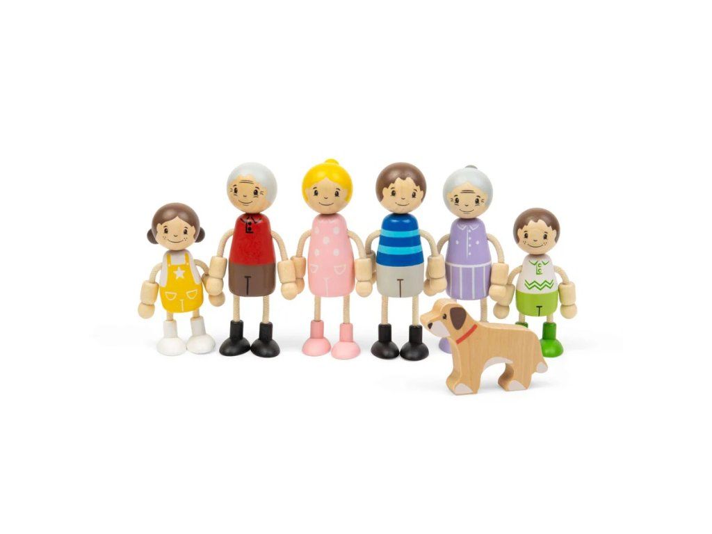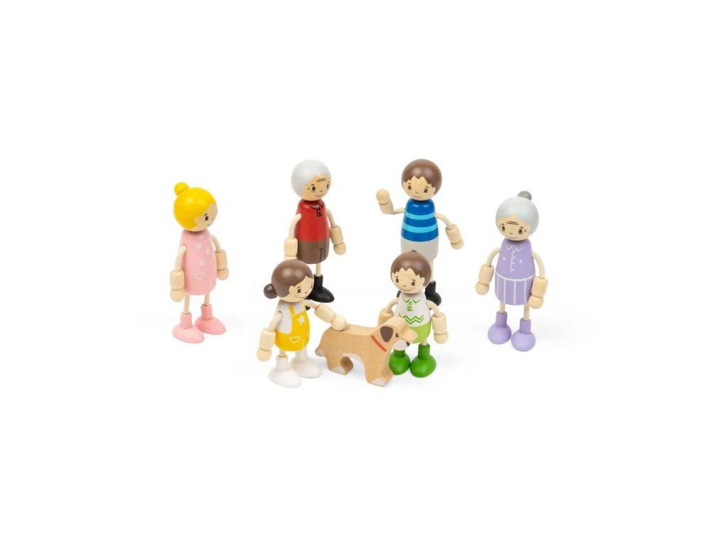 Dodejte domečku pro panenky život s touto roztomilou rodinnou sadou! Tato krásná kolekce dřevěných figurek představuje tři generace - prarodiče, rodiče, dvě děti a věrného rodinného psa. Panenky mají ideální velikost pro malé dětské ručičky, takže se s nimi snadno manipuluje při každodenních herních dobrodružstvích. Každá figurka má ohebné ruce a nohy, díky čemuž může sedět, ležet nebo stát a zapojit se do různých situací v domečku. Vyrobeno z kvalitního FSC® certifikovaného dřeva, které zaručuje odolnost i šetrnost k životnímu prostředí. Díky milým obličejům a barevnému oblečení jsou panenky připravené zabydlet se v jakémkoli domečku pro panenky. Hra s figurkami podporuje rozvoj fantazie, sociálních dovedností i emočního vnímání. Děti si mohou přehrávat každodenní situace, čímž si přirozeně osvojují vztahy a komunikaci. Manipulace s panenkami zároveň rozvíjí jemnou motoriku a koordinaci ruka–oko. Hlavní vlastnosti: sada dřevěných panenek – tři generace rodiny 7 figurek (prarodiče, rodiče, 2 děti) + 1 pes ohebné ruce a nohy pro variabilní hru podporuje kreativitu, sociální a motorický rozvoj vyrobeno z FSC® certifikovaného dřeva vhodné pro děti od 18 měsíců Značka a certifikát FSC® (Forest Stewardship Council) zaručuje, že dřevo, ze kterého byl produkt vyroben, nebylo vytěženo nelegálně a pochází z lesů obhospodařovaných šetrným či přírodě blízkým způsobem, ve kterém jsou dodržovány přísné environmentální a sociální požadavky. Značka FSC® na výrobku znamená, že svým nákupem pomáháte chránit lesy a podporujete šetrné, odpovědné či přírodě blízké hospodaření, díky kterému jsou naše lesy stabilnější, zdravější, mají přirozenou druhovou skladbu a lépe odolávají negativním následkům klimatických změn.