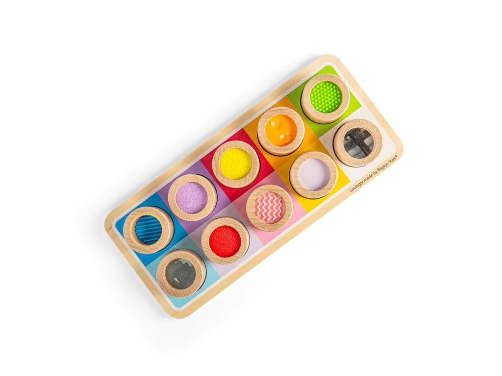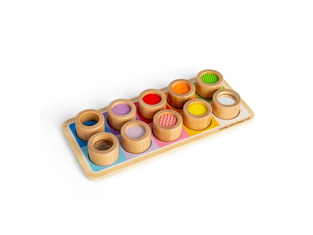 Děti s touto duhovou senzorickou deskou objeví nové vzory a textury. Hračka se skládá z dřevěné desky s barevnými otvory a deseti válcovitých dílků, na kterých najdete např. vroubkovaný silikon, plsť, zrcadlo… Tato senzorická deska děti naučí rozdíly mezi různými texturami, mezi velikostmi a barvami. Děti si při hře procvičí zručnost a motoriku.Vyrobeno z eticky získaného a udržitelného dřeva s certifikací FSC®, malováno netoxickými barvami a laky. Odpovídá evropským bezpečnostním standardům. Hlavní vlastnosti: dřevěná senzorická hračka11 dílků s různými texturamivyrobeno z FSC® certifikovaného dřeva30 x 25,5 x 11,4 cmvhodné od 12 měsíců Značka a certifikát FSC® (Forest Stewardship Council) zaručuje, že dřevo, ze kterého byl produkt vyroben, nebylo vytěženo nelegálně a pochází z lesů obhospodařovaných šetrným či přírodě blízkým způsobem, ve kterém jsou dodržovány přísné environmentální a sociální požadavky. Značka FSC® na výrobku znamená, že svým nákupem pomáháte chránit lesy a podporujete šetrné, odpovědné či přírodě blízké hospodaření, díky kterému jsou naše lesy stabilnější, zdravější, mají přirozenou druhovou skladbu a lépe odolávají negativním následkům klimatických změn.