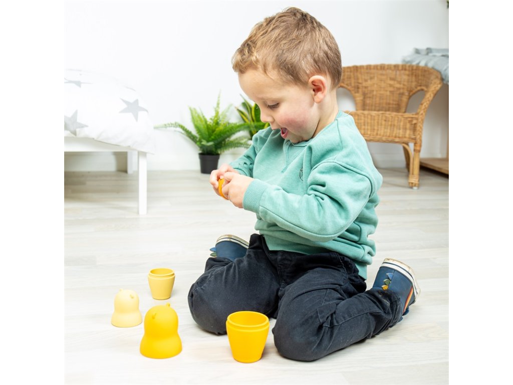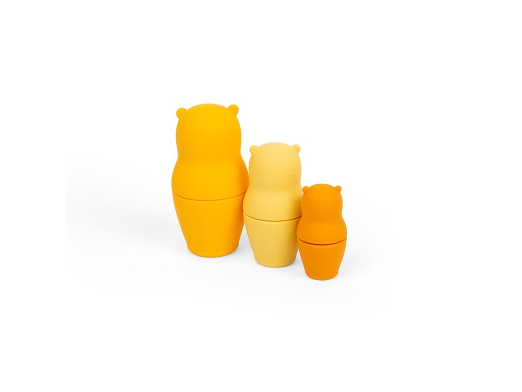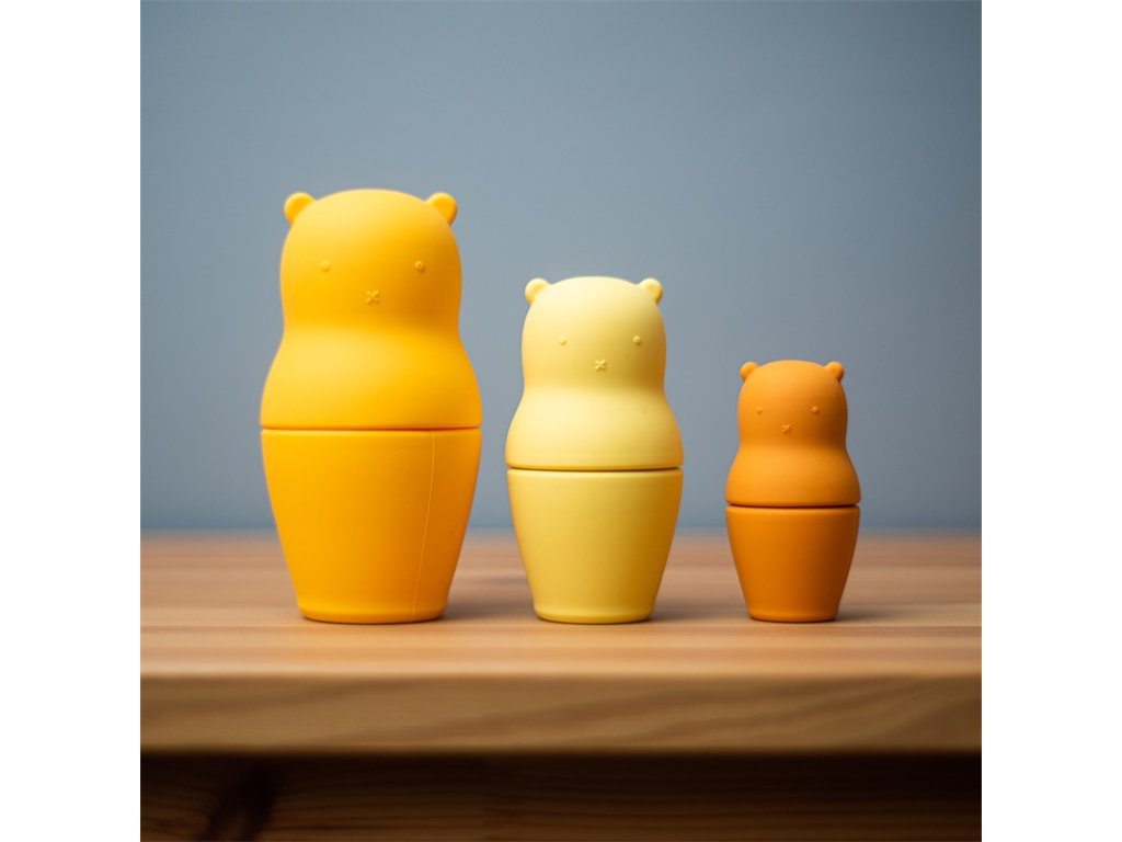 Silikonoví medvídci matrjoška jsou super měkká a ohebná kousátka. Jsou zábavnou vývojovou hračkou a zároveň krásnou dekorací do dětského pokojíčku. Každý medvídek má jinou barvu. Vyrobeno ze 100% potravinářského silikonu, který je odolný, netoxický, snadno se čistí, odolává bekteriím i skvrnám. Čistěte teplou vodou a jemným mýdlem. Udržitelná ekologická hračka. Hlavní vlastnosti: 3 silikonoví medvídci ve třech velikostechvyrobeno ze 100% potravinářského silikonu snadno se udržují čistímožno mýt v myčcevhodné pro děti od 1 roku