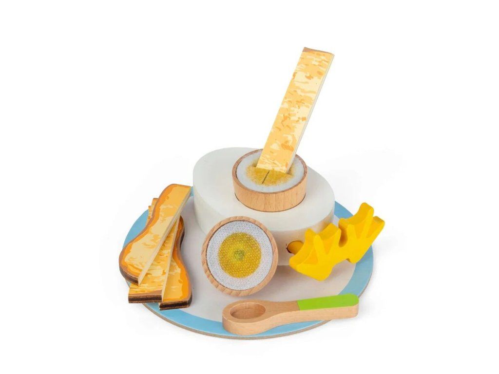Začněte den stylově s vajíčkem naměkko! Tato realistická snídaňová sada je součástí kouzelné kolekce dřevěných potravin a skvěle se hodí pro každé hravé ráno plné fantazie. Sada obsahuje dvě dřevěné poloviny vajíčka s měkkým plstěným žloutkem pro autentický zážitek z namáčení. Součástí balení je také roztomilý kalíšek na vajíčko s kuřecími nožkami, toustoví vojáčci, talířek a lžička. Celý set je vyroben z vysoce kvalitního dřeva s certifikací FSC®, což z něj dělá odolný a udržitelný doplněk do každé dětské kuchyňky. Obohaťte sbírku hraček svého dítěte tímto originálním kouskem. Sada je navržena přímo pro malé dětské ručky a pomáhá rozvíjet jemnou motoriku, zatímco si děti zkoušejí namáčet toust do vajíčka. Zároveň podporuje kreativitu a sociální dovednosti při společném stolování. Stejně jako všechny dřevěné hračky, i tato sada prošla přísnými bezpečnostními testy a je dodávána ve 100% recyklovatelném obalu bez obsahu plastů. Hlavní vlastnosti: dřevěná herní sada s vajíčkem naměkkoobsahuje 9 herních dílků (včetně vajíčka s plstěným žloutkem a toustů) podporuje kreativní a imaginativní hrurozvíjí jemnou motoriku a koordinacipodporuje sociální dovednosti a komunikacivhodné pro hru na domácnost i servírovánívyrobeno z FSC® certifikovaného dřeva vhodné pro děti od 18 měsíců Značka a certifikát FSC® (Forest Stewardship Council) zaručuje, že dřevo, ze kterého byl produkt vyroben, nebylo vytěženo nelegálně a pochází z lesů obhospodařovaných šetrným či přírodě blízkým způsobem, ve kterém jsou dodržovány přísné environmentální a sociální požadavky. Značka FSC® na výrobku znamená, že svým nákupem pomáháte chránit lesy a podporujete šetrné, odpovědné či přírodě blízké hospodaření, díky kterému jsou naše lesy stabilnější, zdravější, mají přirozenou druhovou skladbu a lépe odolávají negativním následkům klimatických změn.
