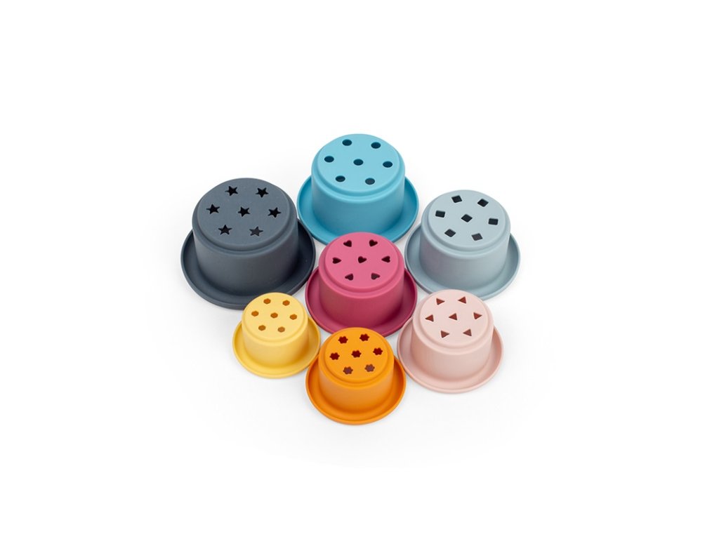 Tyto stohovací kelímky 2 v 1 jsou skvělé pro senzorické aktivity na písku na pláži nebo ve vaší zahradě, ale také ve vaně. Sada je dodávána se sedmi barevnými kelímky. Každý má vzorované otvory na základně, kterými může protékat voda jako vodopád. Děti se zábavnou formou naučí stavět, balancovat a nalévat. To všechno jsou skvělé způsoby pro rozvoj motorických dovedností, koordinaci rukou a očí. Materiál je odolný, netoxický, velmi snadno se čistí. Vyrobeno ze 100% silikonu Čistěte teplou vodou a jemným mýdlem. Silikon bez plastů je udržitelnou volbou pro rodiče, kteří hledají ekologické hračky. Hlavní vlastnosti: vyrobeno ze 100% silikonu bez plastů7 barevných stohovacích dílkůodolný vůči teplotám a skrvnámsnadno se udržuje v čistotěmožno mýt v myčcevhodné pro děti od 1 roku