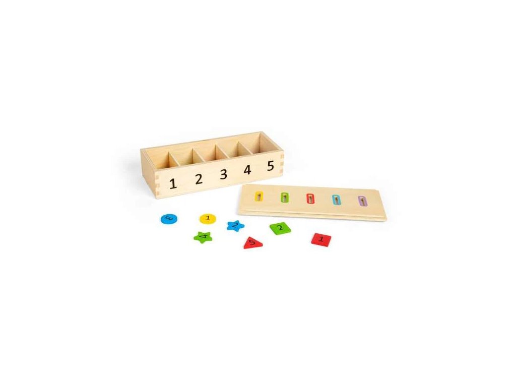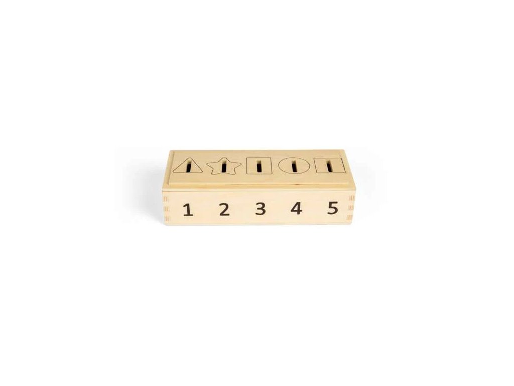 Pomocí jedinečné třídící krabičky s otvory mohou děti prozkoumávat čísla, barvy a tvary. Možností je několik. Děti třídí barvy nebo tvary podle označení na víku nebo tvary a čísla podle označení na bočních stěnách krabičky. Procvičují rozpoznávání čísel, barev a tvarů tím, že vhazují žetony podle barev, tvarů nebo čísel do příslušných otvorů. Žetony jsou různých barev, tvarů a jsou označeny čísly od 1 do 5. Třídění a rozpoznávání čísel, barev a tvarů rozvíjí smyslové vnímání, motorické dovednosti a koordinaci ruka-oko. Krabička je součástí vzdělávací řady Montessori hraček, je vyrobena z vysoce kvalitního a udržitelného dřeva s certifikací FSC® a opatřena netoxickými barvami a laky. Má odnímatelné oboustranné víko pro lepší manipulaci s tvary a vnitřní prostor je rozdělen přepážkami. Splňuje aktuální evropské bezpečnostní normy. Hlavní vlastnosti: dřevěná krabička, 27 žetonůodnímatelné víkovyrobeno ze dřeva s certifikací FSC®Montessori hračkazlepšuje motorické dovednosti a koordinaci ruka-okoučí rozpoznávat barvy, tvary a čísla od 12 měsíců věku Značka a certifikát FSC® (Forest Stewardship Council) zaručuje, že dřevo, ze kterého byl produkt vyroben, nebylo vytěženo nelegálně a pochází z lesů obhospodařovaných šetrným či přírodě blízkým způsobem, ve kterém jsou dodržovány přísné environmentální a sociální požadavky. Značka FSC® na výrobku znamená, že svým nákupem pomáháte chránit lesy a podporujete šetrné, odpovědné či přírodě blízké hospodaření, díky kterému jsou naše lesy stabilnější, zdravější, mají přirozenou druhovou skladbu a lépe odolávají negativním následkům klimatických změn.