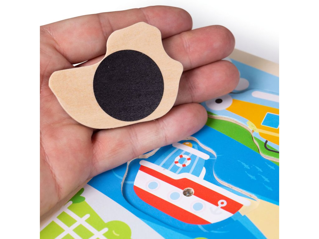 Nechejte děti rozpoznávat tvary i dopravní prostředky a bavit se jejich roztomilými zvuky. Po umístění správného dílku do vkládačky se z vestavěného zařízení ozve charakteristický projev stroje, který mohou správně přiřazovat, a zábavně tím rozvíjet své poznávací dovednosti. Snadno je přitom lze napodobováním zvuků vést hravým způsobem k prvním slůvkům. Dřevěné dílky jsou velikostí i oblými tvary přizpůsobeny k manipulaci malými dětskými ručičkami, jsou příjemné na dotek, a pomáhají tak stimulovat hmat. Pestrými barvami děti vkládačka snadno bezprostředně zaujme. Nabízí se také v dalších atraktivních motivech. Vyrobeno z kvalitního, zodpovědně získaného dřeva ošetřeného nezávadnými barvami či laky. Hlavní vlastnosti:základna a 6 dílků4 různá provedenímotivující zvukové efektyatraktivní a odolné zpracování
