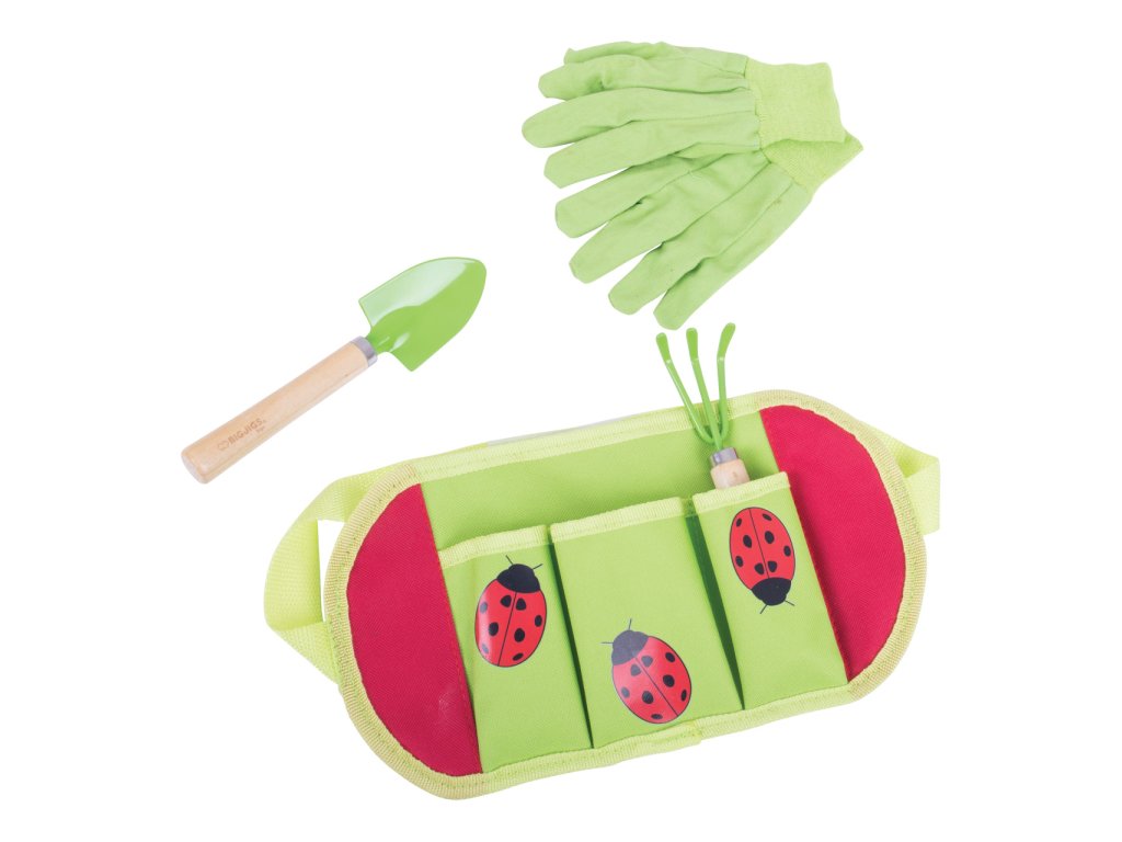 Barevné, zábavné a praktické - ideální pro každého začínajícího zahradníka. Tento pestrobarevný zahradní pás s červenými beruškami obsahuje vše, co malý zahradník potřebuje: rýč, malé hrábky a rukavice. Pás na zahradní nářadí je také ideálním místem k uchování všeho nářadí v bezpečí. Pružná část na zápěstí zahradnických rukavic zajišťuje, že dovnitř nespadnou žádné nežádoucí předměty a taky, že rukavice nesklouznou. Rýč a vidlice jsou vybaveny dřevěnými držadly. Hlavní vlastnosti: ideální velikost pro dětirozvíjí motoriku, rovnováhu a vztah k příroděvyrobeno z kovu, dřevěná násada