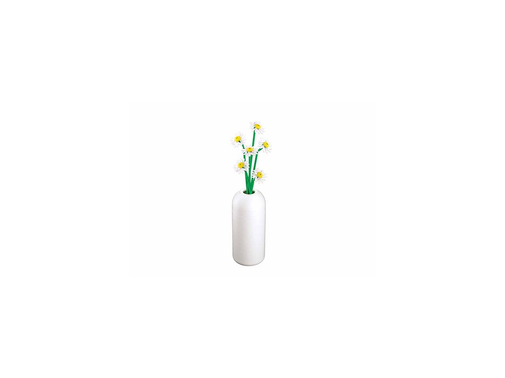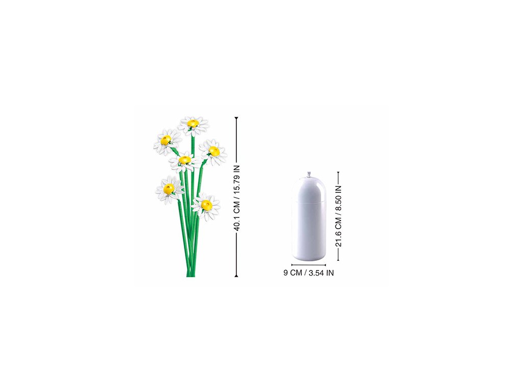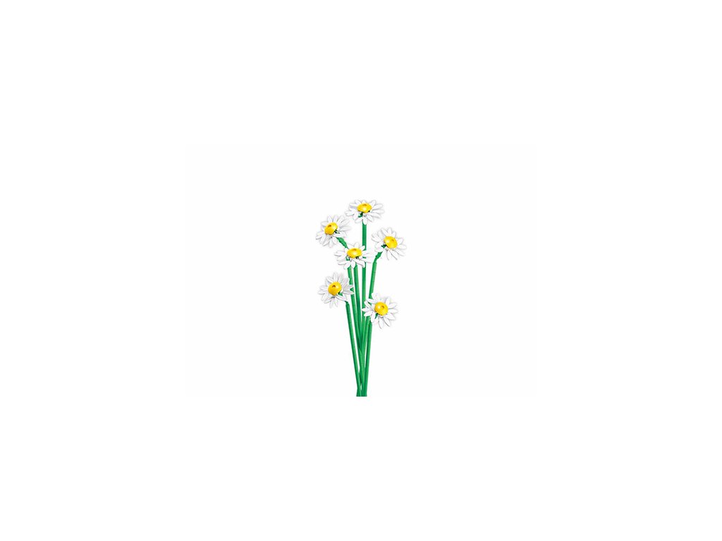 Tato stavebnice obsahuje šest květin různých velikostí, každý s žlutým středem a bílou korunkou. Tato kombinace barev vytváří živý a veselý dojem, který vnese do vašeho interiéru radost a energii. Detaily květin jsou pečlivě zpracovány, což dodává celkovému vzhledu realističnost.