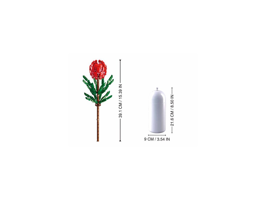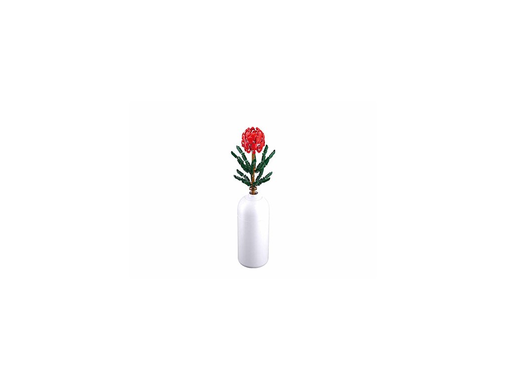 Tato stavebnice obsahuje jednu rostlinu s nádherným červeným květem, obklopenou dvěma bohatými řadami okvětních lístků. Design květiny je pečlivě promyšlený, aby zachytil její přirozenou krásu a detailnost, což dodává celkovému vzhledu atraktivitu.