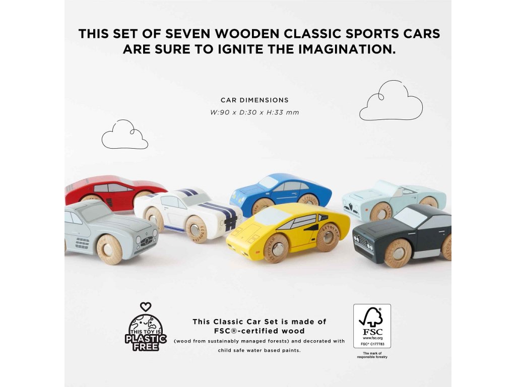 Tato sada obsahující set 7 klasických dřevěných sportovních autíček je vyrobena ze dřeva s certifikací FSC®. Autíčka pomáhají rozvíjet kognitivní dovednosti, zručnost a koordinaci ruka - oko. Tato sada je dokonalým dárkem pro malé nadšence aut a vozidel, je skvělým doplňkem do světa fantazie každého dítěte. Ať už jsou autíčka používána jako dekorativní prvek nebo jako hračka, okamžitě upoutají pozornost každého dítěte. Hračky s účelemVšechny hračky firmy Le Toy Van jsou vyrobeny s cílem – aby dlouho vydržely. Designovány s láskou zkušenými řemeslníky za použití etických praktik a udržitelných materiálů, které jsou laskavější k naší planetě. Hlavní vlastnosti: sada 7 dřevěných autíček s detailypomáhá s rozvojem představivosti, řeči a sociálních dovednostívyrobeno z dřeva s certifikátem FSC®malováno netoxickými barvami s mnoha detailytestováno dle nejpřísnějších standardů Značka a certifikát FSC® (Forest Stewardship Council) zaručuje, že dřevo, ze kterého byl produkt vyroben, nebylo vytěženo nelegálně a pochází z lesů obhospodařovaných šetrným či přírodě blízkým způsobem, ve kterém jsou dodržovány přísné environmentální a sociální požadavky. Značka FSC® na výrobku znamená, že svým nákupem pomáháte chránit lesy a podporujete šetrné, odpovědné či přírodě blízké hospodaření, díky kterému jsou naše lesy stabilnější, zdravější, mají přirozenou druhovou skladbu a lépe odolávají negativním následkům klimatických změn.