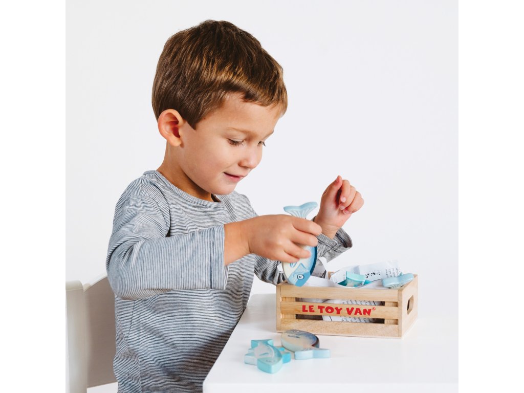 Bedýnka s rybami je perfektní pro hru na role. Najdete v ní několik druhů ryb. Děti se díky hračce naučí o rozdílných potravinách a důležitosti vyvážené stravy. Vyrobeno z pevného a udržitelného dřeva, malováno netoxickými barvami, velikost tak akorát pro malé dětské ruce. Hračka pomůže při rozvoji koordinace a jemné motoriky. Ideální doplněk dětských prodejních stánků a kuchyněk. Hračky s účelemVšechny hračky firmy Le Toy Van jsou vyrobeny s cílem – aby dlouho vydržely. Designovány s láskou zkušenými řemeslníky za použití etických praktik a udržitelných materiálů, které jsou laskavější k naší planetě. Hlavní vlastnosti: vyrobeno eticky z udržitelného dřevatestováno dle nejpřísnějších standardůmalováno netoxickými barvami na bázi vodyinspiruje k představivé hřerozvíjí kognitivní dovednosti Honeybake kolekce: Hračky v této kolekci jsou vhodné k objevování, pomohou dětem s rozvojem představivosti, sociálních a verbálních dovedností a kognitivních funkcí. Tradiční design s moderními detaily děti jistě bude bavit. Honeybake je kolekce Le Toy Van, která vyhrála nejvíce ocenění, a to za design, kvalitu, bezpečnost a také za vzdělávací a herní hodnotu.