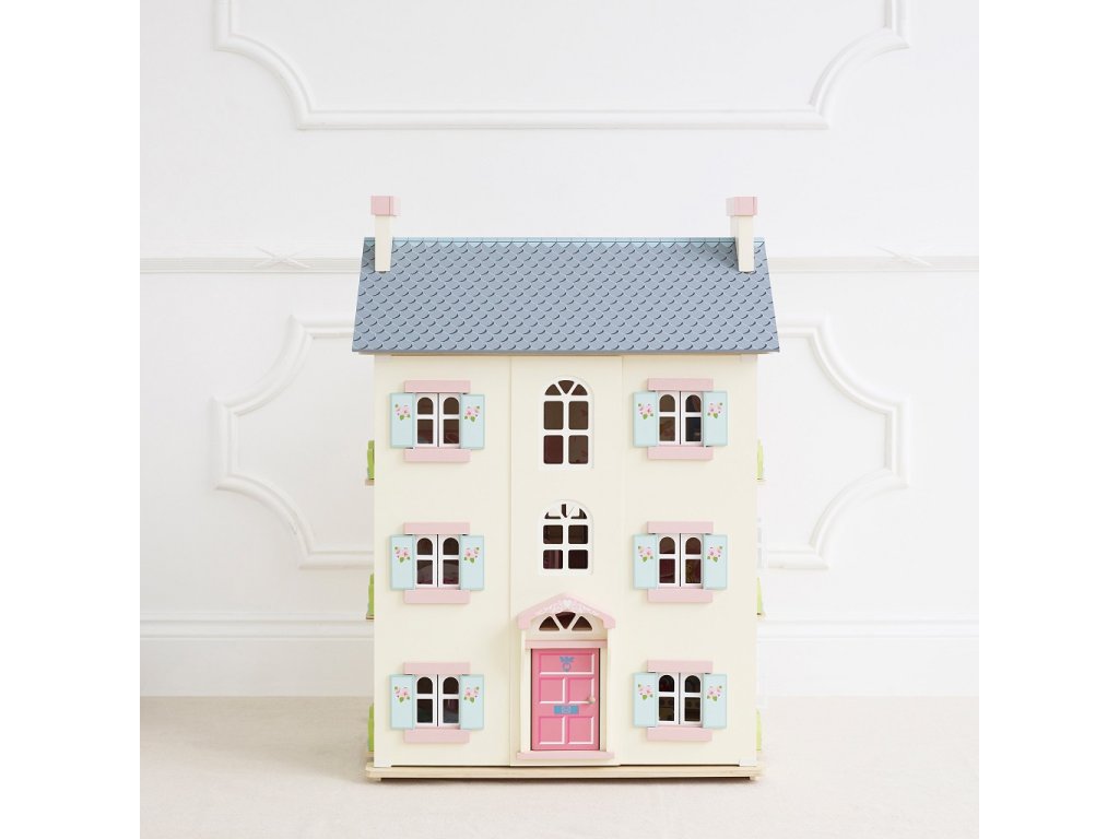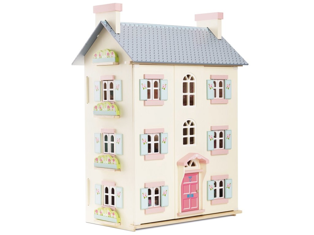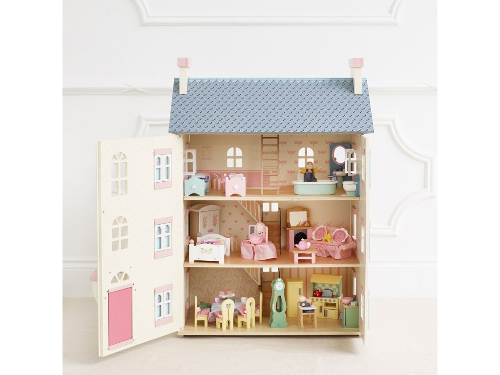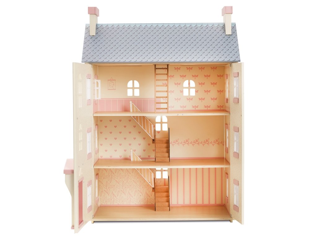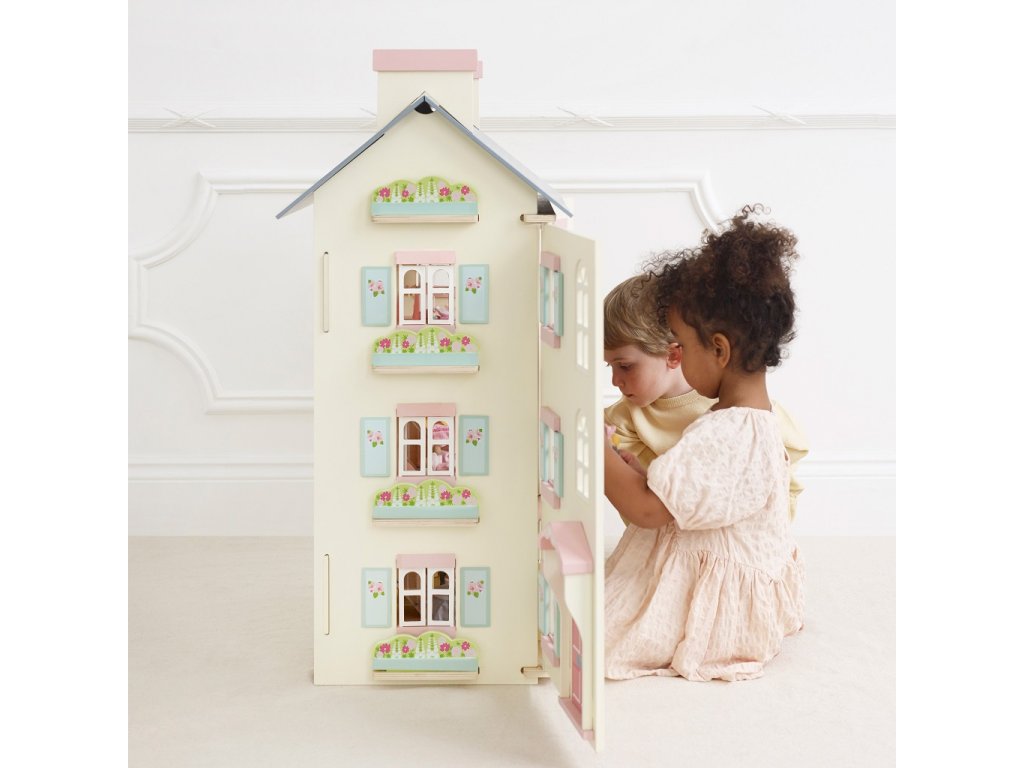 Vítejte doma! Tento velký dřevěný čtyřpatrový domeček pro panenky se bude vyjímat ve sbírce hraček vašich dětí. Čeká je zábava při hře na role, tento nádherný domek je dost velký pro každého malého lorda nebo lady. Grandiózní dům je plný malovaných detailů v jemné pastelové růžové a modré, najdete zde také motivy květin. Krásná klasická i oblouková okna a růžové dveře jen čekají na otevření. Okenice jsou pohyblivé, děti je mohou na noc zavřít, ráno zase dovnitř pustit světlo. Po otevření přední strany se děti mohou ponořit do světa představivosti. Stěny pokojů jsou dekorovány individuálně, najdete zde dřevěné schodiště s okrasným zábradlím. Šedá tašková střecha s 2 komíny je oddělitelná, odhalí půdu, namísto schodiště na ni vede žebřík. Vysněný dům pro panenky bude speciálním dárkem pro mnoho dětí, můžete si jej také předávat z generace na generaci. Vybavení domečku a panenky můžete zakoupit zvlášť – podpořte dětskou představivost doplňky od Le Toy Van, které pasují do všech domečků z kolekce Daisylane. Hračky s účelem Všechny hračky firmy Le Toy Van jsou vyrobeny s cílem – aby dlouho vydržely. Designovány s láskou zkušenými řemeslníky za použití etických praktik a udržitelných materiálů, které jsou laskavější k naší planetě. Hlavní vlastnosti: pro panenky do 15 cmudržitelné FSC dřevovyrobeno eticky s láskoutestováno dle nejpřísnějších standardůmalováno netoxickými barvami na bázi vodyinspiruje k představivé hřepomáhá s rozvojem kreativity, řeči a koordinace Ocenění hračky:Made For Mums Gold Award 2018Good Toy Guide Approved Daisylane kolekce: Prestižní kolekce domečků pro panenky a doplňků firmy Le Toy Van. Před více než 25 lety zakladatel Georges navrhl svůj úplně první domeček pro panenky, stavební kámen této firmy. Vyrobeno eticky z udržitelných materiálů, dřevěné domečky pro panenky Daisylane jsou jedinečné a nebudou dětskou představivost držet zpátky. Rodinné dědictví, opravdová investice do hraní. Značka a certifikát FSC® (Forest Stewardship Council) zaručuje, že dřevo, ze kterého byl produkt vyroben, nebylo vytěženo nelegálně a pochází z lesů obhospodařovaných šetrným či přírodě blízkým způsobem, ve kterém jsou dodržovány přísné environmentální a sociální požadavky. Značka FSC® na výrobku znamená, že svým nákupem pomáháte chránit lesy a podporujete šetrné, odpovědné či přírodě blízké hospodaření, díky kterému jsou naše lesy stabilnější, zdravější, mají přirozenou druhovou skladbu a lépe odolávají negativním následkům klimatických změn.