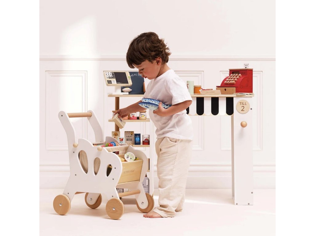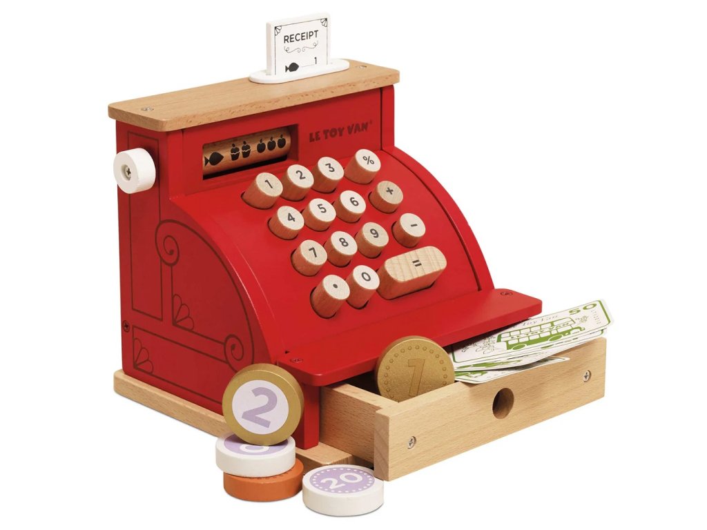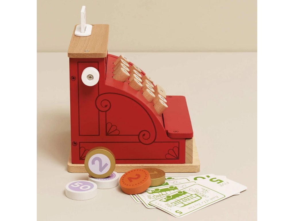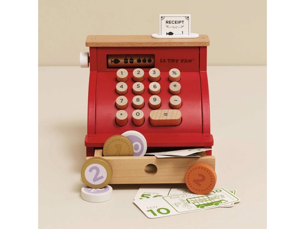 Tahle roztomilá dřevěná pokladna v retro stylu vypadá naprosto úžasně a je ideální hračkou pro malé prodavače i prodavačky. Díky ní se děti zábavnou formou naučí počítat, poznávat čísla a rozvíjet své sociální dovednosti při hře na obchod. Pokladna má spoustu detailů. Otevírací šuplík na peníze, dřevěnou účtenku, papírové bankovky a mince i platební kartu. Její vintage design s jasně červenou barvou a zlatými detaily dodává hračce jedinečný šmrnc a zapadne do každého dětského pokojíčku.Tato odolná vzdělávací hračka je vyrobena z kvalitního, udržitelně získaného dřeva a díky preciznímu zpracování vydrží celé roky hraní. Hračky s účelemVšechny hračky firmy Le Toy Van jsou vyrobeny s cílem – aby dlouho vydržely. Designovány s láskou zkušenými řemeslníky za použití etických praktik a udržitelných materiálů, které jsou laskavější k naší planetě. Hlavní vlastnosti: rozvíjí matematické schopnosti a představivost dětívyrobeno eticky z udržitelného dřevatestováno dle nejpřísnějších standardůmalováno netoxickými barvami na bázi vodyinspiruje k představivé hřerozvíjí kognitivní dovednostivhodné pro děti od 3 let