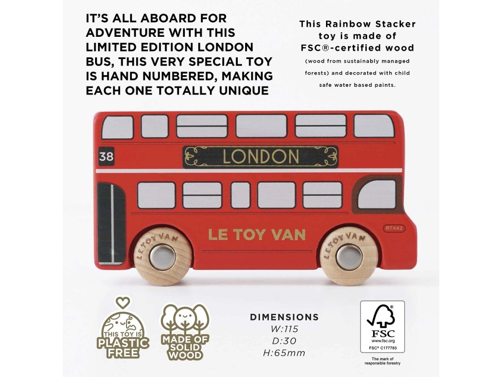 Vydejte se za dobrodružstvím s limitovanou edicí londýnského autobusu! Tato hračka z odolného dřeva je vyrobena a ručně očíslována ve Velké Británii - každý kus je zcela jedinečný! Lakovaný v tradiční červené barvě s elegantními zlatými detaily a robustními koly je kompatibilní se všemi garážemi a vláčkodráhami z řad Le Toy Van. Autobus je ze dřeva s certifikací FSC® (dřevo z lesů obhospodařovaných udržitelným způsobem) a ozdoben barvami na vodní bázi bezpečnými pro děti. Hračky s účelemVšechny hračky firmy Le Toy Van jsou vyrobeny s cílem – aby dlouho vydržely. Designovány s láskou zkušenými řemeslníky za použití etických praktik a udržitelných materiálů, které jsou laskavější k naší planetě. Hlavní vlastnosti: vyrobeno eticky z FSC udržitelného dřevamalováno netoxickými barvami na bázi vodytestováno dle nejpřísnějších standardůlimitovaná edice ručně očíslovaných autobusů (pouze 1000 ks celosvětově)klasický vintage červený designvyrobeno ve Velké Británii Auta & stavby: Stavební a motorická kolekce Le Toy Van, která vyhrála mnoho ocenění. Přesněji prozatím přes 15 ocenění za představivá auta a stavební hračky. Podporují dětskou fantazii, jsou ideální k představivé hře, rozvíjí kreativitu a hravě zlepšují dětskou koordinaci ruka‑oko. Značka a certifikát FSC® (Forest Stewardship Council) zaručuje, že dřevo, ze kterého byl produkt vyroben, nebylo vytěženo nelegálně a pochází z lesů obhospodařovaných šetrným či přírodě blízkým způsobem, ve kterém jsou dodržovány přísné environmentální a sociální požadavky. Značka FSC® na výrobku znamená, že svým nákupem pomáháte chránit lesy a podporujete šetrné, odpovědné či přírodě blízké hospodaření, díky kterému jsou naše lesy stabilnější, zdravější, mají přirozenou druhovou skladbu a lépe odolávají negativním následkům klimatických změn.