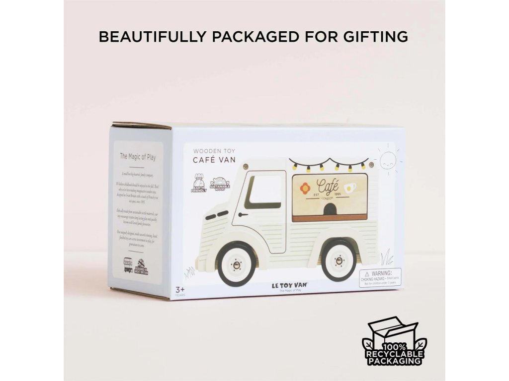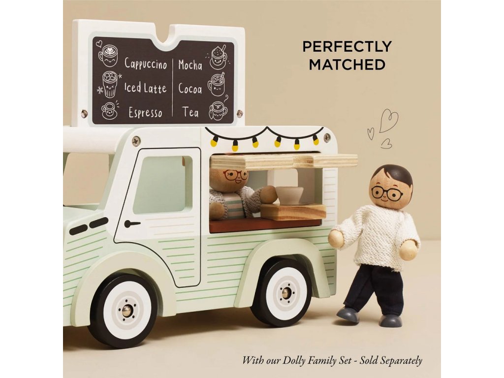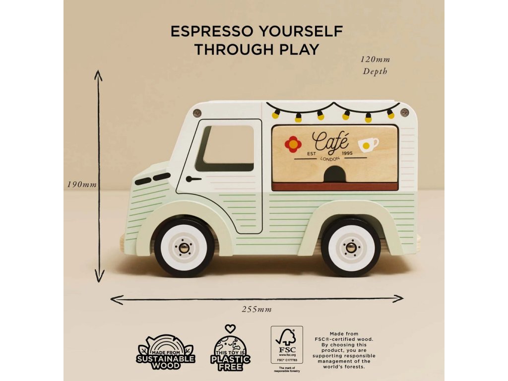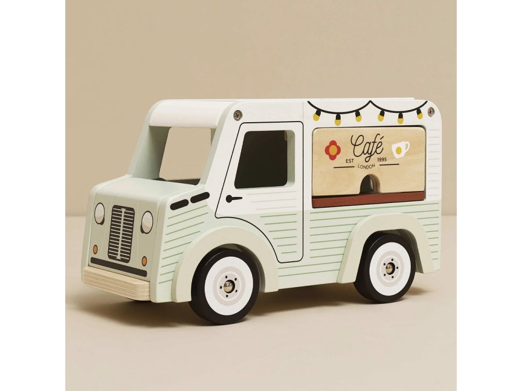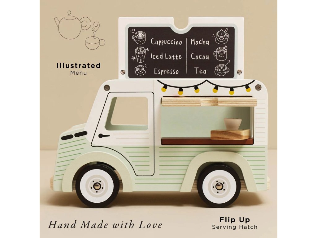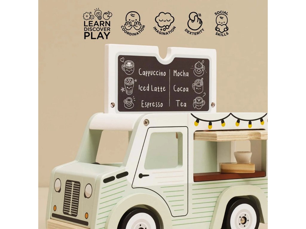 Mobilní kavárna Street coffee.Tato stylová dodávka ve vintage designu je vyrobená z FSC® certifikovaného dřeva, natřená jemnou pistáciově zelenou a bílou barvou. Díky krásně zpracovaným detailům a ilustracím po všech stranách zaujme na první pohled. Stříška se dá snadno otevřít – uvnitř se ukrývá menu s nabídkou kávy a čaje. Přední výdejní okénko zase umožňuje malým baristům obsluhovat své zákazníky jako v opravdové pojízdné kavárně. Hlavní vlastnosti: retro kavárenská dodávkaservírovací tác s hrníčkem a croissantemotočná stříška a otevírací okénkovyrobeno z FSC® dřeva testováno dle nejpřísnějších standardůbarveno netoxickými barvami na bázi vodyinspiruje ke kreativní a představivé hřepodporuje rozvoj dětí díky hraní na role Značka a certifikát FSC® (Forest Stewardship Council) zaručuje, že dřevo, ze kterého byl produkt vyroben, nebylo vytěženo nelegálně a pochází z lesů obhospodařovaných šetrným či přírodě blízkým způsobem, ve kterém jsou dodržovány přísné environmentální a sociální požadavky. Značka FSC® na výrobku znamená, že svým nákupem pomáháte chránit lesy a podporujete šetrné, odpovědné či přírodě blízké hospodaření, díky kterému jsou naše lesy stabilnější, zdravější, mají přirozenou druhovou skladbu a lépe odolávají negativním následkům klimatických změn.