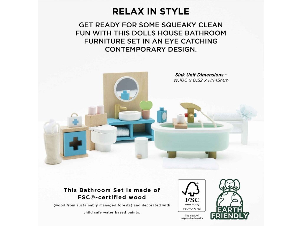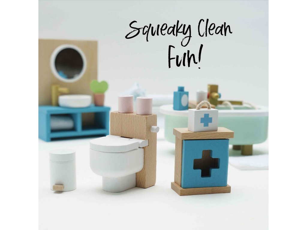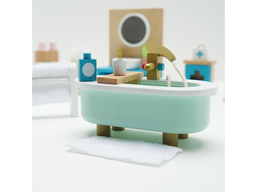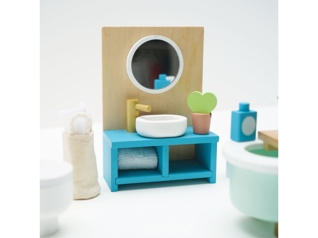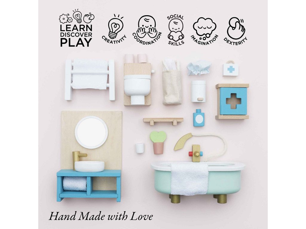 Tradiční a barevná sada nábytku a vybavení koupelny ze dřeva. Bude se perfektně hodit do dětských domečků pro panenky. Šest kusů nábytku a doplňky – vana, toaleta, umyvadlo, věšák na ručníky, lékárnička. Sada nábytku v retro stylu je vyrobena eticky za použití udržitelných materiálů. Velikostně se hodí do domečků pro panenky od Le Toy Van, více doplňků domečků z řady Daisylane najdete na našem webu. Hračky s účelemVšechny hračky firmy Le Toy Van jsou vyrobeny s cílem – aby dlouho vydržely. Designovány s láskou zkušenými řemeslníky za použití etických praktik a udržitelných materiálů, které jsou laskavější k naší planetě. Hlavní vlastnosti: měřítko 1:12vyrobeno eticky z udržitelných materiálůtestováno dle nejpřísnějších standardůmalováno netoxickými barvami na bázi vodytrénuje komunikační dovednosti a koordinaciinspiruje ke kreativní a představivé hře Daisylane kolekce: Prestižní kolekce domečků pro panenky a doplňků firmy Le Toy Van. Před více než 25 lety zakladatel Georges navrhl svůj úplně první domeček pro panenky, stavební kámen této firmy. Vyrobeno eticky z udržitelných materiálů, dřevěné domečky pro panenky Daisylane jsou jedinečné a nebudou dětskou představivost držet zpátky. Rodinné dědictví, opravdová investice do hraní.