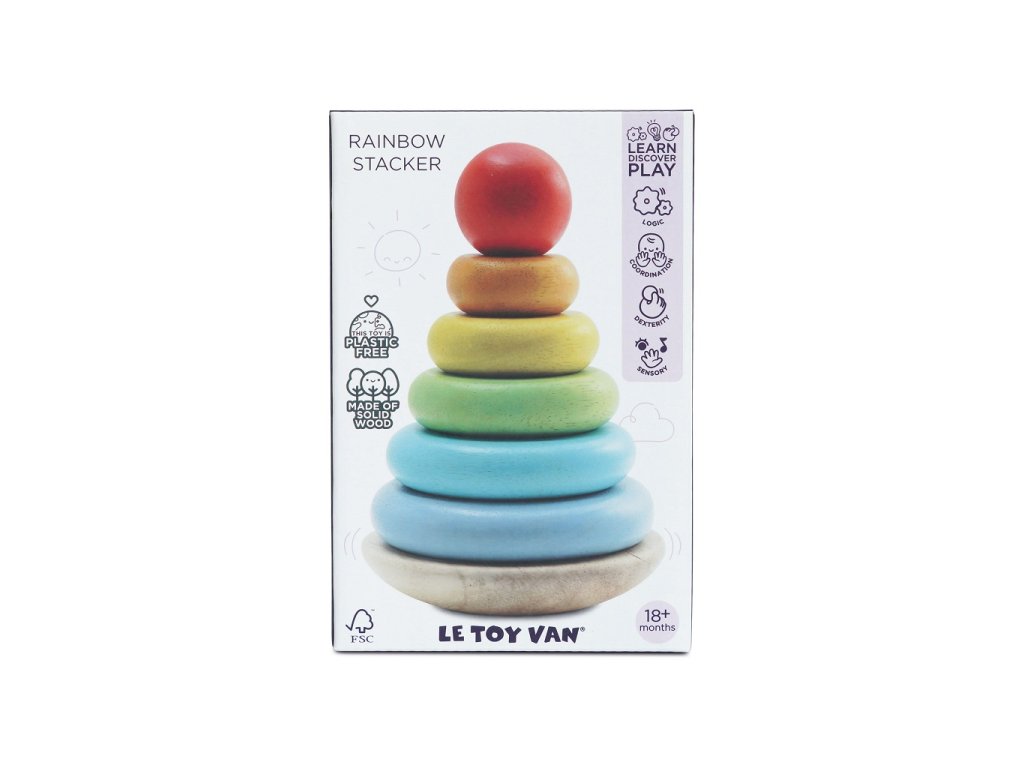 Dokážeš poskládat tuto duhu ve správném pořadí? Robustní barevné kroužky vybízí i ty nejmenší děti k jejich třídění. Trénuje se tak motorika, koordinace ruky a oka a chápání tvarů a velikostí. Houpající základna přidává na zábavě! Skládací věž je vyrobena ze dřeva s certifikací FSC® (dřevo z lesů obhospodařovaných udržitelným způsobem) a ozdobena barvami na vodní bázi bezpečnými pro děti. Hračky s účelemVšechny hračky firmy Le Toy Van jsou vyrobeny s cílem – aby dlouho vydržely. Designovány s láskou zkušenými řemeslníky za použití etických praktik a udržitelných materiálů, které jsou laskavější k naší planetě. Hlavní vlastnosti: vyrobeno eticky z udržitelného dřevatestováno dle nejpřísnějších standardůmalováno netoxickými barvami na bázi vody6 kroužků a kolíček se zaoblenou základnoutrénuje motoriku a koordinaci Ocenění hračky: Right Start Toy Award 2023 Petilou kolekce: Kolekce pro nemluvňata a batolata od Le Toy Van obsahuje hlavně hmatové hračky, které mají nejmenším posloužit také jako učební prostředky. Kolekce je inspirována přírodou kolem nás a je navržena tak, aby rozvíjela smysly dětí pomocí rozdílných zvuků, textur, tvarů a hmotností. Děti tak od malička zapojí všechny své smysly. V kolekci najdete například skládačky, vkládačky, chodítka, … Značka a certifikát FSC® (Forest Stewardship Council) zaručuje, že dřevo, ze kterého byl produkt vyroben, nebylo vytěženo nelegálně a pochází z lesů obhospodařovaných šetrným či přírodě blízkým způsobem, ve kterém jsou dodržovány přísné environmentální a sociální požadavky. Značka FSC® na výrobku znamená, že svým nákupem pomáháte chránit lesy a podporujete šetrné, odpovědné či přírodě blízké hospodaření, díky kterému jsou naše lesy stabilnější, zdravější, mají přirozenou druhovou skladbu a lépe odolávají negativním následkům klimatických změn.