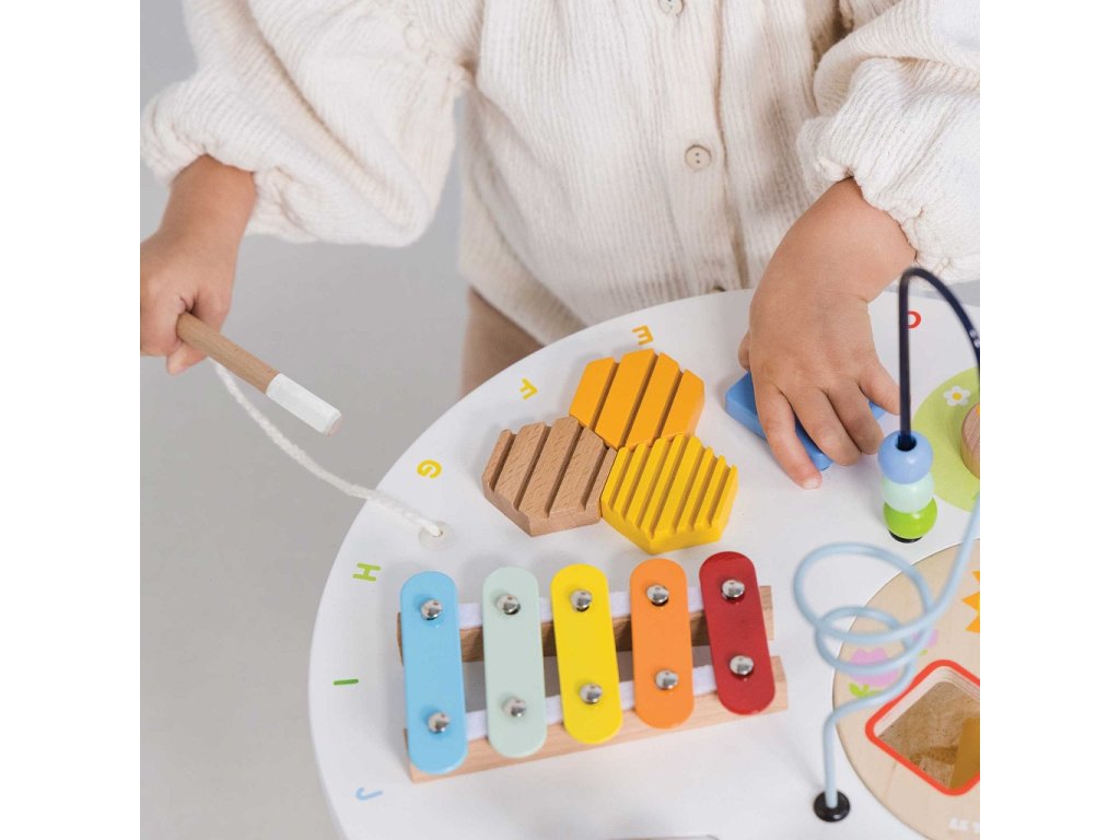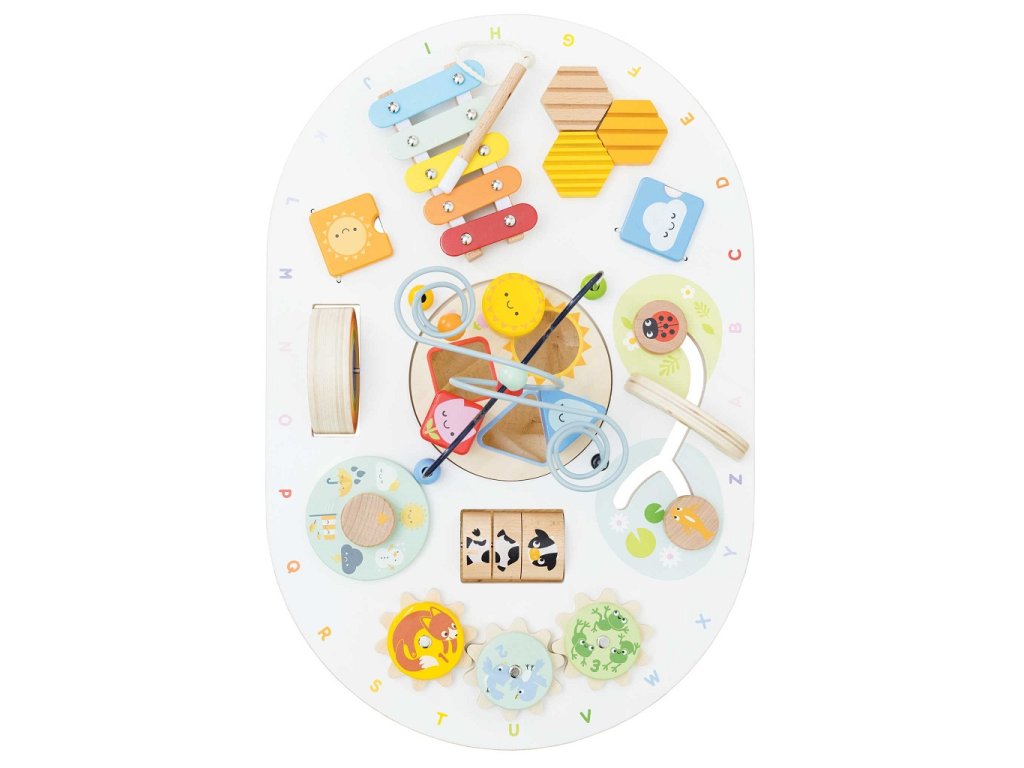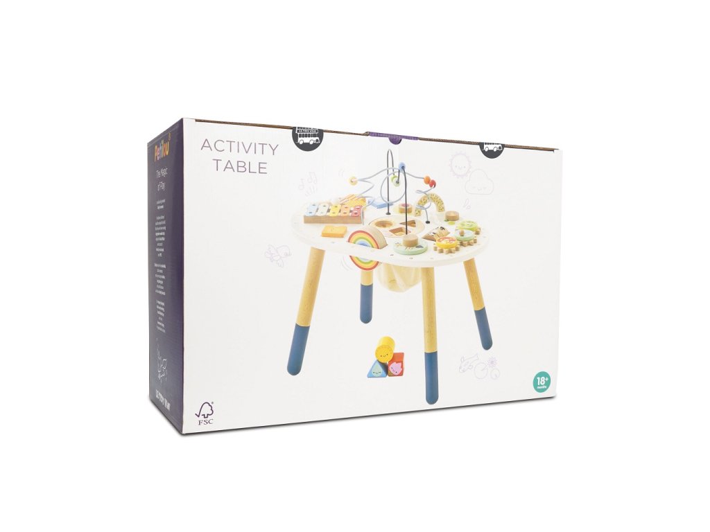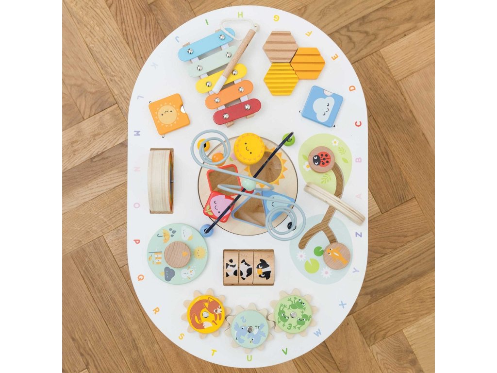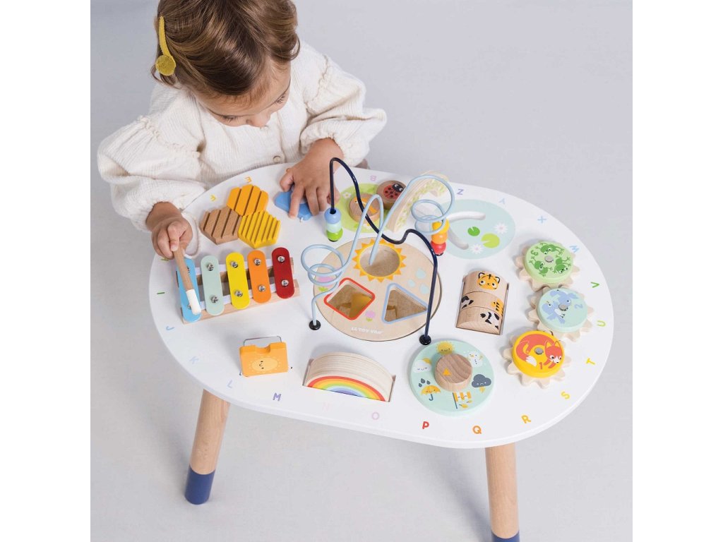 Tento aktivní motorický stůl potěší nejen oko, ale také ostatní smysly. Perfektní hračka pro batolata, pomůže s rozvojem představivosti. Stoleček je plný multisenzorických aktivit, které zabaví všechny zvídavé děti. Najdou na něm korálkový labyrint, vkládačku, xylofon, ozubená kolečka, otočné chrastítko a další! Takový počet aktivit děti zabaví na dlouhé hodiny.Tento robustní stoleček vám vydrží opravdu dlouho, je vyroben z udržitelného FSC® dřeva a dekorován zářivými základními barvami, které jsou netoxické. Senzorické hračky Le Toy Van si můžete předávat z generace na generaci. Hlavní vlastnosti: vyrobeno z FSC dřevamultifunkční dřevěný aktivní stolekrozvíjí dětské smysly během hryveselý pestrobarevný design stimuluje představivostudržitelná hračka inspirována přírodou Petilou kolekce: Kolekce pro nemluvňata a batolata od Le Toy Van obsahuje hlavně hmatové hračky, které mají nejmenším posloužit také jako učební prostředky. Kolekce je inspirována přírodou kolem nás a je navržena tak, aby rozvíjela smysly dětí pomocí rozdílných zvuků, textur, tvarů a hmotností. Děti tak od malička zapojí všechny své smysly. V kolekci najdete například skládačky, vkládačky, chodítka, … Značka a certifikát FSC® (Forest Stewardship Council) zaručuje, že dřevo, ze kterého byl produkt vyroben, nebylo vytěženo nelegálně a pochází z lesů obhospodařovaných šetrným či přírodě blízkým způsobem, ve kterém jsou dodržovány přísné environmentální a sociální požadavky. Značka FSC® na výrobku znamená, že svým nákupem pomáháte chránit lesy a podporujete šetrné, odpovědné či přírodě blízké hospodaření, díky kterému jsou naše lesy stabilnější, zdravější, mají přirozenou druhovou skladbu a lépe odolávají negativním následkům klimatických změn.