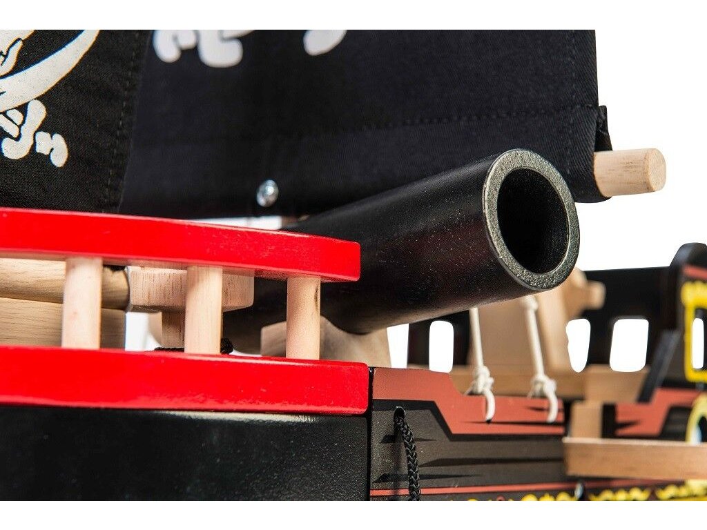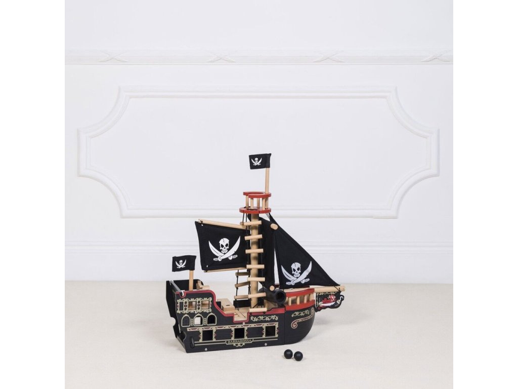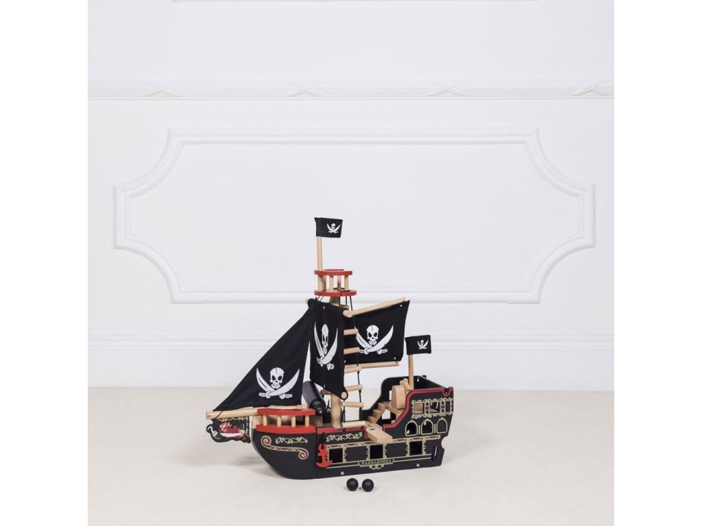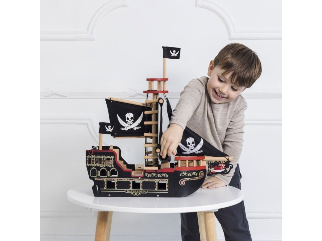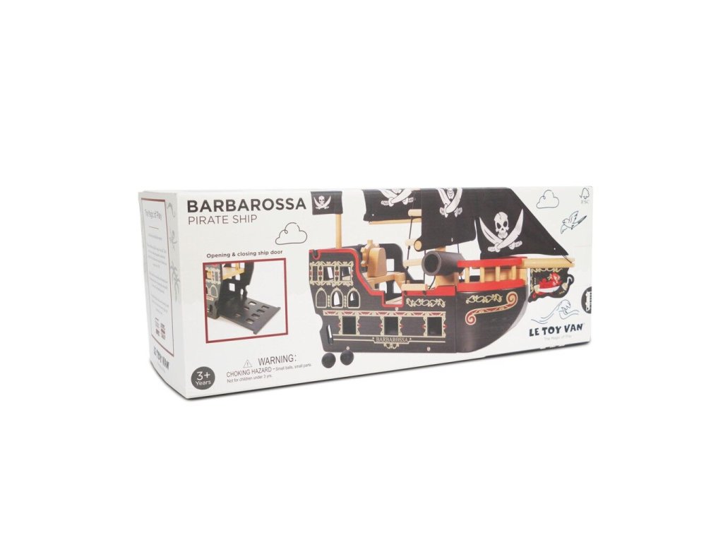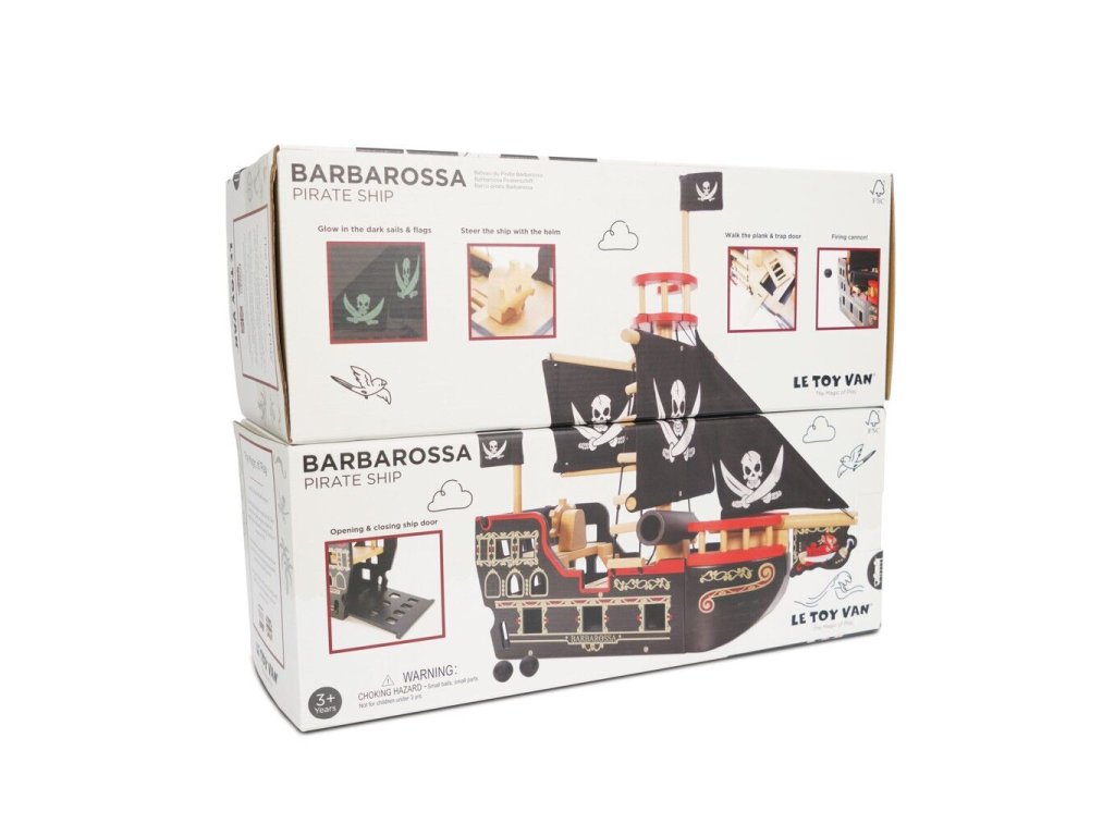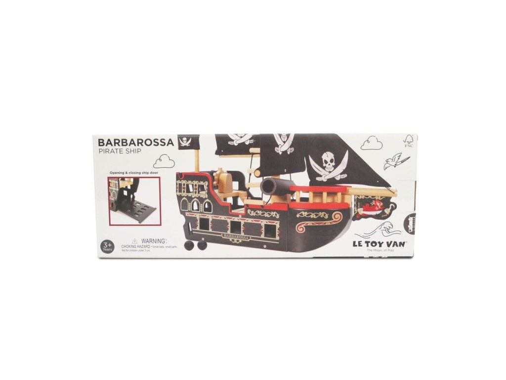 Velkolepá Barbarossa je připravena k plavbě! Loď je malována černou barvou, její černé plachty s lebkou a překříženými meči varují, piráti se plaví! Krásná hračka s mnoha detaily je vyrobena z odolného a udržitelného dřeva. Je plná interaktivních funkcí, které děti mohou objevovat během představivé hry – vraní hnízdo, popravčí prkno, lanoví, dělo s koulemi (střílí díky pružiny), kotva s navijákem, dveře do podpalubí a otevírací záď. Hračka bez obsahu plastu je vhodná pro figurky do 10 cm. Hračky s účelemVšechny hračky firmy Le Toy Van jsou vyrobeny s cílem – aby dlouho vydržely. Designovány s láskou zkušenými řemeslníky za použití etických praktik a udržitelných materiálů, které jsou laskavější k naší planetě. Hlavní vlastnosti: vyrobeno eticky z udržitelného dřevatestováno dle nejpřísnějších standardůmalováno netoxickými barvami na bázi vodyinspiruje k představivé hřerozvíjí kognitivní dovednosti Ocenění hračky:Right Start Best Toy Award Pirátská kolekce: Tradiční pirátská kolekce pro nejmenší s balanční pirátskou lodí, ale také pro větší děti s lodí Barbarrossa, která vyhrála ocenění. Design vytažený do detailu, hračky podporují v představivé hře. S hračkami i postavičkami si děti užijí dlouhé hodiny zábavy. Značka a certifikát FSC® (Forest Stewardship Council) zaručuje, že dřevo, ze kterého byl produkt vyroben, nebylo vytěženo nelegálně a pochází z lesů obhospodařovaných šetrným či přírodě blízkým způsobem, ve kterém jsou dodržovány přísné environmentální a sociální požadavky. Značka FSC® na výrobku znamená, že svým nákupem pomáháte chránit lesy a podporujete šetrné, odpovědné či přírodě blízké hospodaření, díky kterému jsou naše lesy stabilnější, zdravější, mají přirozenou druhovou skladbu a lépe odolávají negativním následkům klimatických změn.