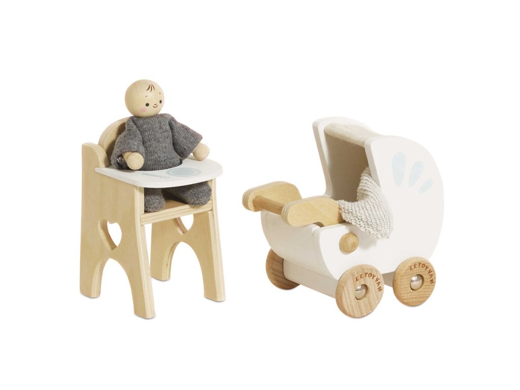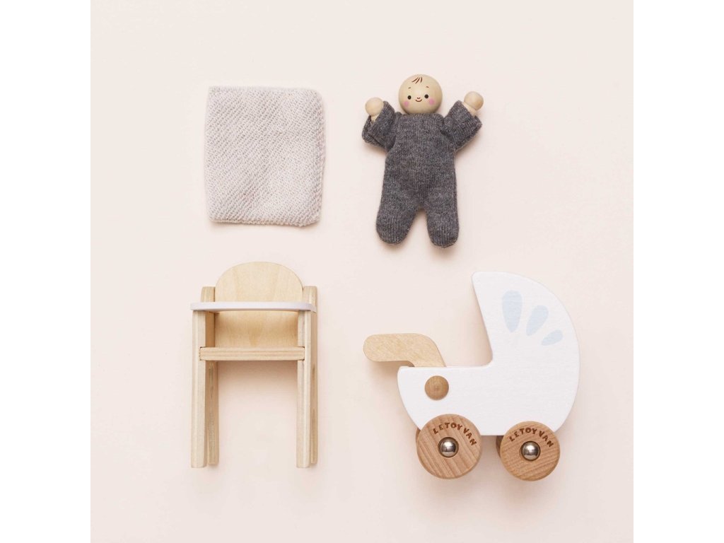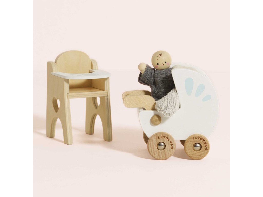 Dřevěný malovaný kočárek s postavičkou miminka. Součástí setu je vysoká jídelní židlea, jídelní souprava pro miminko a taška. Textilní doplňky jsou vyrobeny ručně. Vyrobeno ekologicky z přírodního, odolného kaučukového dřeva. Hlavní vlastnosti: rozměry jídelní židle 5x6x8 cmvyrobeno z trvanlivého, udržitelného kaučukového dřevaeticky vyrobeno s láskoudůkladně testováno, aby splňovalo nejvyšší bezpečnostní standardyzdobeno netoxickými barvami na vodní bázipodporuje kreativitu prostřednictvím nápadité hry pomáhá rozvíjet jemnou motoriku a koordinaci
