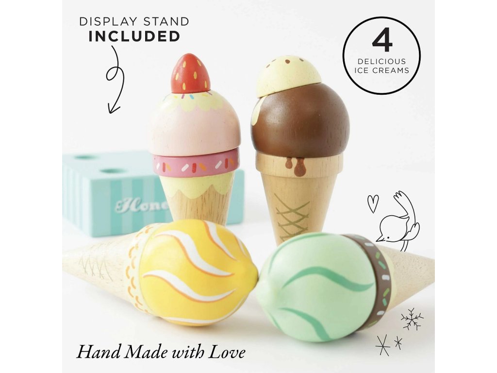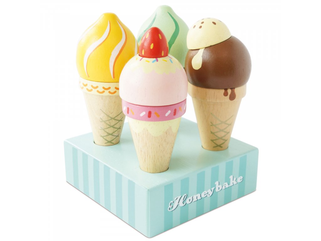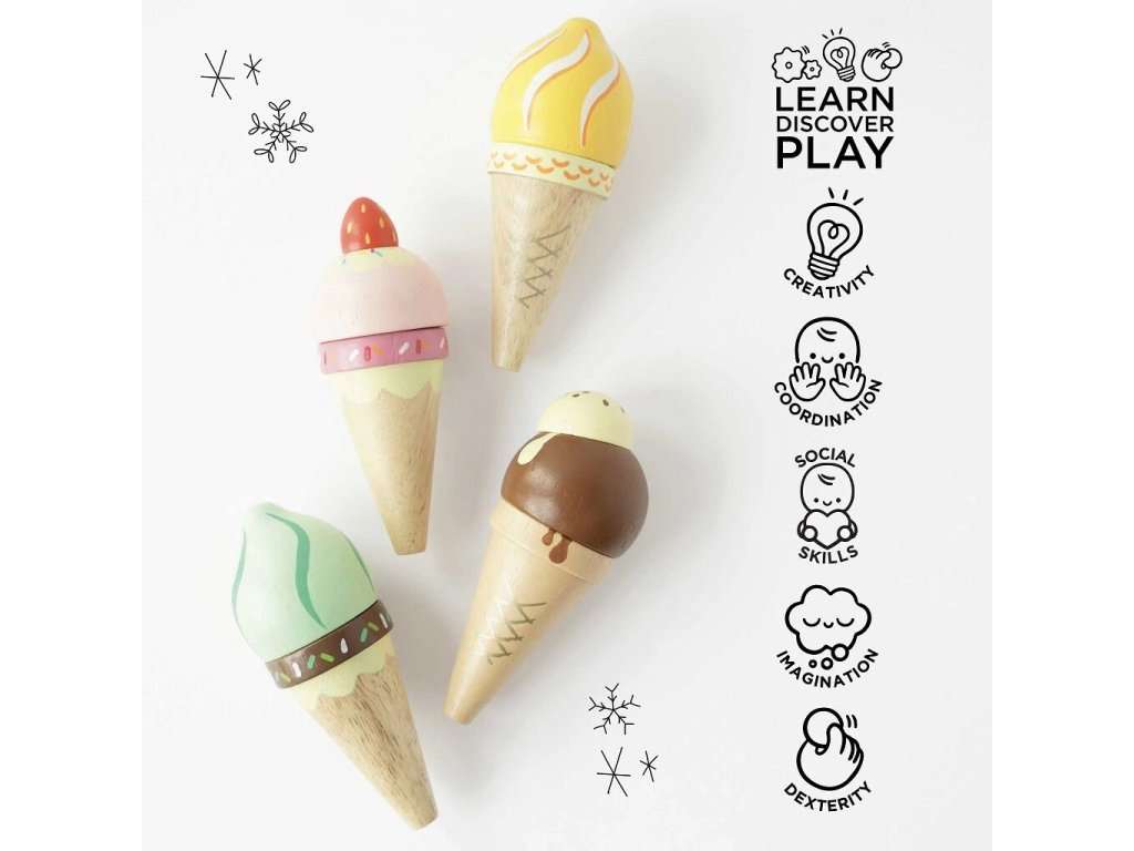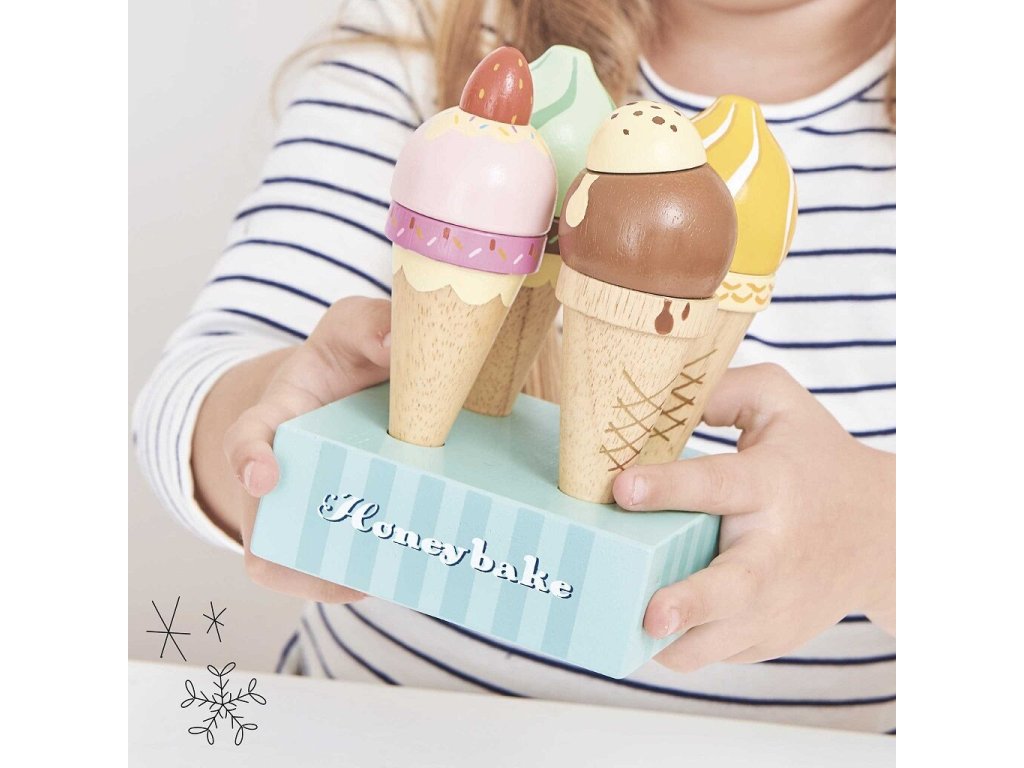 Jednu čokoládovou! S touto sladkou sadou čtyř ručně malovaných kornoutů zmrzliny budou děti moci servírovat osvěžení při představivé hře. Krásně zdobené kornouty zmrzliny jsou vyrobeny z masivního kaučukového dřeva, malovány realisticky s rozdílnými detaily a jsou doplněny o robustní dřevěný stojan. Při hře si děti procvičí koordinaci ruka-oko a jemnou motoriku. Hračky s účelemVšechny hračky firmy Le Toy Van jsou vyrobeny s cílem – aby dlouho vydržely. Designovány s láskou zkušenými řemeslníky za použití etických praktik a udržitelných materiálů, které jsou laskavější k naší planetě. Hlavní vlastnosti: vyrobeno eticky z udržitelného dřevatestováno dle nejpřísnějších standardůmalováno netoxickými barvami na bázi vodyinspiruje k představivé hřevhodné pro hru na role Honeybake kolekce: Hračky v této kolekci jsou vhodné k objevování, pomohou dětem s rozvojem představivosti, sociálních a verbálních dovedností a kognitivních funkcí. Tradiční design s moderními detaily děti jistě bude bavit. Honeybake je kolekce Le Toy Van, která vyhrála nejvíce ocenění, a to za design, kvalitu, bezpečnost a také za vzdělávací a herní hodnotu.