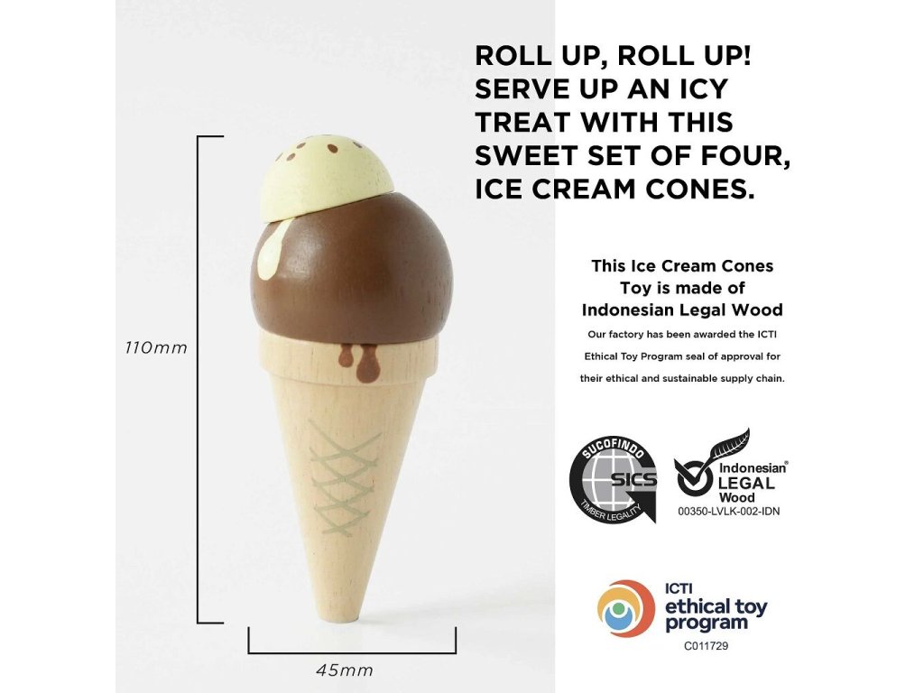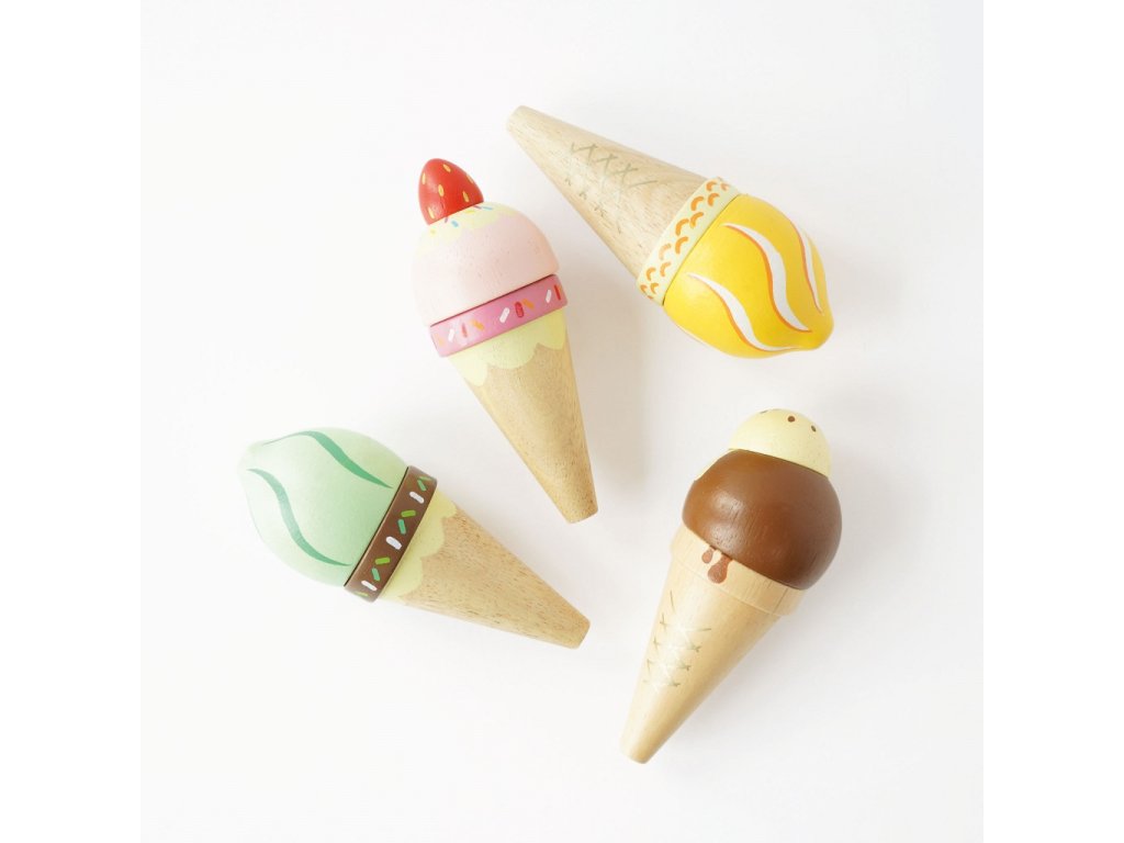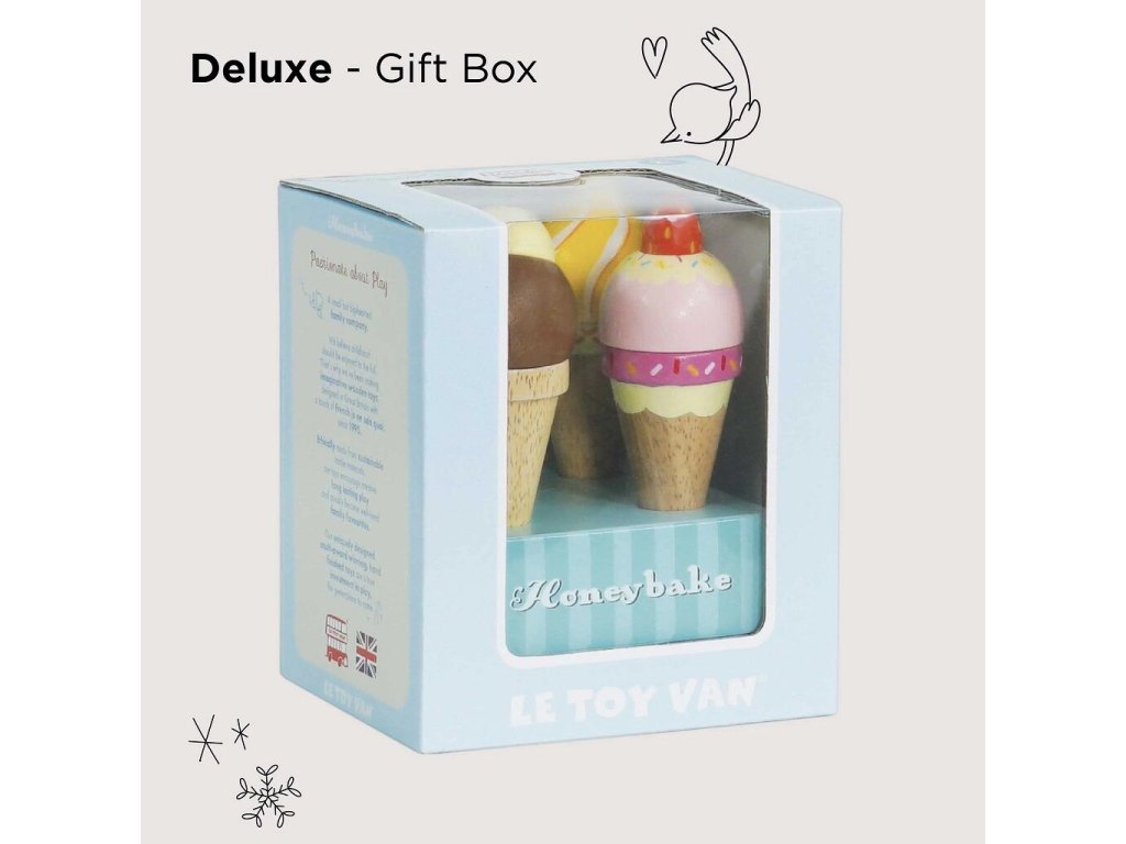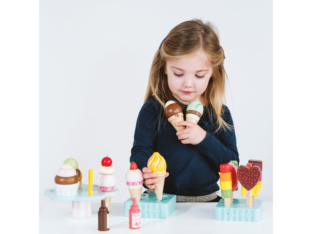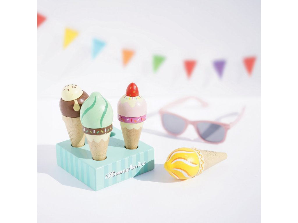 Jednu čokoládovou! S touto sladkou sadou čtyř ručně malovaných kornoutů zmrzliny budou děti moci servírovat osvěžení při představivé hře. Krásně zdobené kornouty zmrzliny jsou vyrobeny z masivního kaučukového dřeva, malovány realisticky s rozdílnými detaily a jsou doplněny o robustní dřevěný stojan. Při hře si děti procvičí koordinaci ruka-oko a jemnou motoriku. Hračky s účelemVšechny hračky firmy Le Toy Van jsou vyrobeny s cílem – aby dlouho vydržely. Designovány s láskou zkušenými řemeslníky za použití etických praktik a udržitelných materiálů, které jsou laskavější k naší planetě. Hlavní vlastnosti: vyrobeno eticky z udržitelného dřevatestováno dle nejpřísnějších standardůmalováno netoxickými barvami na bázi vodyinspiruje k představivé hřevhodné pro hru na role Honeybake kolekce: Hračky v této kolekci jsou vhodné k objevování, pomohou dětem s rozvojem představivosti, sociálních a verbálních dovedností a kognitivních funkcí. Tradiční design s moderními detaily děti jistě bude bavit. Honeybake je kolekce Le Toy Van, která vyhrála nejvíce ocenění, a to za design, kvalitu, bezpečnost a také za vzdělávací a herní hodnotu.