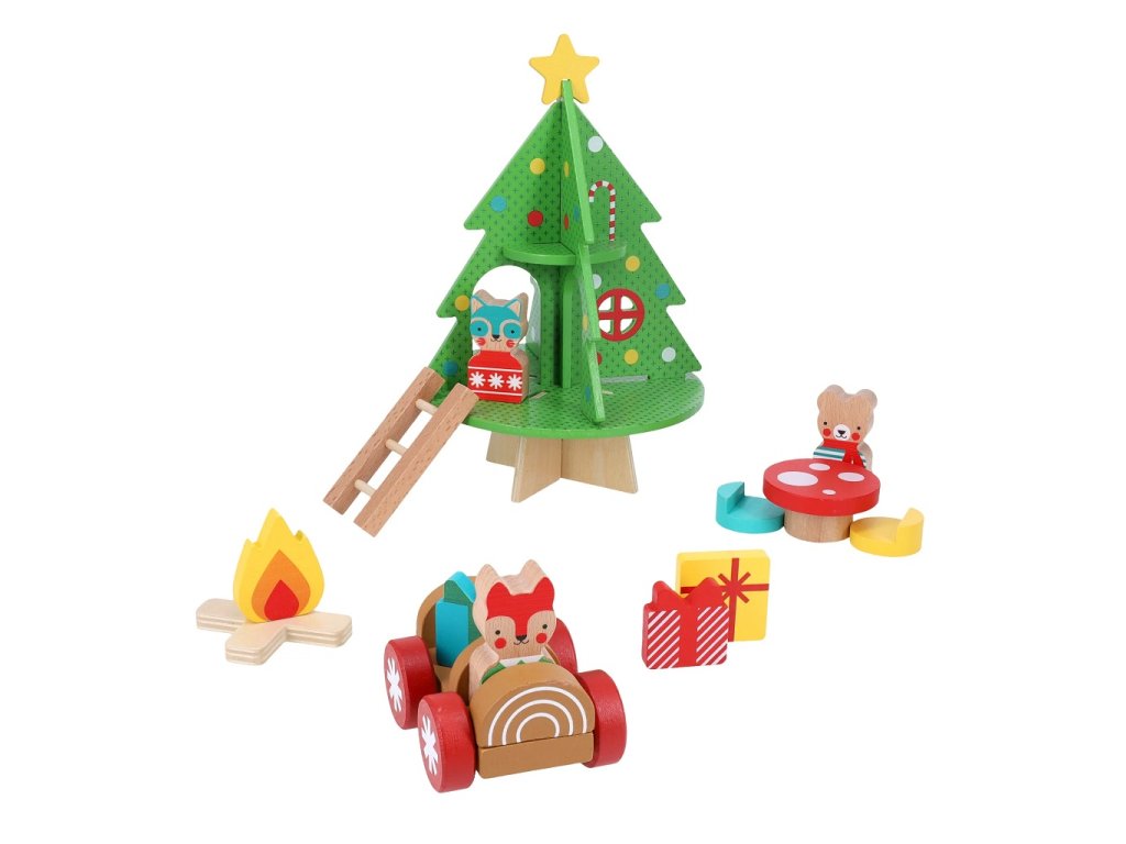 Vneste domů sváteční náladu a vytvořte si vánoční domeček na stromě! Vytvořte si útulné vánoční scény se třemi zvířecími kamarády - mývalem, veverkou a medvědem. Naložte dárky do vánočního vozu a vydejte se směrem k domečku na stromě, který už je připraven na svátky! Pak přistavte svým zvířecím kamarádům židličky kolem stolu ve tvaru houby a usaďte je u táboráku, ať si užijí třeba čtení pohádek. Tato roztomilá dřevěná sada rozvíjí emoční vnímání, zlepšuje jemnou motoriku a podporuje nápadité vyprávění příběhů a samostatnou hru. Ideální pro děti od 12 měsíců. Děti si mohou s domkem na stromě, autíčkem, dárky, sadou stolu a židlí, táborákem a třemi dřevěnými lesními zvířátky vytvořit nádherné zimní scenérie. Jednoduše složte dílky dohromady a užijte si vánoční atmosféru. Hlavní vlastnosti: vánoční skládačka pro nejmenšívyrobeno z FSC dřevarozvíjí jemnou motorikupodporuje koordinaci ruka-oko Značka a certifikát FSC® (Forest Stewardship Council) zaručuje, že dřevo, ze kterého byl produkt vyroben, nebylo vytěženo nelegálně a pochází z lesů obhospodařovaných šetrným či přírodě blízkým způsobem, ve kterém jsou dodržovány přísné environmentální a sociální požadavky. Značka FSC® na výrobku znamená, že svým nákupem pomáháte chránit lesy a podporujete šetrné, odpovědné či přírodě blízké hospodaření, díky kterému jsou naše lesy stabilnější, zdravější, mají přirozenou druhovou skladbu a lépe odolávají negativním následkům klimatických změn.