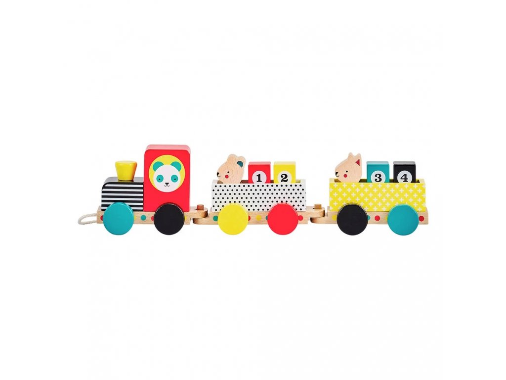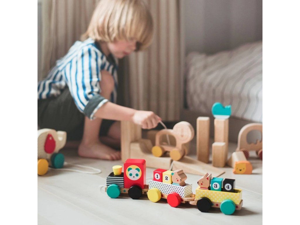 Nastupte si do tohoto krásného barevného vlaku! Moderní pojetí klasické hračky. Tahací vláček má mašinku a dva vagóny, čtyři kostky s číslicemi a dva zvířecí pasažéry. Hlavní vlastnosti: Trénuje koordinaci ruka-okoRozvíjí hrubou a jemnou motorikuVyrobeno z udržitelného dřevaObal je recyklovatelný