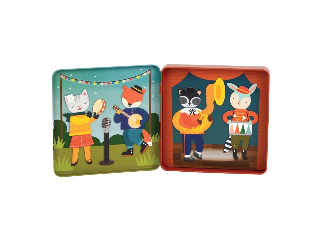 Připněte magenty do knížky, mixujte různé dílky a vytvářejte postavičky zvířecích hudebníků! Balení obsahuje přes 25 magnetických dílků, s kterými si děti dokáží vyhrát. Zabaleno v plechové krabičce, která se dá pevně zavřít, perfektní hračka na cesty. Plechová krabička má uvnitř na stěnách dvě scenérie. Hlavní vlastnosti: Podporuje představivost dětíNatisknuto netoxickými barvamiSplňuje všechny bezpečnostní normy