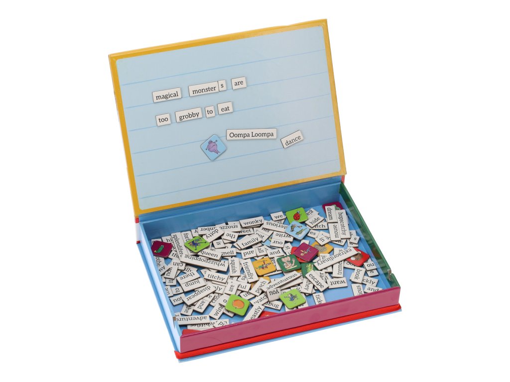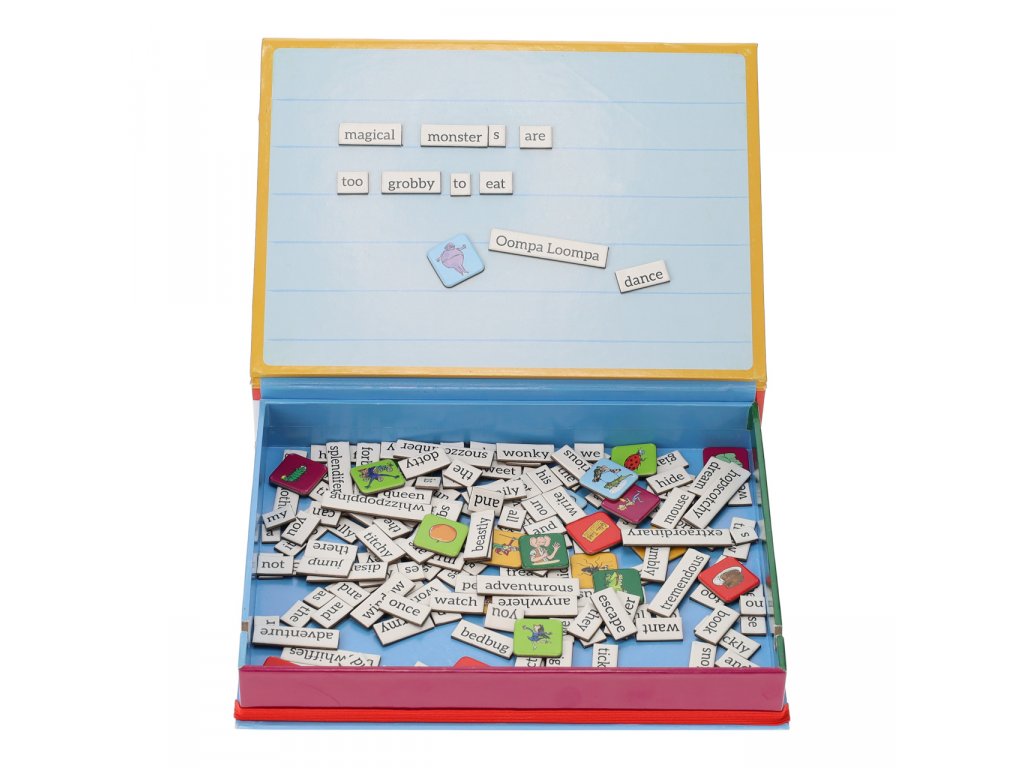 Sestavte rozverný příběh, nebo báseň pomocí pojmů užívaných v knihách Roalda Dahla. Vybírejte ze stovek magnetek se slovy a obrázky, sázejte je do řádků a tvořte originální sousloví. Hru zdobí původní, originální ilustrace z knih. Je v anglickém jazyce a je vhodnou pomůckou k procvičování angličtiny. Tabulka je společně s magnetky uložena v praktické krabičce, a je tak připravena Vás doprovázet i na cestách. Vyrobeno z udržitelně získaného papíru, potištěno rostlinnými inkousty. Hlavní vlastnosti:tabulka a 200 magnetekvhodné k procvičování angličtinyilustrace sira Quentina Blakeavyrobeno ze 100% FSC® certifikovaného papírupotištěno rostlinnými inkousty Značka a certifikát FSC® (Forest Stewardship Council) zaručuje, že dřevo, ze kterého byl produkt vyroben, nebylo vytěženo nelegálně a pochází z lesů obhospodařovaných šetrným či přírodě blízkým způsobem, ve kterém jsou dodržovány přísné environmentální a sociální požadavky. Značka FSC® na výrobku znamená, že svým nákupem pomáháte chránit lesy a podporujete šetrné, odpovědné či přírodě blízké hospodaření, díky kterému jsou naše lesy stabilnější, zdravější, mají přirozenou druhovou skladbu a lépe odolávají negativním následkům klimatických změn.
