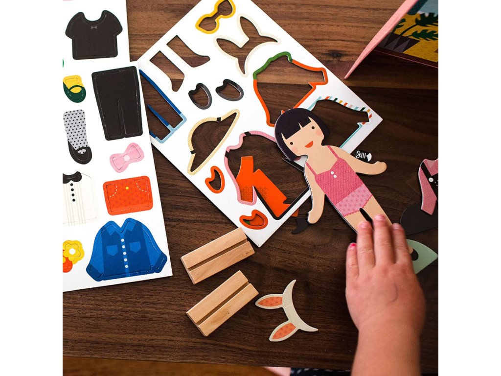 Sada oblékacích dívek v krabičce uzavíratelné magnetem s 27 ks magnetických částí - dopřejte Vašemu dítěti vytvořit až 80 různých kreativních kombinací moderních outfitů. Hlavní vlastnosti: 2 velké dívky 2 dřevěné stojánky27 magnetických částí