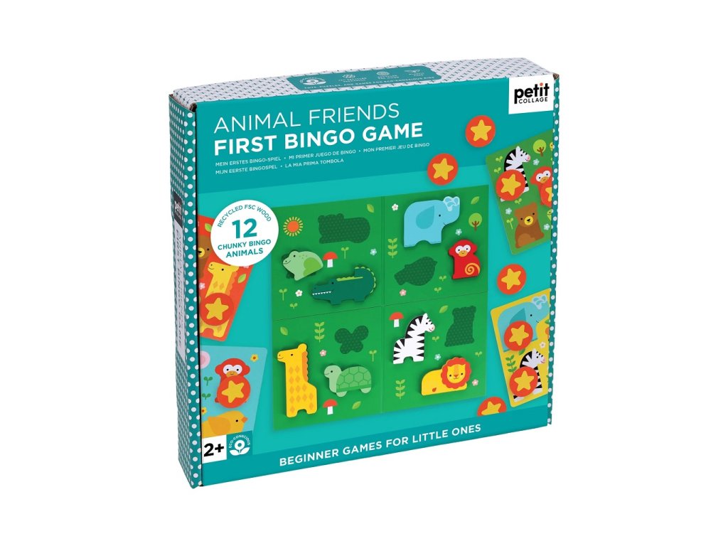 Buďte první! Roztomilá verze klasické hry. Děti si užijí spoustu zábavy při vytahování velkých dřevěných zvířátek z pytle, křičení jejich jmen a jejich přiřazování k příslušným místům na hrací desce. Mezitím ostatní hráči hledají zvířátka na svých bingo kartách a zakrývají všechna shodná zvířátka žetony. První hráč, který zakryje všech pět tvorů na své kartě a zakřičí „Bingo!“, vyhrává. Tato hra pro začátečníky, ideální pro 2–4 hráče ve věku 2+, je navržena tak, aby děti seznámila s principy střídání hráčů a s tím, jak vyhrávat a prohrávat s grácií. Zároveň podpoří jejich pozorovací schopnosti, rozvoj řeči a jazyka, trpělivost a schopnost soustředění. Figurky zvířat jsou vyrobeny z recyklovaného dřeva FSC a taška je vyrobena z recyklovaného plastu. Obal je potištěn ze 75 % recyklovaných materiálů a rostlinnými inkousty. Obsah balení: 12 dřevěných figurek zvířátek, 4 bingo karty, 3 archy žetonů bodů, herní plán, bingo sáček s herními figurkami a návod v angličtině, holandštině, francouzštině, němčině, italštině a španělštině. Hlavní vlastnosti: klasická hra pro malé hráčevhodné pro 2-4 hráčepodporuje pozorovací schopnostinapomáhá rozvoji řečirozvíjí trpělivost a soustředěnívyrobeno ze dřeva s certifikací FSC Značka a certifikát FSC® (Forest Stewardship Council) zaručuje, že dřevo, ze kterého byl produkt vyroben, nebylo vytěženo nelegálně a pochází z lesů obhospodařovaných šetrným či přírodě blízkým způsobem, ve kterém jsou dodržovány přísné environmentální a sociální požadavky. Značka FSC® na výrobku znamená, že svým nákupem pomáháte chránit lesy a podporujete šetrné, odpovědné či přírodě blízké hospodaření, díky kterému jsou naše lesy stabilnější, zdravější, mají přirozenou druhovou skladbu a lépe odolávají negativním následkům klimatických změn.