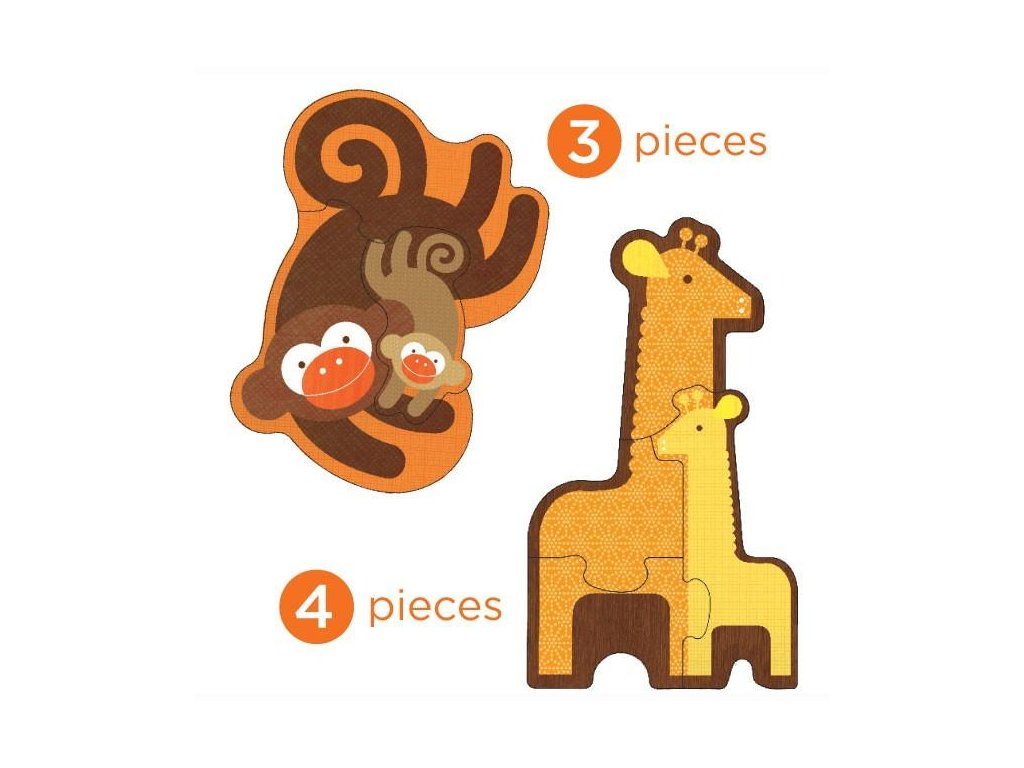 Puzzle, které může růst s Vaším dítětem, zahrnuje čtyři skládačky v různých stupíncích obtížnosti. Baleno v praktické krabičce z recyklovaného kartonu, vybavené provázkovým uchem. Hlavní vlastnosti: 4 zvířátka, 18 dílků celkem (3–6 dílků skládačka)praktické balení
