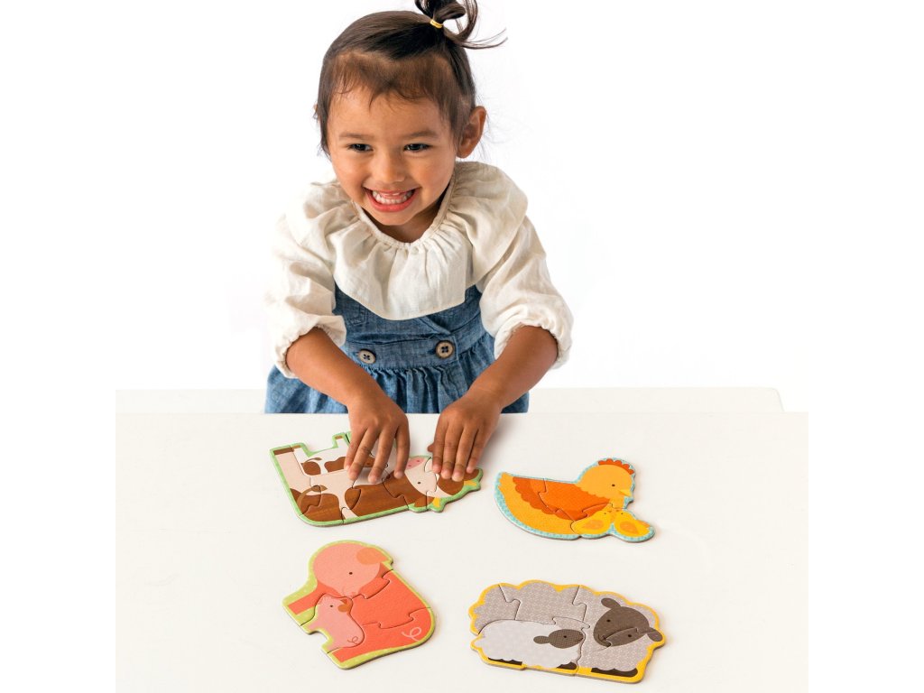 Puzzle, které může růst s Vaším dítětem, zahrnuje čtyři skládačky v různých stupíncích obtížnosti. Baleno v praktické krabičce z recyklovaného kartonu, vybavené provázkovým uchem. Hlavní vlastnosti: 4 zvířátka, 18 dílků celkem (3–6 dílků skládačka)praktické balení