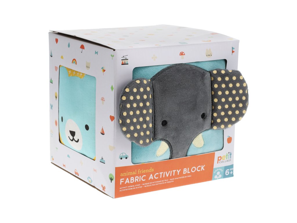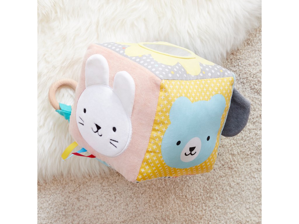 Měkká a hebká kostka provedením stimuluje hmat nejmenších. Je vyvedena v kontrastních barvách a vybavena rolničkou, aby poutala pozornost. Na stěnách jsou vyobrazeny přátelské obličeje zvířátek, které stimulují zvědavost vyčnívajícími oušky. Kostka je také vybavena zrcátkem, dozdobena několika stuhami a vybavena dřevěným kroužkem sloužícím jako kousátko. Je vyrobena z organické bavlny a plněná materiálem z recyklovaných plastových lahví. Hlavní vlastnosti: měkké a hebké provedeníobsahuje rolničku, zrcátko a kousátkonízká hmotnost