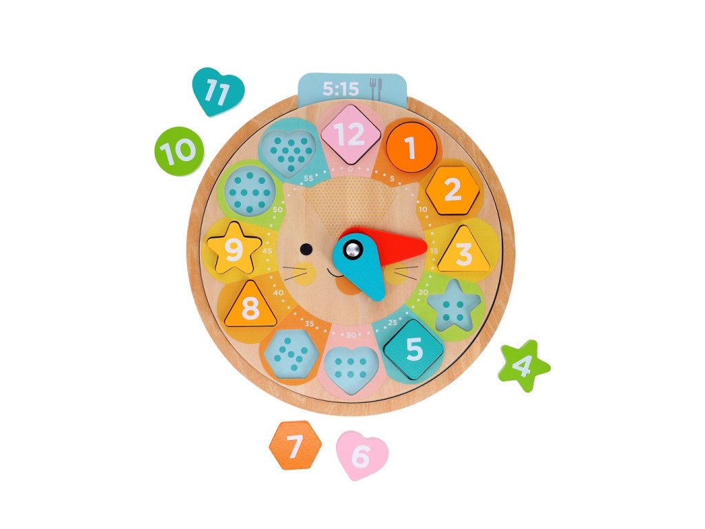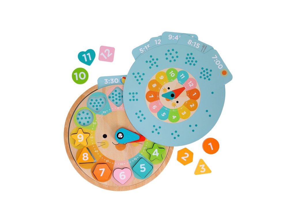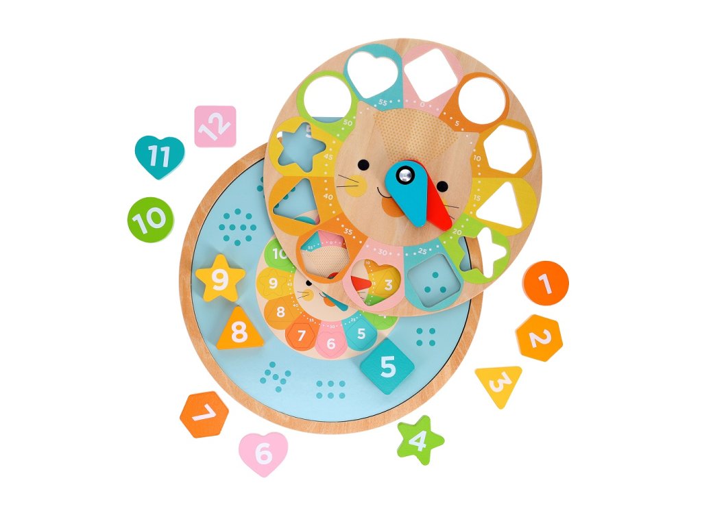 Naučte se číst čas, poznávat tvary a počítat s těmito vícejazyčnými hodinami s motivem lva. Obsahuje 12 dřevěných tvarů a 3 oboustranné listy, které odpovídají každému jazyku: angličtině, němčině, španělštině, francouzštině, holandštině a italštině. Stačí zvednout horní část skládačky a snadno přepnout jazyk. Hlavní vlastnosti: vícejazyčné hodinyprocvičují motorické schopnostiučí poznávat barvy,tvary a počítatvěk od 18 měsíců