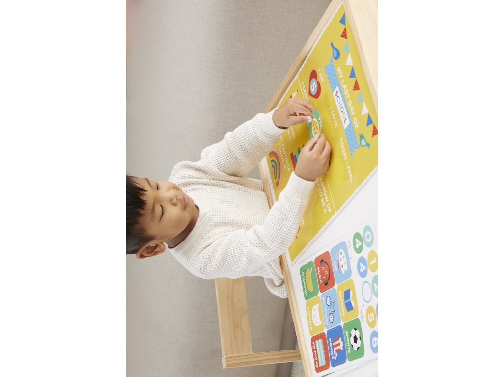 Učiňte velký den Vašich dětí opravdu nezapomenutelným! Znovupoužitelné samolepky jsou skvělou pomůckou nejen pro děti chodící do 1. až 3. třídy. Mohou si vybrat z 97 samolepek, které posléze nalepí na oboustranný list. List má např. kolonky pro věk, výšku, cíl, náladu či oblíbenou barvu. Jaký byl první den v novém školním roce? A co teprve poslední? Hlavní vlastnosti: kompaktní a lehký, ideální pro malé školáky od 1. až 3. třídy (vhodný i pro předškoláky)zahrnuje oboustranný list s 6 stránkami papírových samolepek (celkem 97)vyrobeno z papíru FSC Značka a certifikát FSC® (Forest Stewardship Council) zaručuje, že dřevo, ze kterého byl produkt vyroben, nebylo vytěženo nelegálně a pochází z lesů obhospodařovaných šetrným či přírodě blízkým způsobem, ve kterém jsou dodržovány přísné environmentální a sociální požadavky. Značka FSC® na výrobku znamená, že svým nákupem pomáháte chránit lesy a podporujete šetrné, odpovědné či přírodě blízké hospodaření, díky kterému jsou naše lesy stabilnější, zdravější, mají přirozenou druhovou skladbu a lépe odolávají negativním následkům klimatických změn.