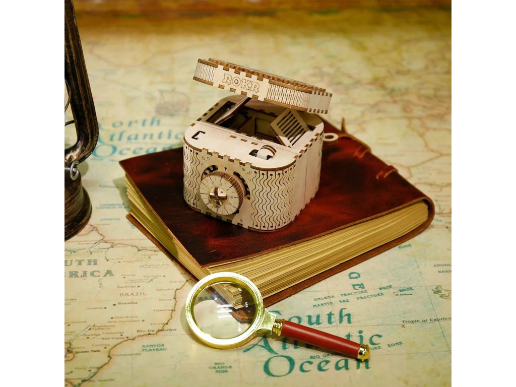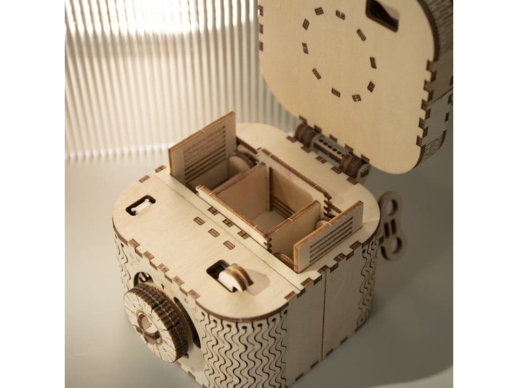 Pro všechny Vaše miláčky. Stavebnice šperkovnice z překližky. Nabízí dvojici přihrádek, méně zabezpečenou ve víku a kódem zajištěnou hlavní přihrádku v těle skříňky. Prostor ve víku lze otevřít pootočením kola na jeho svrchní straně. Hlavní prostor lze zajistit trojmístným kódem, je možno uživatelsky zvolit jednu z mnoha stovek číselných kombinací. K otevření zadejte první číslici otáčením proti směru hodinových ručiček, druhou ve směru opačném, vpravo, a nakonec třetí opět otáčením doleva. Po zadání kódu je nutno ještě zvlášť určeným klíčem prostor otevřít. Jedinečný dárek pro všechny milovníky kutilství, luxusní interiérová dekorace do pokoje či kanceláře. Skládačka je dodávána v nesloženém stavu, balena v krabici. Vybaveno detailním návodem k sestavení. Hlavní vlastnosti:123 precizně vyřezaných dílkůstřední obtížnost sestavenítrojmístný, uživatelsky volený kódúložný prostor