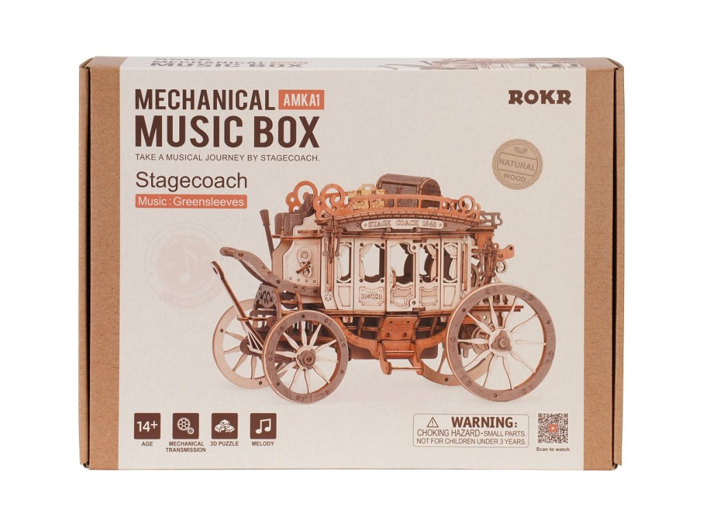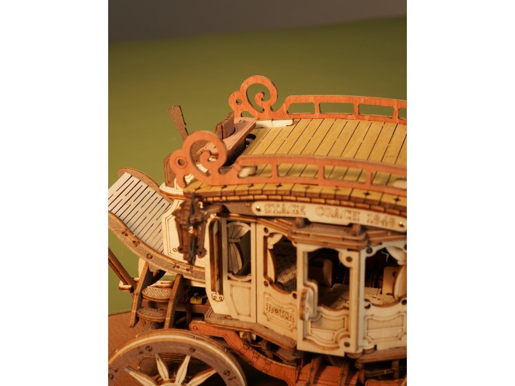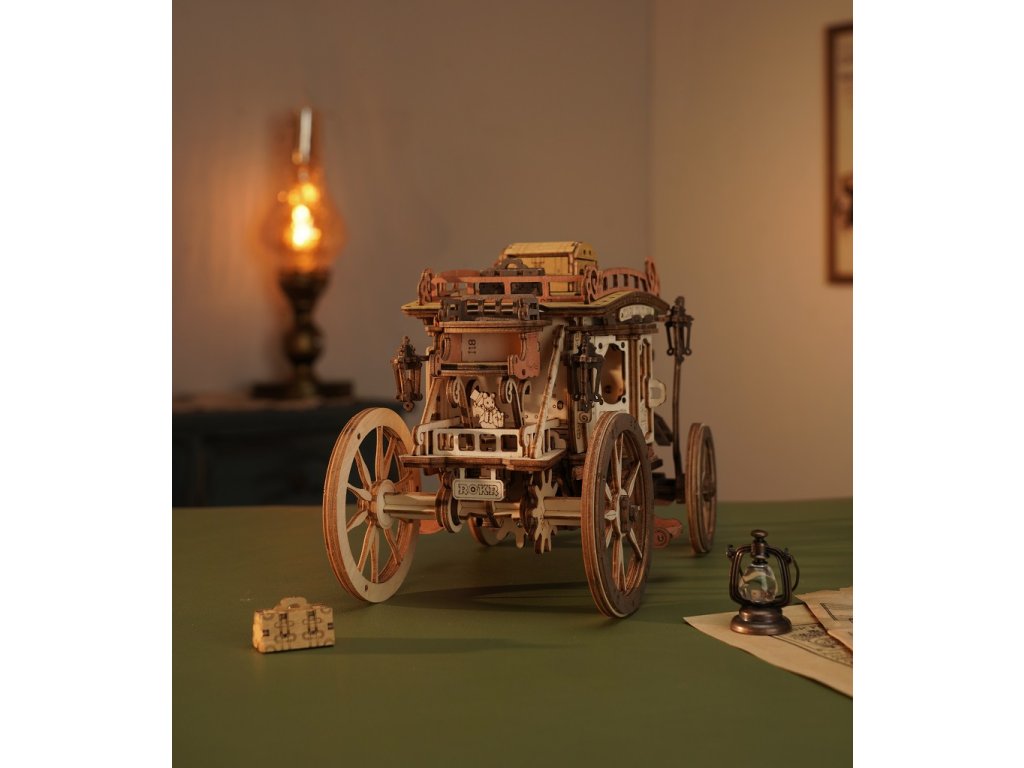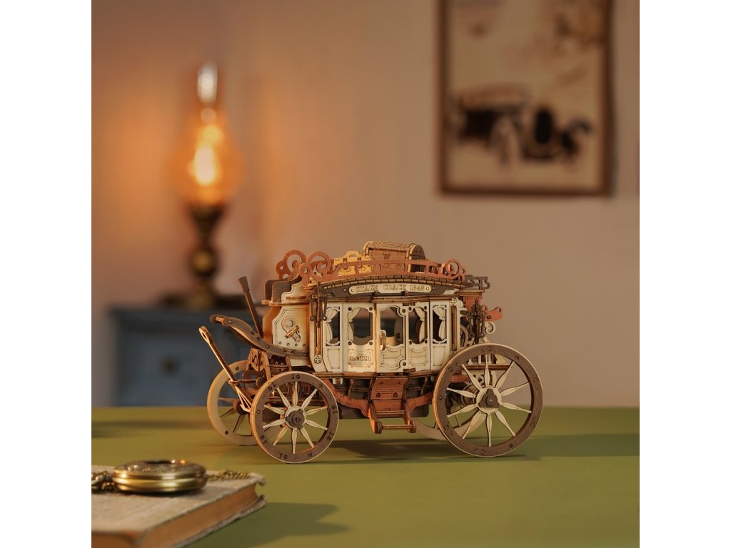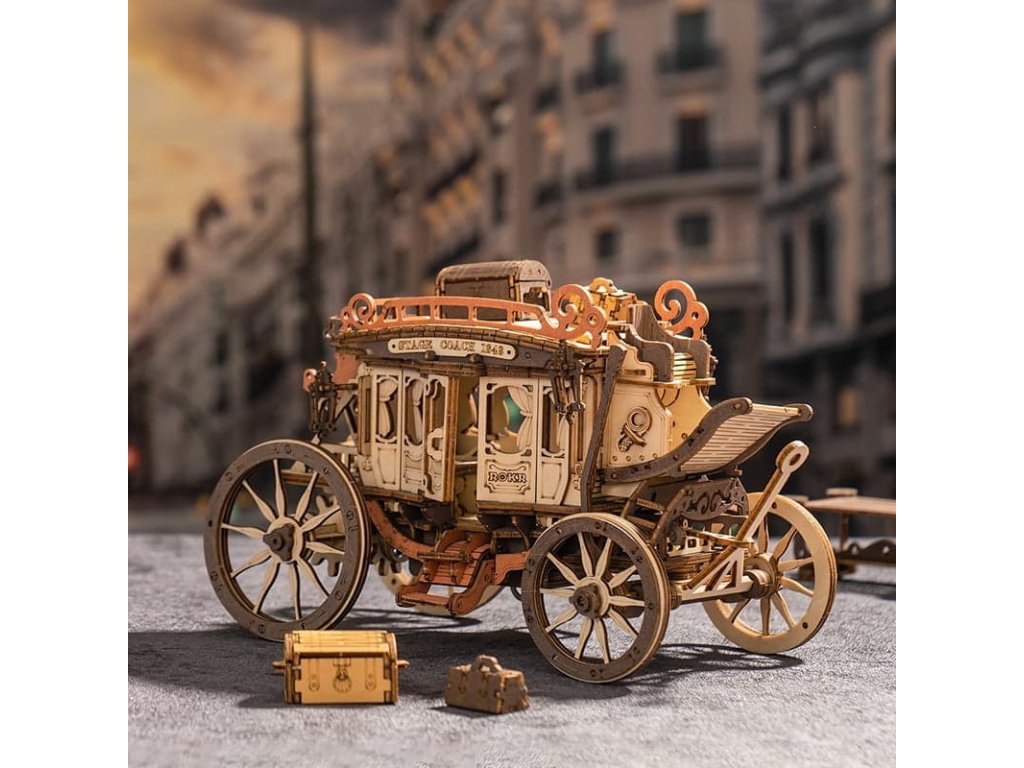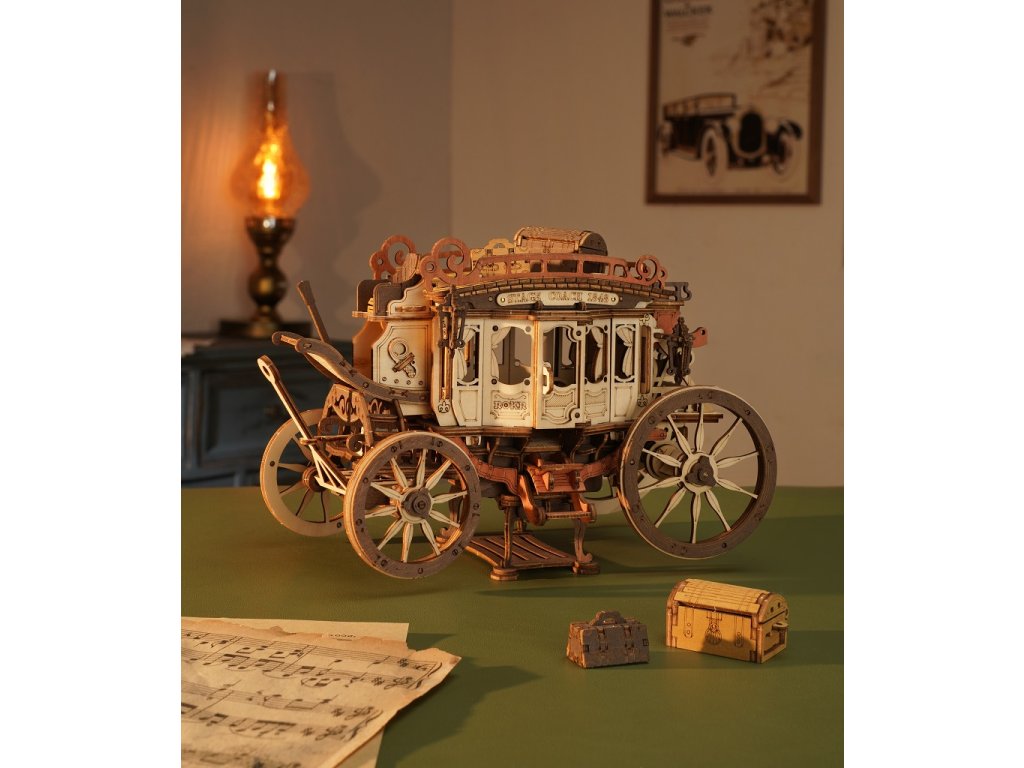 Vraťte se zpět do éry koňských povozů! Užijte si cestu s pohledem na krásy 19. století v starobylém dostavníku a nechte se konejšit tajemnou melodií. Tento krásný kousek je inspirován typickými dostavníky dané doby. Originální, zdobný vzhled je doprovázen řadou praktických funkcí - robustní odolná karoserie, obrovská kola a přívětivý prostor, jenž pojme všechna Vaše zavazadla! Během projížďky si užijete nejen nádhernou hudbu, ale také uvidíte, jak se zpoza kočáru loučí pan Veverka. Přední kola mají funkci natáčení - což umožňuje se přizpůsobit různým podmínkám. Jedinečnost této hrací skříňky spočívá v její přesné mechanické struktuře uvnitř, která vyžaduje pouze otáčení pružiny pro pohyb vozíku vpřed. Vosk není součástí balení (můžete např. použít obyčejné svíčky, voskovky, včelí vosk či jiný podobný materiál). Skládačky hracích skříněk Robotime jsou nabízeny v mnoha podobách, přírodních i barevných, lišících se nápaditými pohyblivými detaily doprovázejícími zvuk. Nezaskočí Vás svou náročností a po sestavení zkrášlí poličku. Nechejte se unášet známými melodiemi, každá skříňka hraje jinou, odpovídající své výsledné podobě. Hlavní vlastnosti: 199 precizně vyřezávaných dílůdoba sestavení cca 4 hodinydřevo je přírodní a ekologicky šetrnéstřední obtížnost sestavenívhodné od 14 let