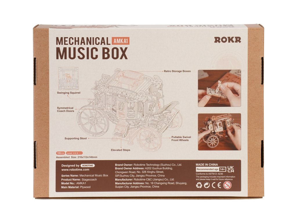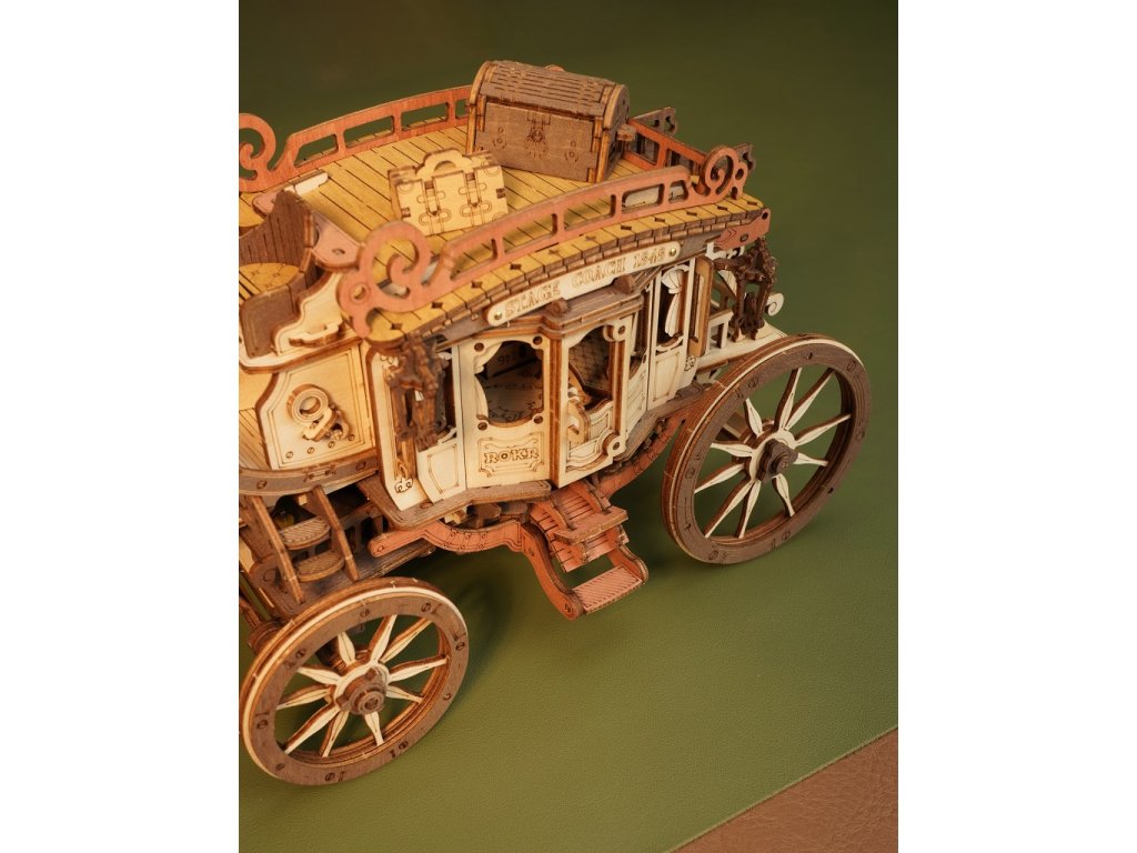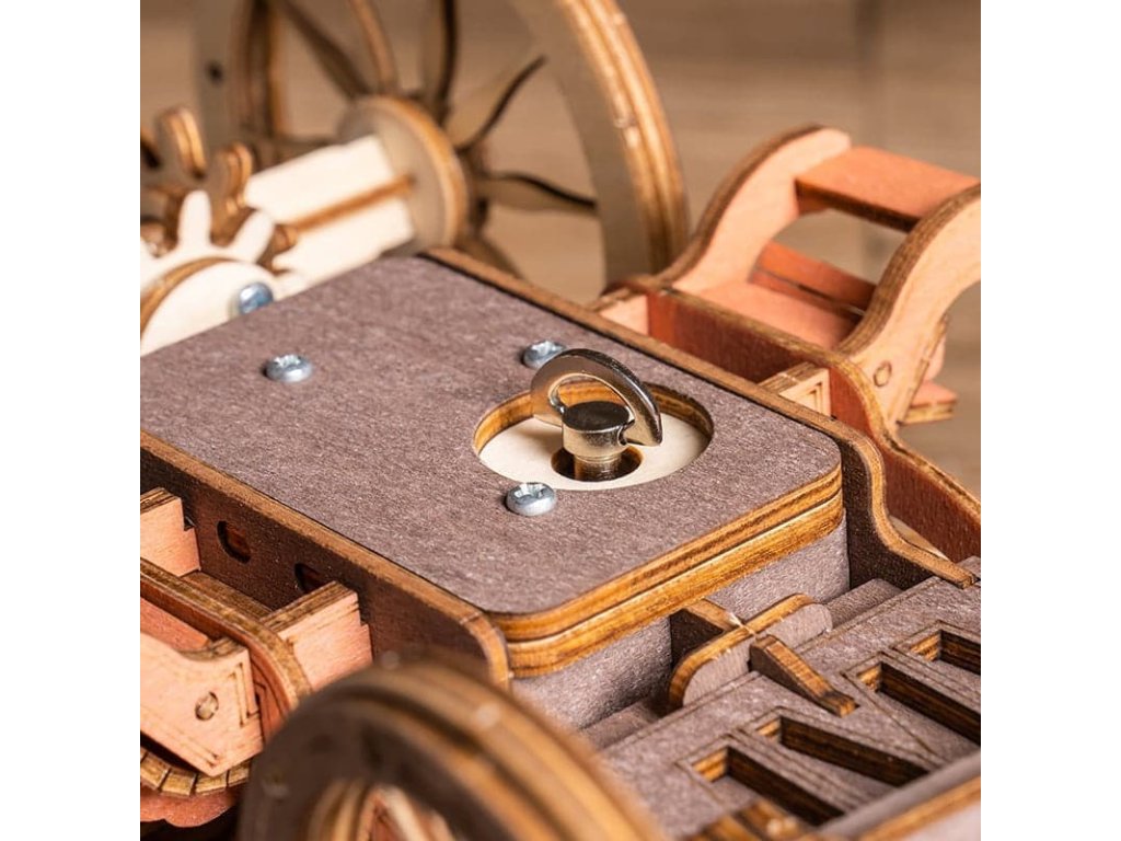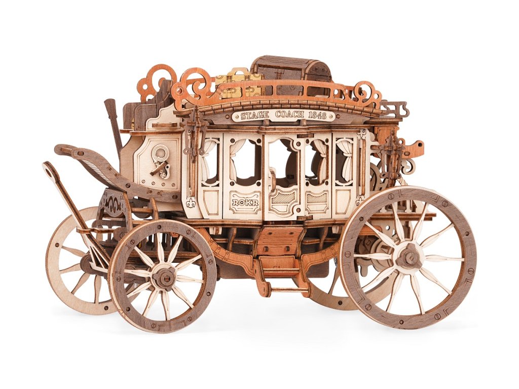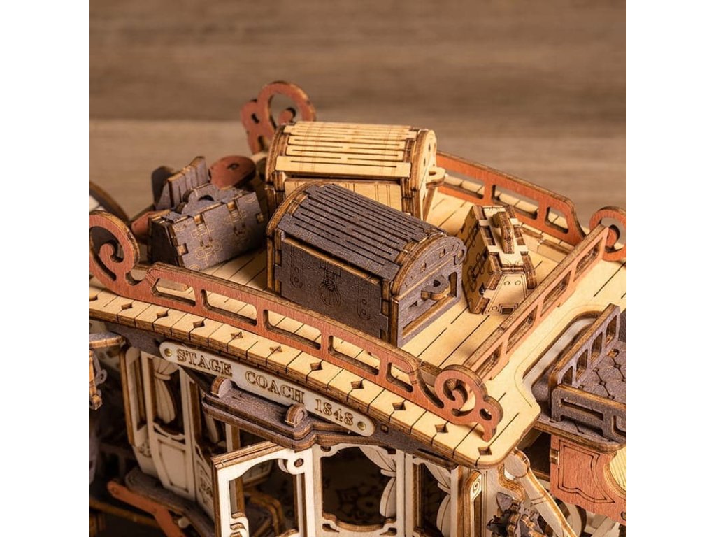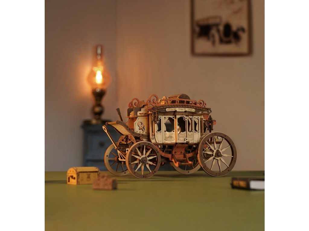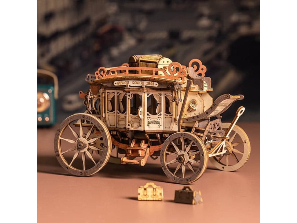 Vraťte se zpět do éry koňských povozů! Užijte si cestu s pohledem na krásy 19. století v starobylém dostavníku a nechte se konejšit tajemnou melodií. Tento krásný kousek je inspirován typickými dostavníky dané doby. Originální, zdobný vzhled je doprovázen řadou praktických funkcí - robustní odolná karoserie, obrovská kola a přívětivý prostor, jenž pojme všechna Vaše zavazadla! Během projížďky si užijete nejen nádhernou hudbu, ale také uvidíte, jak se zpoza kočáru loučí pan Veverka. Přední kola mají funkci natáčení - což umožňuje se přizpůsobit různým podmínkám. Jedinečnost této hrací skříňky spočívá v její přesné mechanické struktuře uvnitř, která vyžaduje pouze otáčení pružiny pro pohyb vozíku vpřed. Vosk není součástí balení (můžete např. použít obyčejné svíčky, voskovky, včelí vosk či jiný podobný materiál). Skládačky hracích skříněk Robotime jsou nabízeny v mnoha podobách, přírodních i barevných, lišících se nápaditými pohyblivými detaily doprovázejícími zvuk. Nezaskočí Vás svou náročností a po sestavení zkrášlí poličku. Nechejte se unášet známými melodiemi, každá skříňka hraje jinou, odpovídající své výsledné podobě. Hlavní vlastnosti: 199 precizně vyřezávaných dílůdoba sestavení cca 4 hodinydřevo je přírodní a ekologicky šetrnéstřední obtížnost sestavenívhodné od 14 let