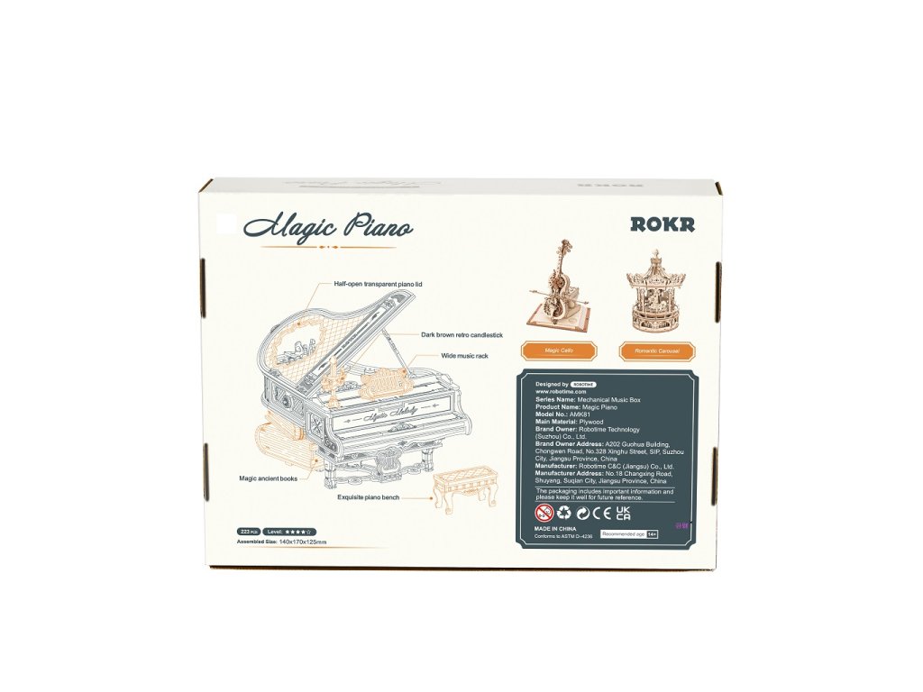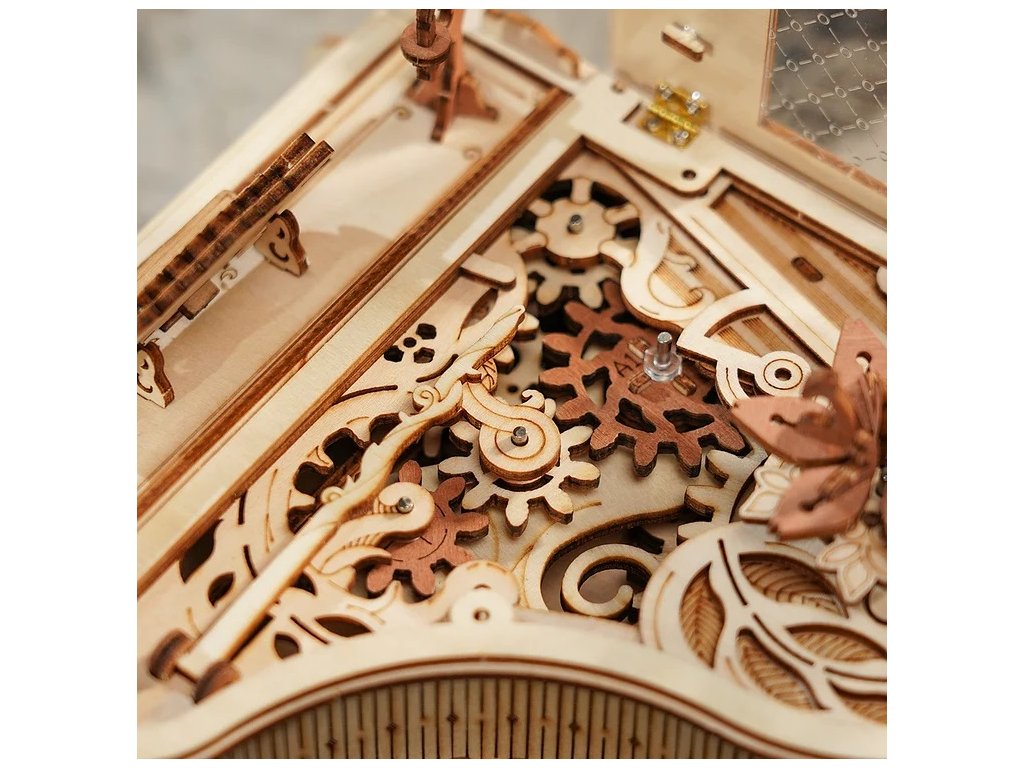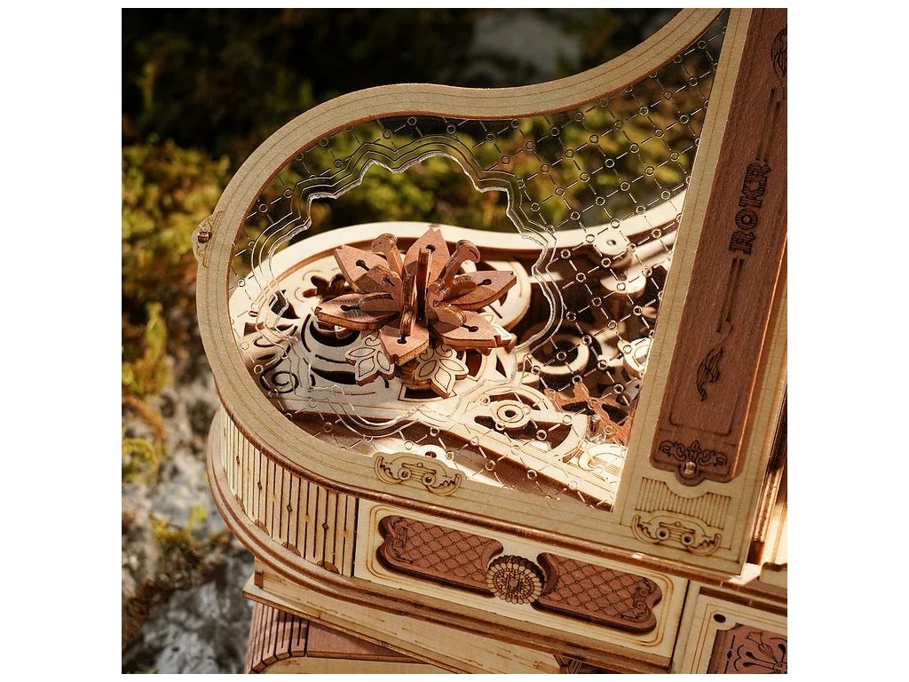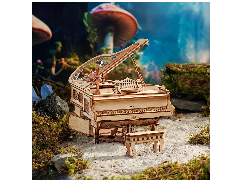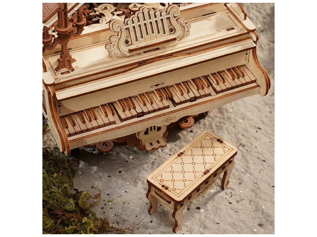 Ponořte se do kouzelného světa magických melodií s mechanickou hrací skříňkou "Magic piano" - 3D dřevěné mechanické puzzle RoboTime Dřevěné mechanické puzzle Kouzelné piáno (mechanický pohon). Jemný model potřebuje vaši trpělivost a soustředění. Je to praktický způsob, jak procvičit logické myšlení a jemné motorické dovednosti. Podporuje trpělivost, ale výsledná práce stojí za to. Piáno má množství viktoriánských zdobených a elegantních vzorů, reliéfů a drobných dekorací - tmavě hnědý vintage svícen, vintage hnědý šestilistý květ, otáčející se při melodii natahovacího knoflíku a s roztomilou kočičkou sedící pod piánem. Pootevřené víko je vyrobeno z průhledného akrylu, imitující křištál (zdobeno složitými vzory na povrchu). Knihy podpírající pevné tělo piána mají na hřbetě jasnou a přirozenou texturu. Přesná mechanika je skryta uvnitř těla, poháněná ozubenými kolečky. Ty ovládají i některé klávesy (zvedají se a klesají). Po sestavení Vám bude odměnou jemný, elegantní model. Je to skvělý dárek ideální pro zvláštní příležitosti, nebo jako jedinečná dekorace. Dodáváno v nesloženém stavu s podrobným návodem k sestavení. Jednoduchým navinutím klíče se uvedou ozubená kola do pohybu a začne hrát hudba. Nastává tak fascinující tanec propojených mechanismů a hudby. Hlavní vlastnosti: navrženo na základě koncertního křídla síně slávyrozvíjí jemnou motoriku, logické myšlení a trpělivost223 precizně vyřezaných dílkůdoba sestavení cca 4,5 hodinyobtížnost: pokročilá
