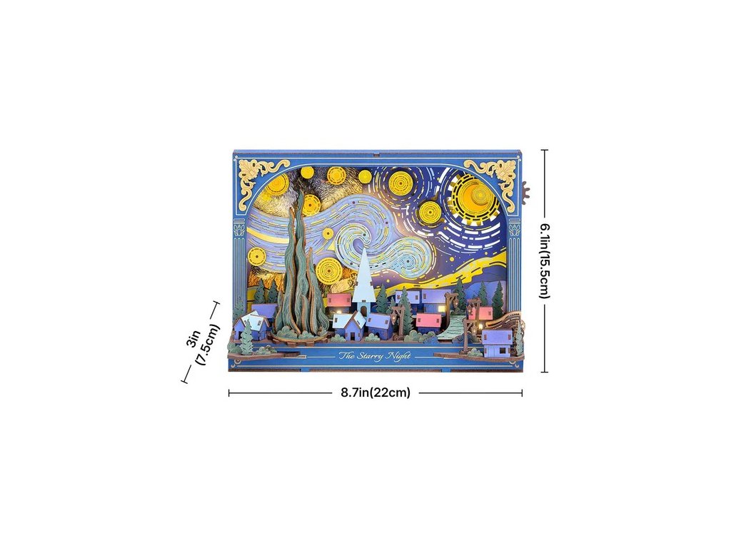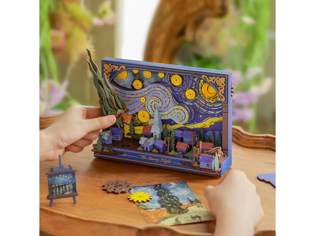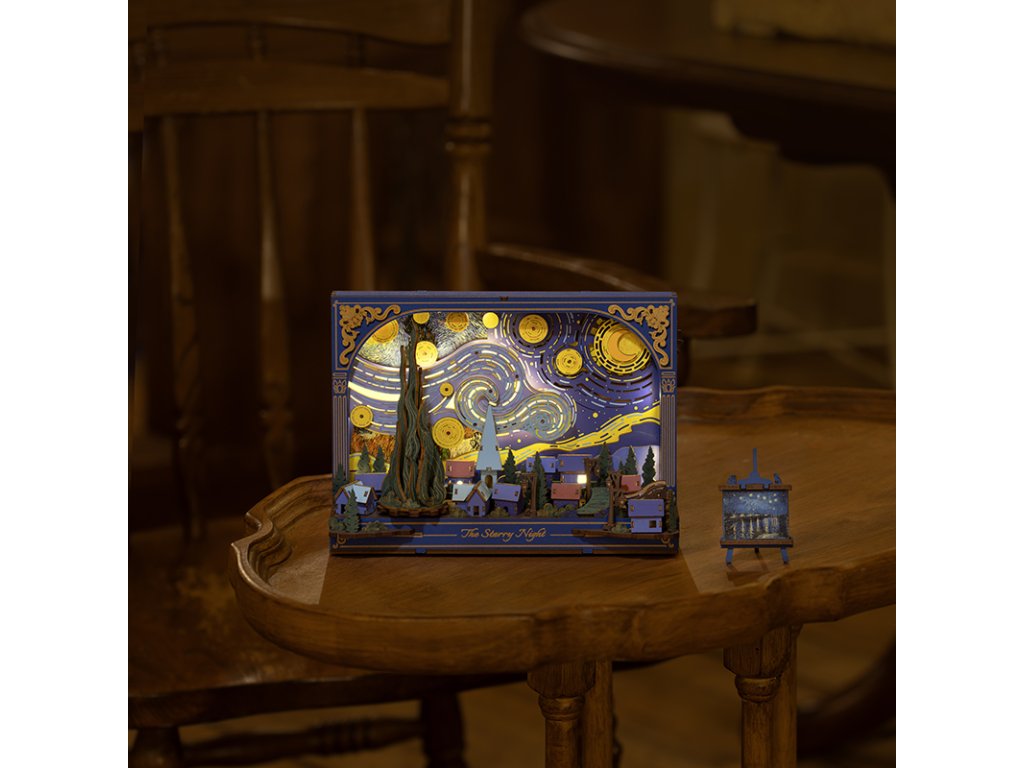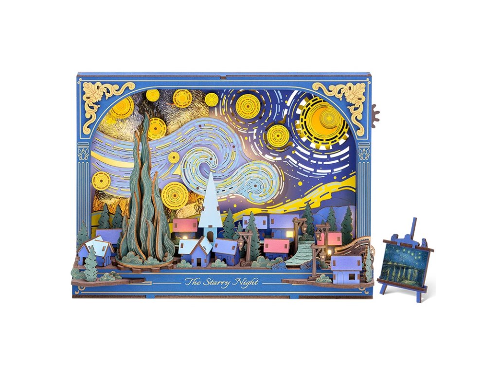 Dřevěná 3D skládačka Hvězdná noc nabízí jedinečný pohled na klidný soumrak z neobvyklé perspektivy. Mohutné mraky se vlní a splývají s noční oblohou nad tichou, spící vesnicí, zatímco hravé mechanické detaily, jako jsou hvězdy a měsíc poháněné ozubenými koly, otočný cypřiš či pohyblivé kolo vozu, dodávají této dřevěné stavebnici život a hloubku. Skládačka slouží jako stylová stolní dekorace s vyměnitelným pozadím, které umožňuje měnit atmosféru a nabízet stále nový vizuální dojem. Jemné dýchající podsvícení v pozadí vytváří hřejivé světlo, které zvýrazňuje detaily celé scény a proměňuje tuto dekoraci v okouzlující noční lampičku. Hvězdná noc vnese do interiéru kouzelnou atmosféru, rozzáří večery a dodá každodennímu prostoru nádech fantazie a barev. Hlavní vlastnosti: 238 dílkůdoba skládání 3 hodinyLED osvětlení2x baterie AAA/LR03/AM4 1,5 V (nejsou součástí balení)nízká obtížnost sestaveníbez použití lepidlavýjimečný a realistický vzhledvhodná jako dekorace na poličku nebo zeďrozvíjí logické a motorické dovednostipodporuje trpělivost dětíideální dárek nebo jedinečná dekorace