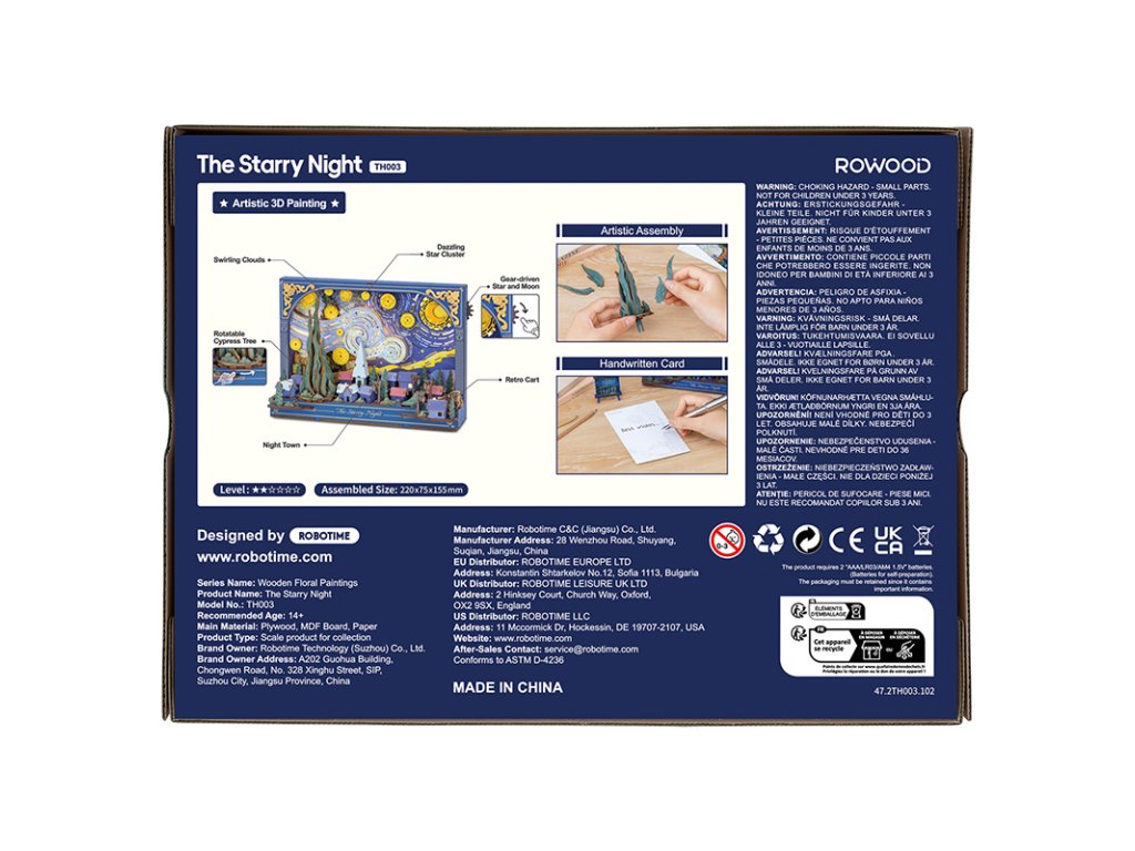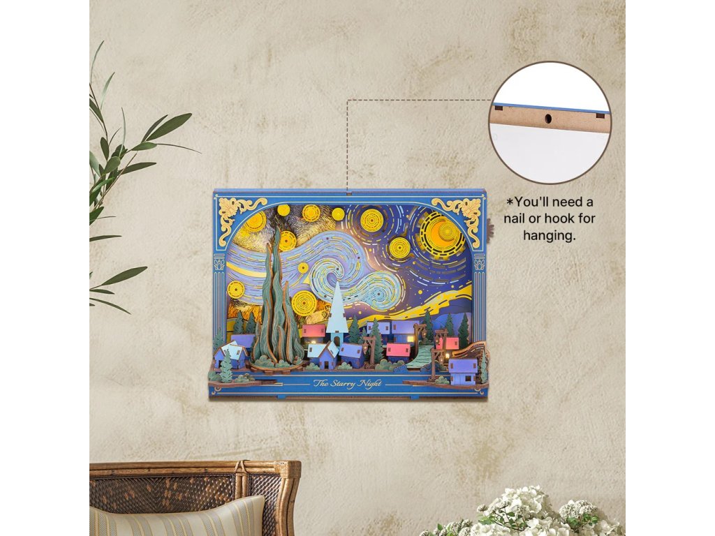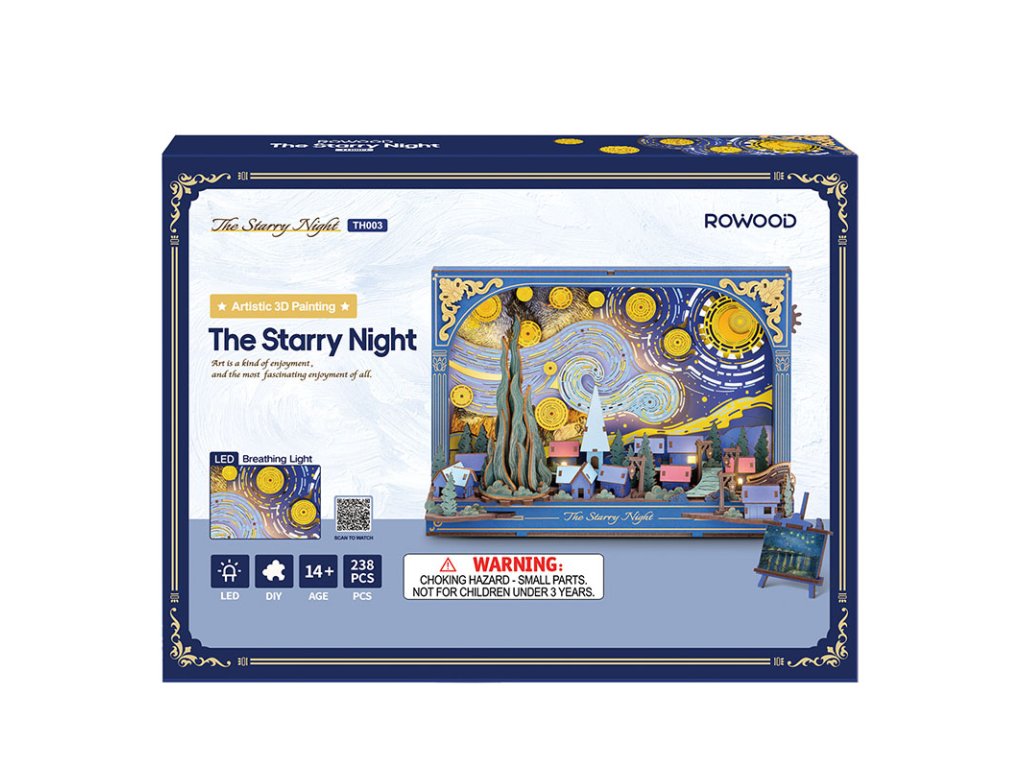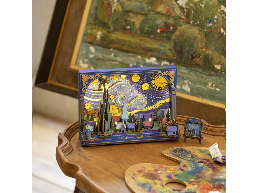 Dřevěná 3D skládačka Hvězdná noc nabízí jedinečný pohled na klidný soumrak z neobvyklé perspektivy. Mohutné mraky se vlní a splývají s noční oblohou nad tichou, spící vesnicí, zatímco hravé mechanické detaily, jako jsou hvězdy a měsíc poháněné ozubenými koly, otočný cypřiš či pohyblivé kolo vozu, dodávají této dřevěné stavebnici život a hloubku. Skládačka slouží jako stylová stolní dekorace s vyměnitelným pozadím, které umožňuje měnit atmosféru a nabízet stále nový vizuální dojem. Jemné dýchající podsvícení v pozadí vytváří hřejivé světlo, které zvýrazňuje detaily celé scény a proměňuje tuto dekoraci v okouzlující noční lampičku. Hvězdná noc vnese do interiéru kouzelnou atmosféru, rozzáří večery a dodá každodennímu prostoru nádech fantazie a barev. Hlavní vlastnosti: 238 dílkůdoba skládání 3 hodinyLED osvětlení2x baterie AAA/LR03/AM4 1,5 V (nejsou součástí balení)nízká obtížnost sestaveníbez použití lepidlavýjimečný a realistický vzhledvhodná jako dekorace na poličku nebo zeďrozvíjí logické a motorické dovednostipodporuje trpělivost dětíideální dárek nebo jedinečná dekorace