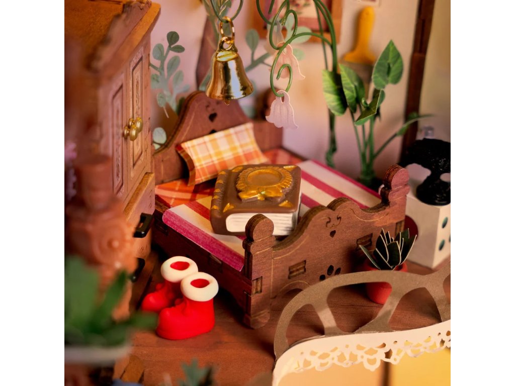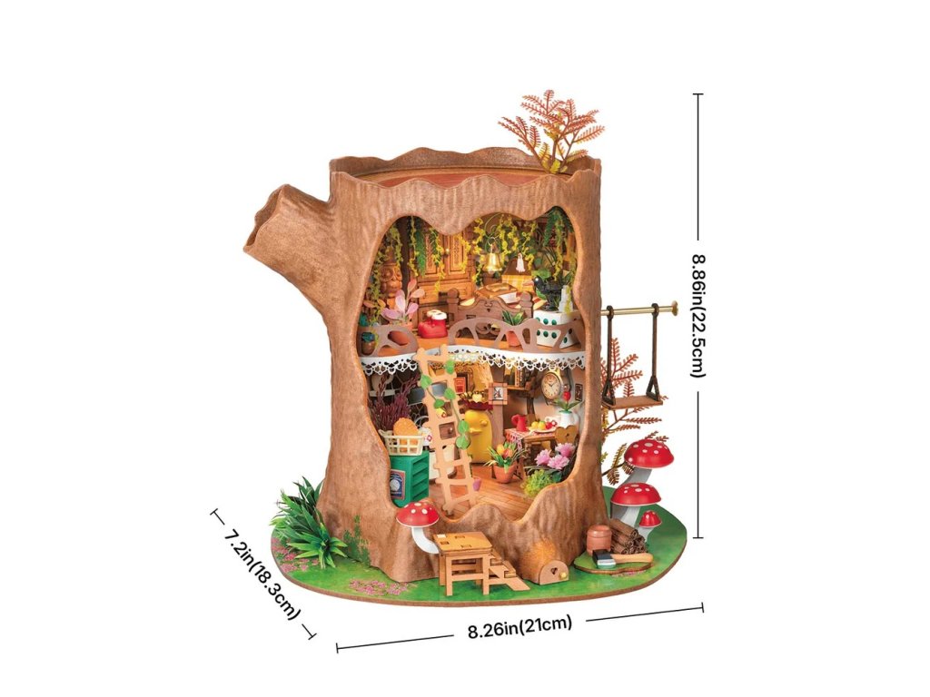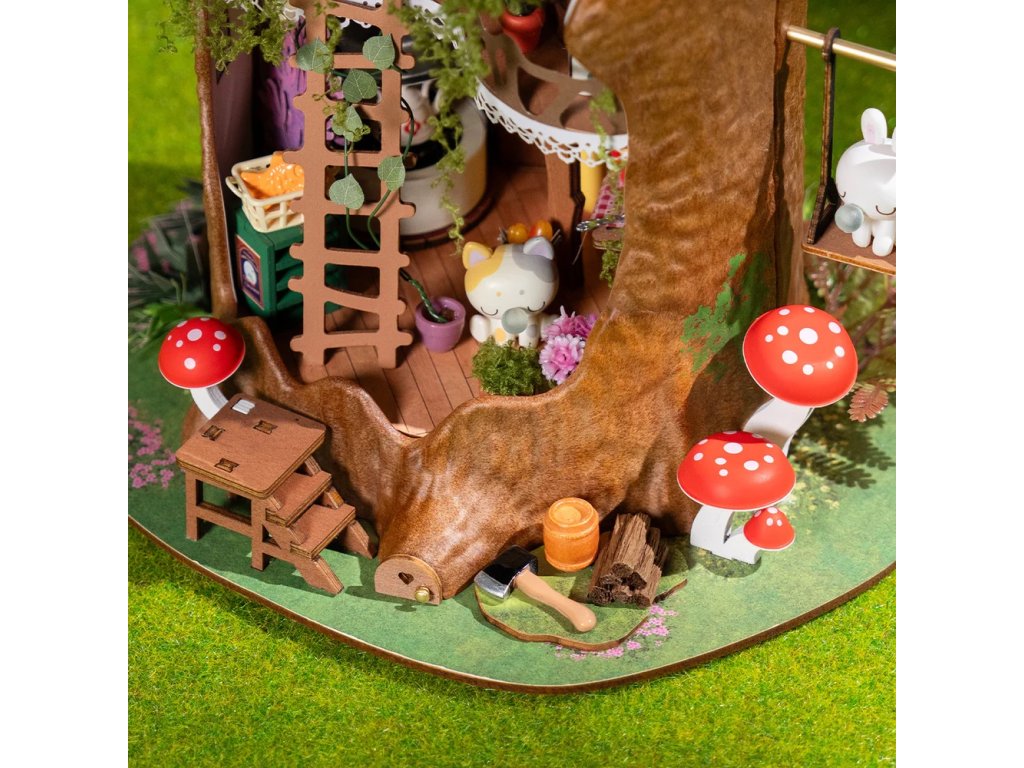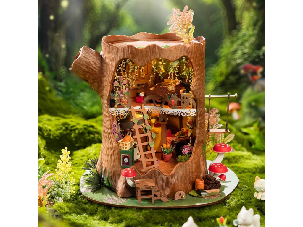 Vstupte do kouzelného lesa, kde v pevném kmeni stromu žijí drobní lesní tvorové. Příroda je jejich hřištěm a zapomenuté lidské drobnosti se v jejich rukou mění v důmyslné vybavení domova. Hluboko v lese se ukrývá malý domek ve stromě, zasazený do srdce starého pařezu. Lesní obyvatelé s neobyčejnou vynalézavostí dávají nový život ztraceným či vyhozeným předmětům lidí - hodinky bez řemínku se promění v nástěnné hodiny, kostky poslouží jako malé stolky a trychtýř se stane digestoří. Tento jednoduchý, ale útulný dvoupatrový domek má vše, co je potřeba k pohodlnému životu. Dřevěný nábytek, příjemnou ložnici, kuchyň s jídelním koutem, spotřebiče, nástěnné dekorace, květináče, houbovou zahrádku a dokonce i houpačku. Co víc si přát, když je příroda vaším sousedem a roztomilost každodenním společníkem. Postavte si tento kouzelný lesní domov, vytvořte jeho příběh a po rozsvícení LED světel proměňte svůj projekt v okouzlující expozici.Tato 3D skládačka je skvělým způsobem, jak si užít kreativní a edukativní hraní a zároveň vytvořit nádherný model s LED osvětlením, který se může stát netradičním dárkem či ozdobou interiéru. Skládání 3D skládačky podporuje rozvoj jemné motoriky, prostorového myšlení a trpělivosti. Pozvěte svou rodinu nebo přátele a užijte si zábavné tvoření bez nutnosti použití lepidla nebo nástrojů. Všechny díly skládačky jsou přesně vyřezané, a lehce do sebe zapadnou, aby výsledek byl stabilní a odolný. Je dodávána v nesloženém stavu, zabalená v krabici s podrobným návodem k sestavení a k napájení slouží 2 AAA/LR03/AM4 1,5 V (nejsou součástí balení). Hlavní vlastnosti: 275 přesných dílkůdoba skládání 8 hodinbez použití lepidlavysoká obtížnost sestavenírozvíjí logické a motorické dovednostipodporuje trpělivost dětíideální jako dárek nebo jedinečná dekoracepodrobný návod k sestavení součástí baleníLED osvětleník napájení slouží 2 baterie AAA/LR03/AM4 1,5 V (nejsou součástí balení)