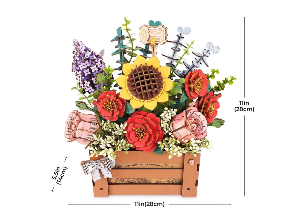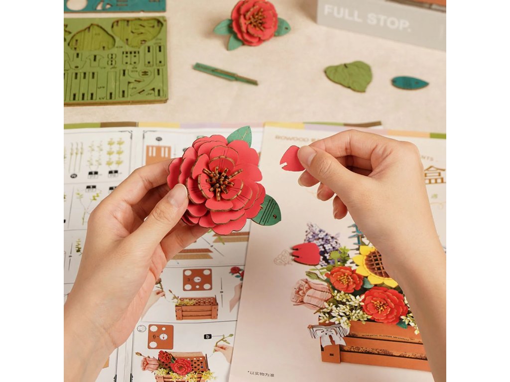 Vytvořte nadčasovou dekoraci nebo netradiční dárek pro všechny milovníky květin. Poskládejte pestrobarevné květiny a naaranžujte je do dřevěného truhlíku. Tyto květiny neuvadnou ani nevyblednou a budou se krásně vyjímat na okně nebo polici. Pestrá kytice se skládá ze slunečnice, růžové růže, červené kamélie, levandule a šeříku a zelených rostlin. Každá květina má symbolický význam: slunečnice vyjadřuje pozitivitu, levandule je uklidňující, červená kamélie zase vášnivá, růžová růže je symbolem vděčnosti. 3D skládačka je skvělý způsob, jak si užít kreativní a edukativní hraní a zároveň vytvořit nádherný model, který se může stát netradičním dárkem či ozdobou interiéru. Skládání 3D skládačky podporuje rozvoj jemné motoriky, prostorového myšlení a trpělivosti. Je to možnost, jak kombinovat zábavu se vzděláváním. Všechny dílky jsou přesně vyřezané laserem a lehce do sebe zapadnou, aby výsledek byl stabilní a odolný. Truhlík je opatřen otvory pro ukotvení květin, aby Vaše aranžmá drželo Vámi vytvořený tvar. Skládačka je dodávána v nesloženém stavu, zabalená v krabici s podrobným návodem k sestavení. Obsah balení: dřevěný truhlík, 1 slunečnice, 1 šeřík, 1 červená kamélie, 1 růžová růže, 1 eukalyptus, 1 levandule, doplňující dekorativní rostliny, mašlička, kartička s možností napsání textu. Hlavní vlastnosti: 658 dílkůdoba skládání 2,5 hodsestavení bez použití lepidlaatraktivní a realistický vzhledvhodné pro děti i dospělérozvíjí logické a motorické dovednostipodporuje trpělivost dětíideální jako dárek nebo jedinečná dekorace
