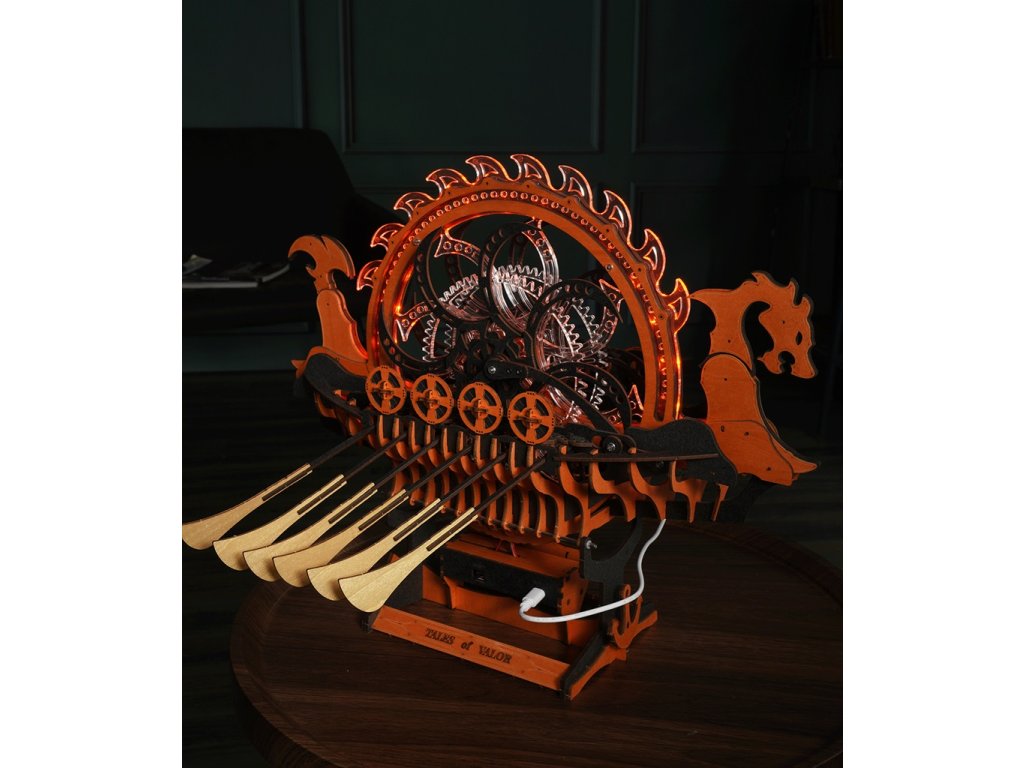 Přeneste se do historie s modelem Dračí lodě inspirovaným starými vikingskými plavidly zvanými drakkar, což znamená drak. Věřilo se, že drak chrání námořníky během plavby. Dlouhá, úzká konstrukce lodí umožňovala rychlost a hbitost v manévrování. Vikingové jsou známí hlavně jako divocí nájezdníci nebo dobyvatelé. Tato složitě navržená plavidla ale odhalují jejich pokročilé dovednosti ve stavbě lodí a jejich schopnost plavit se na obrovské vzdálenosti. Skládačka je vybavena mechanismem, který zajišťuje synchronizovaný rotační pohyb všech vesel. Nad celou lodí prochází prosvětlená plastová dračí páteř, která je výraznější díky třpytivému efektu a syté barvě. Skládačka umožňuje užít si kreativní a edukativní hraní a zároveň vytvořit nádherný model s LED osvětlením, který se může stát netradičním dárkem či ozdobou interiéru. Skládání 3D skládačky podporuje rozvoj jemné motoriky, prostorového myšlení a trpělivosti. Pozvěte svou rodinu nebo přátele a užijte si zábavné tvoření bez nutnosti použití lepidla nebo nástrojů. Všechny díly skládačky jsou přesně vyřezané a očíslované a lehce do sebe zapadnou, aby výsledek byl stabilní a odolný. Skládačka je dodávána v nesloženém stavu, zabalená v krabici s podrobným návodem k sestavení a k napájení slouží USB-C kabel (není součástí balení). Hlavní vlastnosti: 229 dílkůdoba skládání 4 hodstřední obtížnost sestavenírozvíjí logické a motorické dovednostisnadná montáž bez použití lepidla a nástrojůpodporuje trpělivost dětíideální jako dárek nebo jedinečná dekoracepodrobný návod k sestavení součástí balenínapájecí kabel USB-C není součástí baleníLED osvětlení