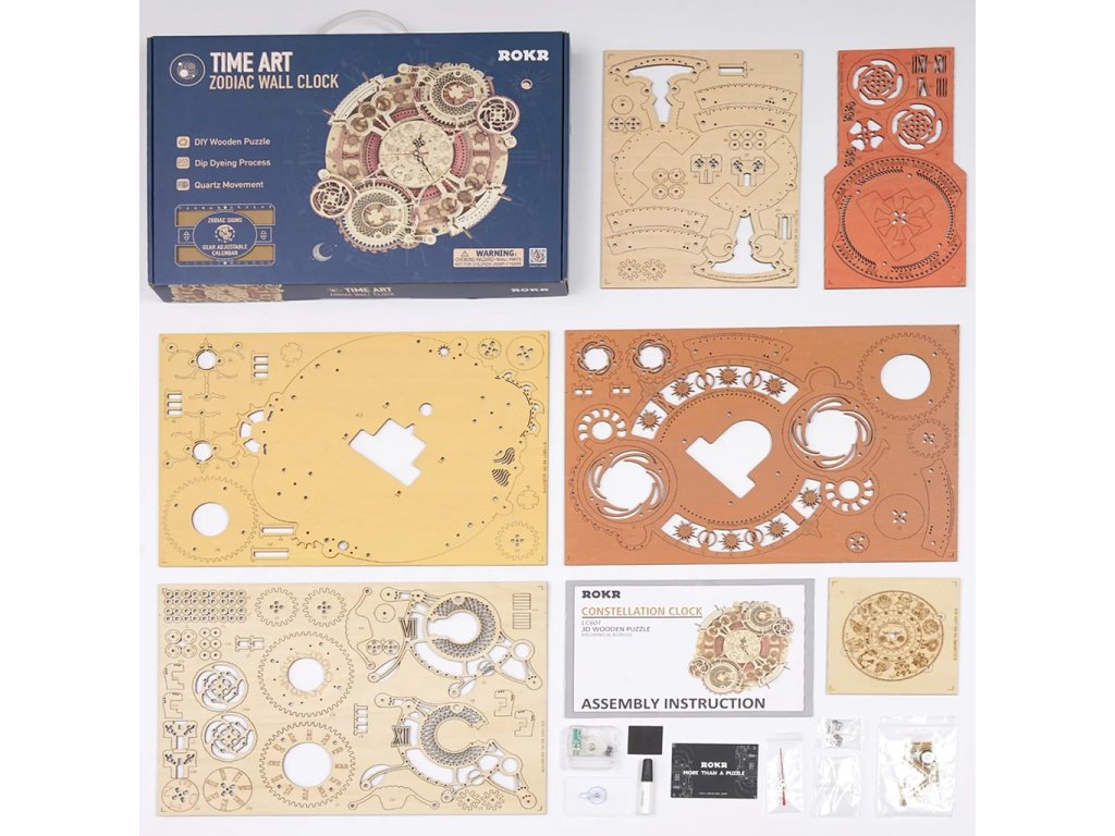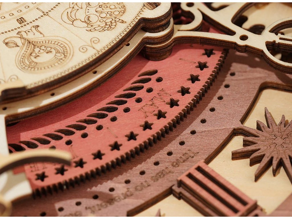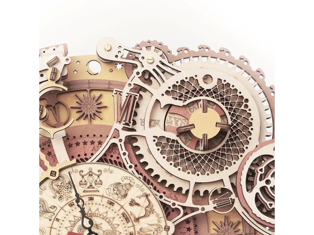 Ztrácíte se v čase? Stavebnice hodin s dekoračním kalendářem z překližky. Inspirováno klasickým filmem Stroj času, navrženo tak, aby detaily přitáhly pozornost všech nadšenců. Hodiny jsou poháněny elektricky, pomocí tužkové baterie. Kalendář slouží jako dekorace zobrazující měsíce a dny. Je obsluhován pomocí čtveřice otočných ovladačů u jednotlivých ukazatelů. Model je určen k zavěšení na zeď a dodává se s dvojicí různých závěsných háčků, s hřebíkem a s přísavkou. Jedinečný dárek pro všechny milovníky kutilství, luxusní interiérová dekorace do pokoje či kanceláře. Skládačka je dodávána v nesloženém stavu, balena v krabici. Vybaveno detailním návodem k sestavení. Hlavní vlastnosti:168 precizně vyřezaných dílkůvysoká obtížnost sestavenínapájeno AA bateriídekorační kalendář zobrazuje:měsíc v roceden v měsíciden v týdnu