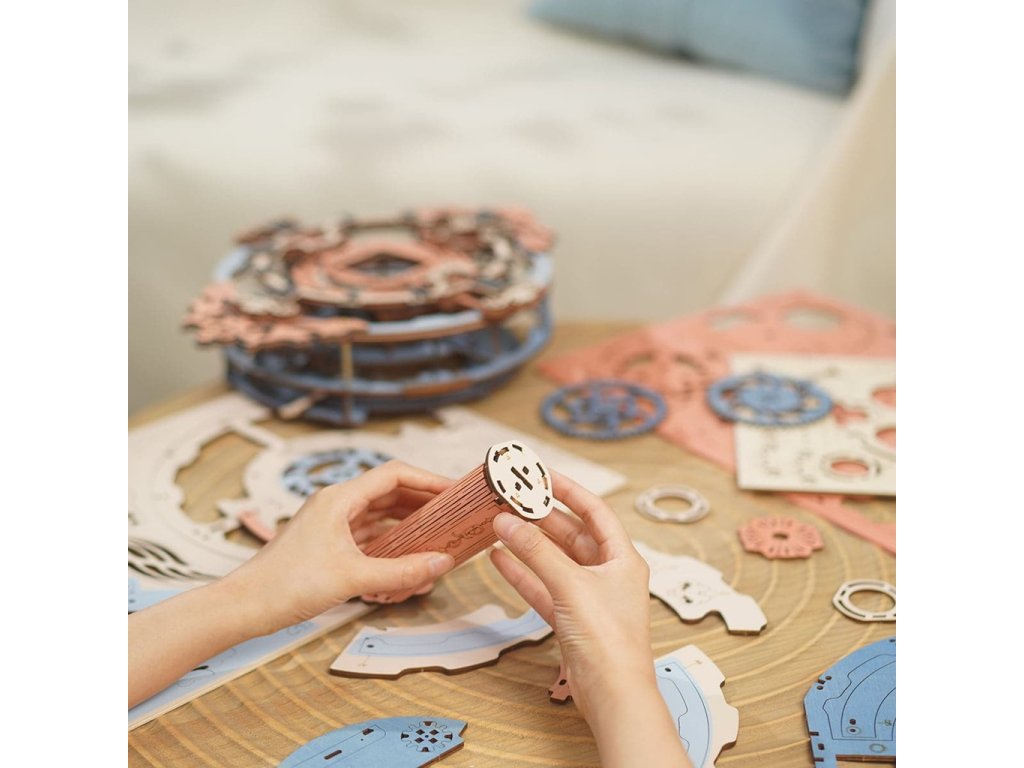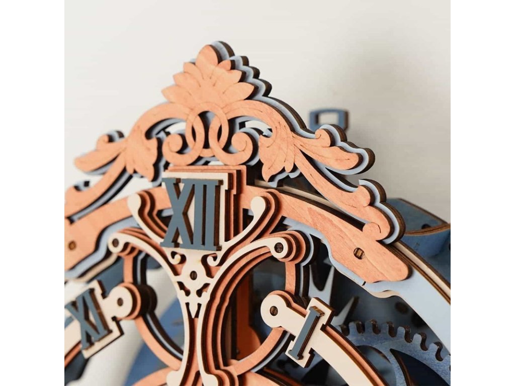 Skládačka nástěnných hodin nabízí hned dvojitou porci zábavy a relaxace. Uvolněte se při sestavování rozměrného ciferníku podrobně zdobeného ornamenty a funkčního krokového mechanismu. Hotové hodiny Vás pak budou moci těšit uklidňujícím tikotem a kmitavým pohybem kyvadla. Pečlivě zvolené barevné schéma kombinující odstíny přírodního dřeva s modrou a oranžovou barvou z nich udělá nepřehlédnutelnou ozdobu Vašeho pokoje. Přesné určování času pro praktičnost zajišťuje nezávislý, bateriově napájený strojek. Nemusíte se proto starat o natahování a mechanismus využívat jen ve chvílích oddechu, k navození atmosféry. Rychlost jeho tikání lze individuálně přizpůsobit úpravou a doplněním závaží, například v podobě mincí. Balení obsahuje spojovací materiál k zavěšení hodin na stěnu, a jejich ciferník lze pak dodatečně natáčet tak, aby byl vždy rovně. Dodáváno v nesloženém stavu, baleno v krabici. Vybaveno detailním návodem k sestavení. Hlavní vlastnosti:nezávislý elektrický hodinový strojek (1×AA baterie není součástí balení)funkční kyvadlový mechanismus231 precizně vyřezaných dílkůstřední obtížnost sestavení